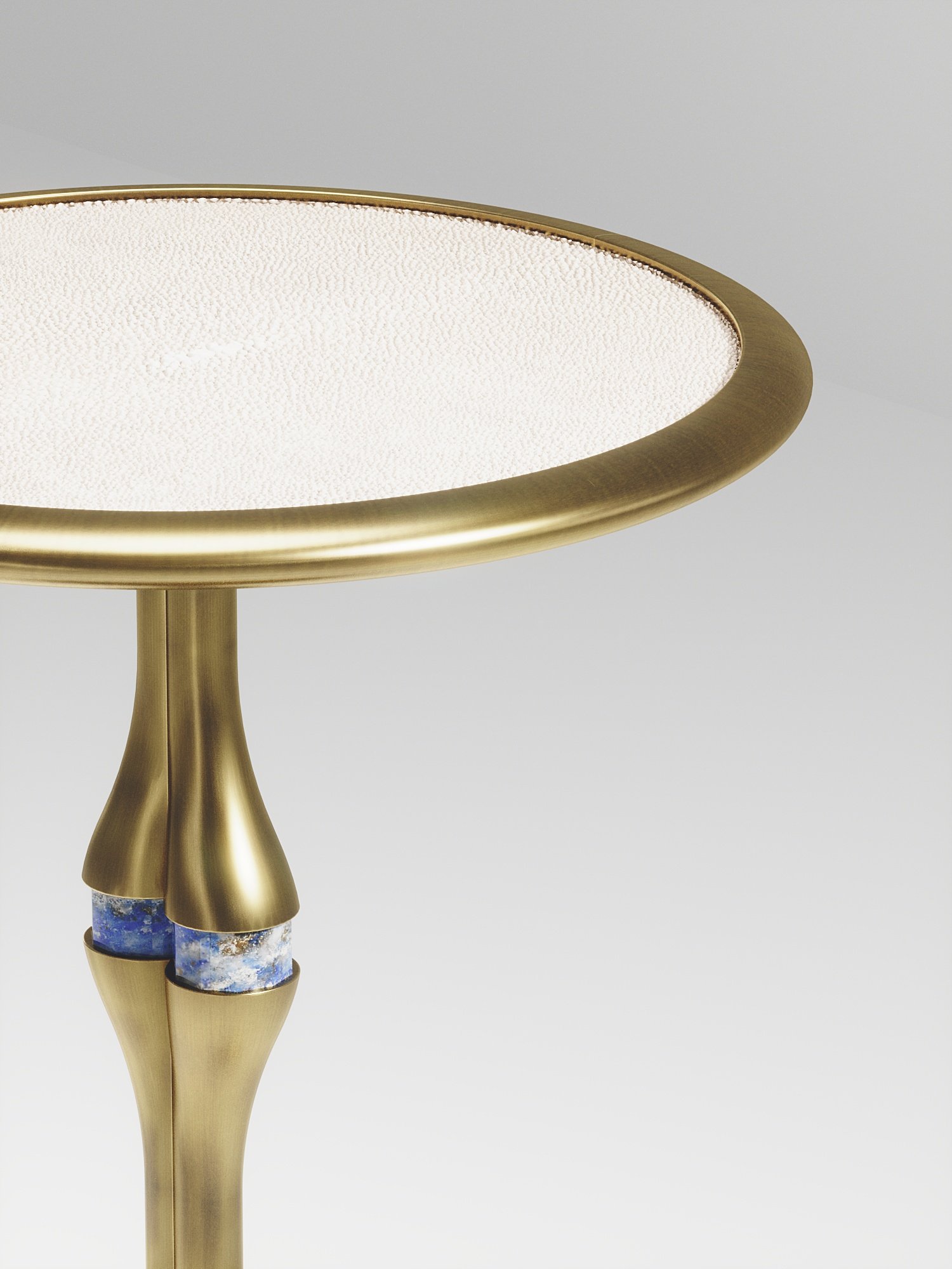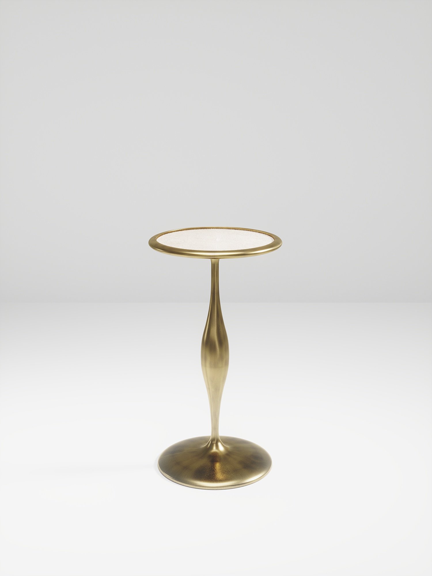 The Frequency side table II by R & Y Augousti is a sleek piece with a vintage-modern feel. The piece explores fluid organic lines with subtle detailing to create the signature Augousti aesthetic. The piece is inlaid in a mixture of cream shagreen and bronze patina brass.