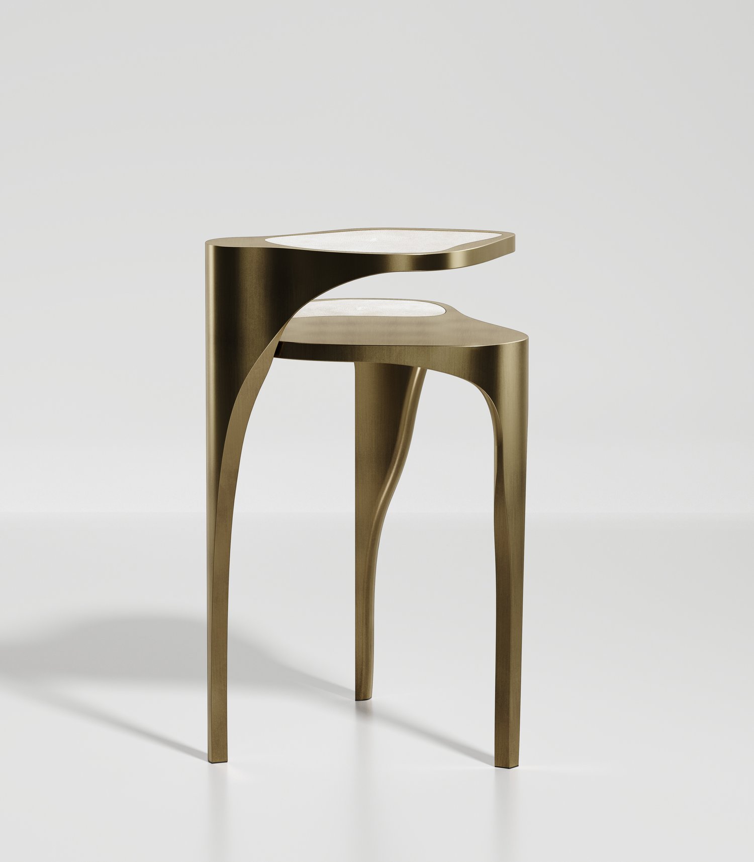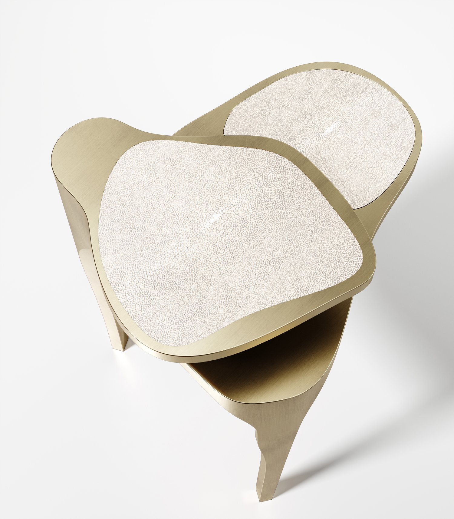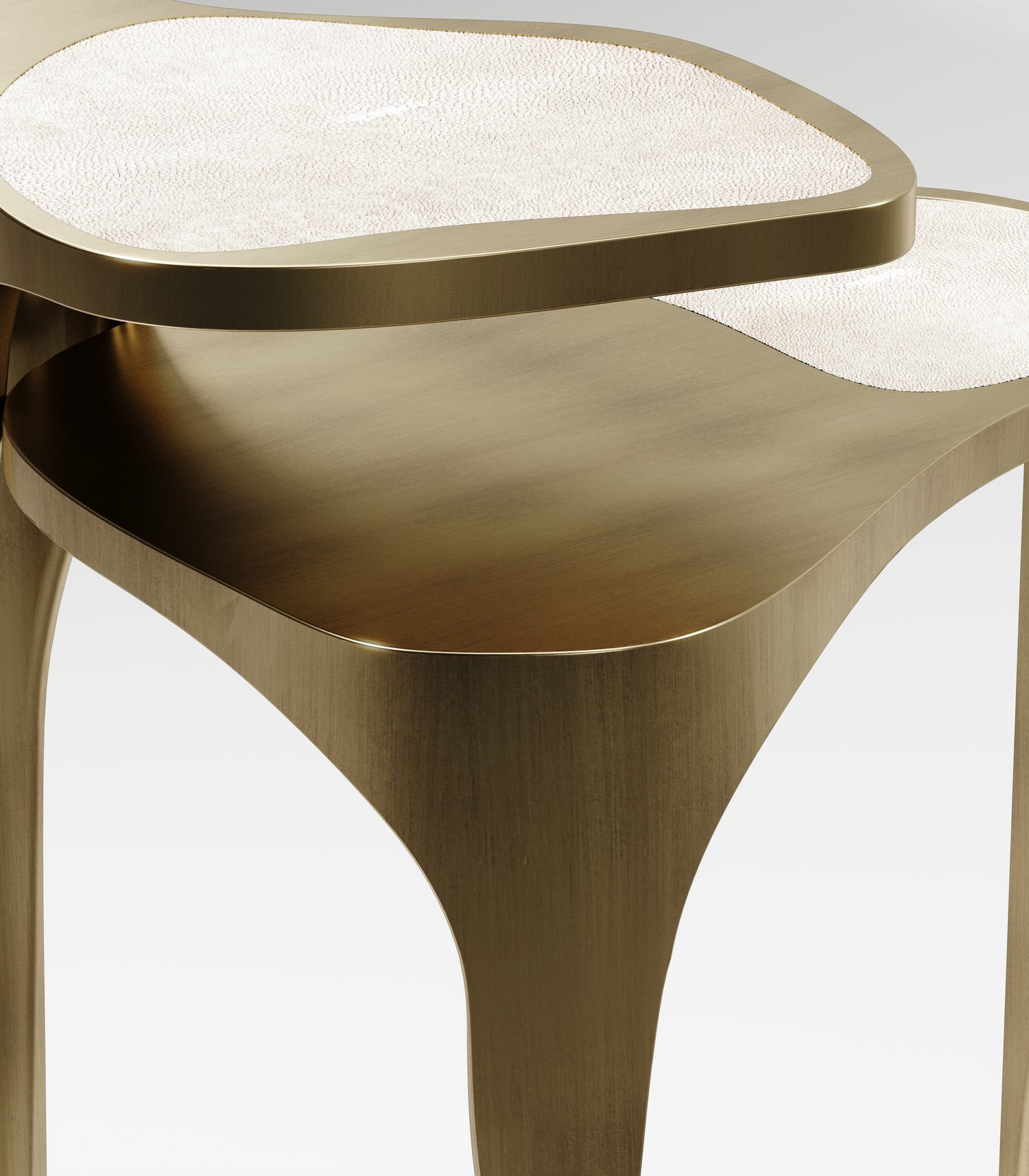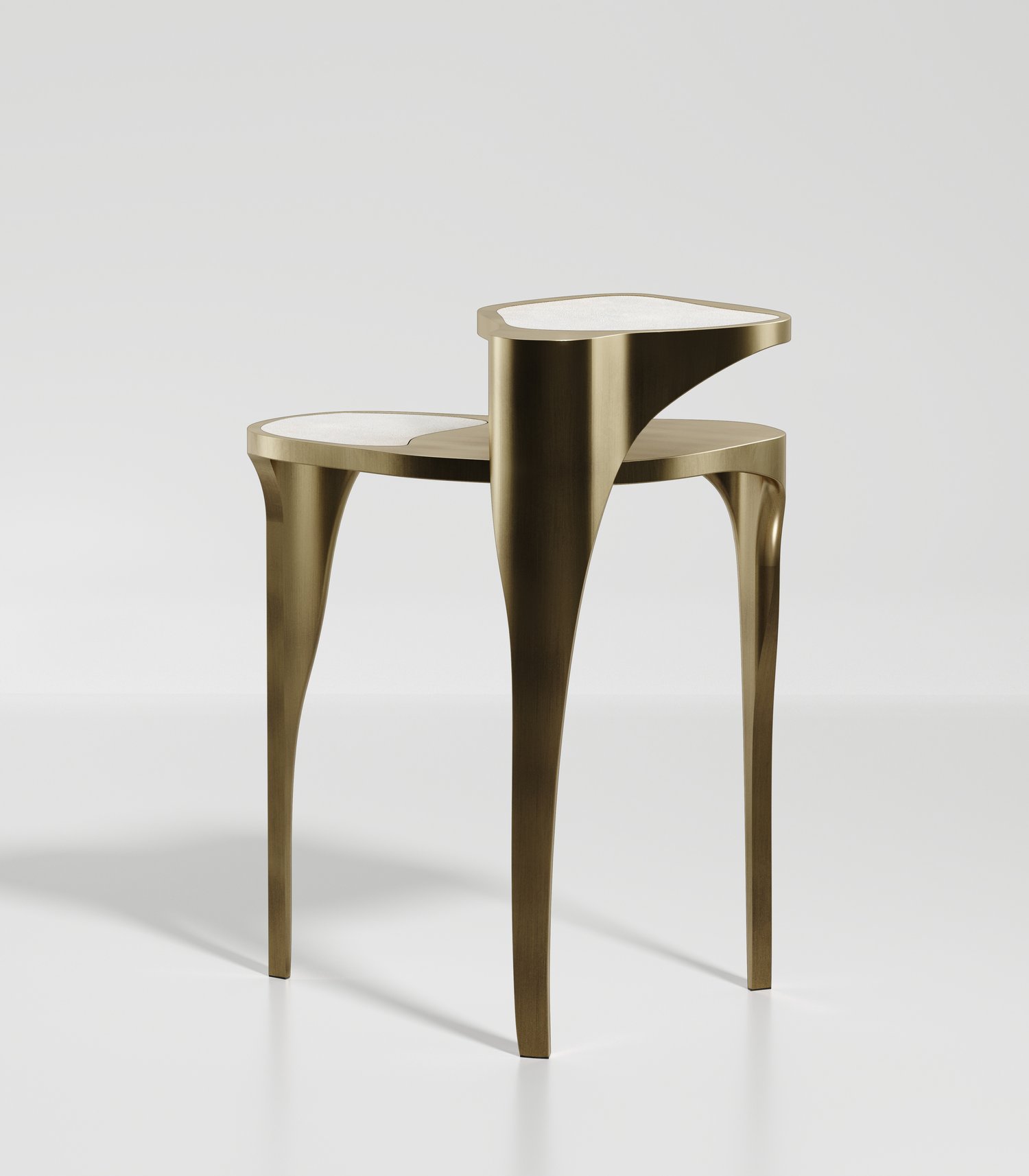 The Ginko side table by R & Y Augousti is an elegant and versatile piece. The piece is both sculptural and graphic with its organic shape and floating two top detail. The piece is inlaid in a mixture of cream shagreen and bronze patina brass. Part of the Ginko capsule.