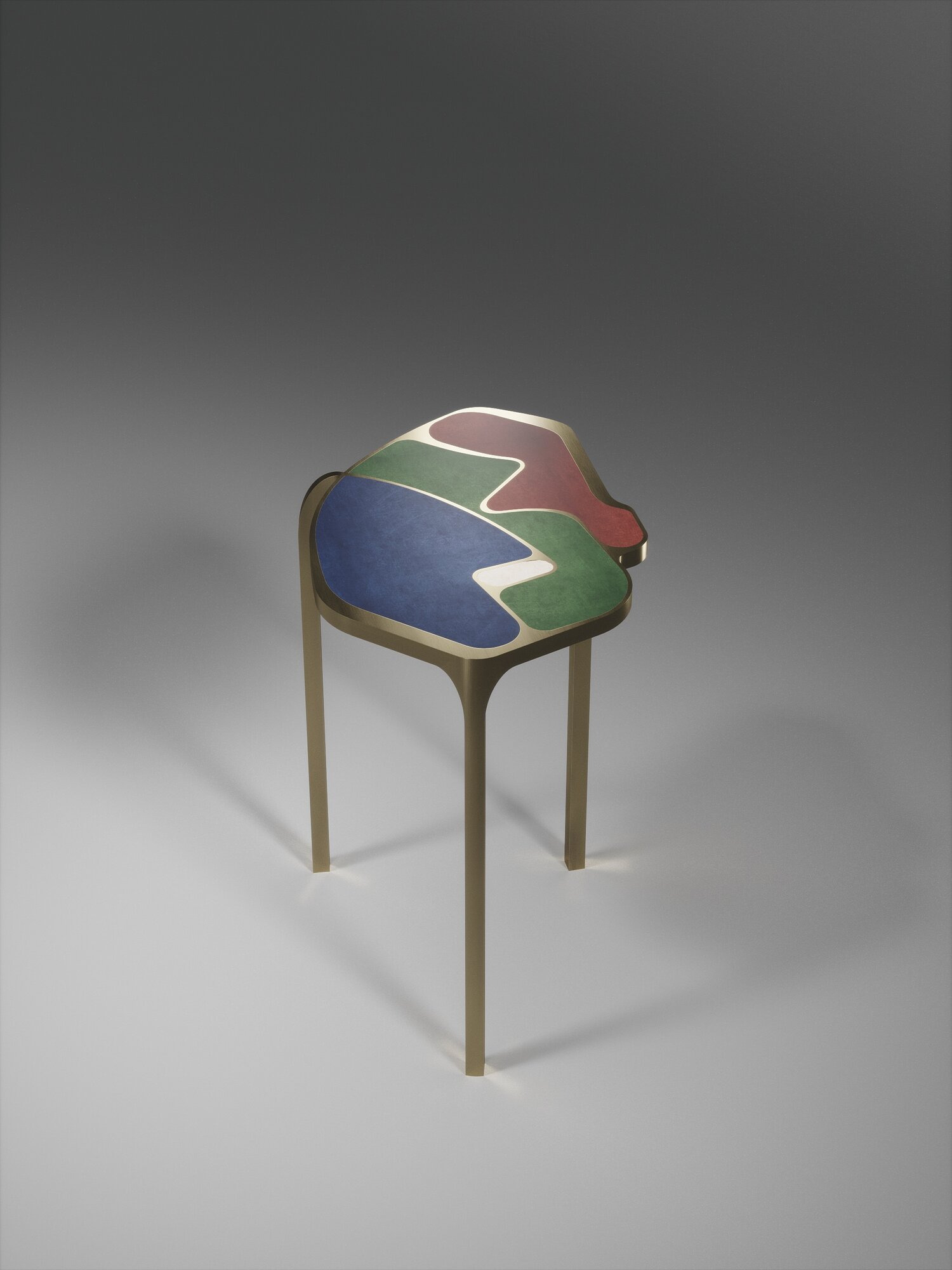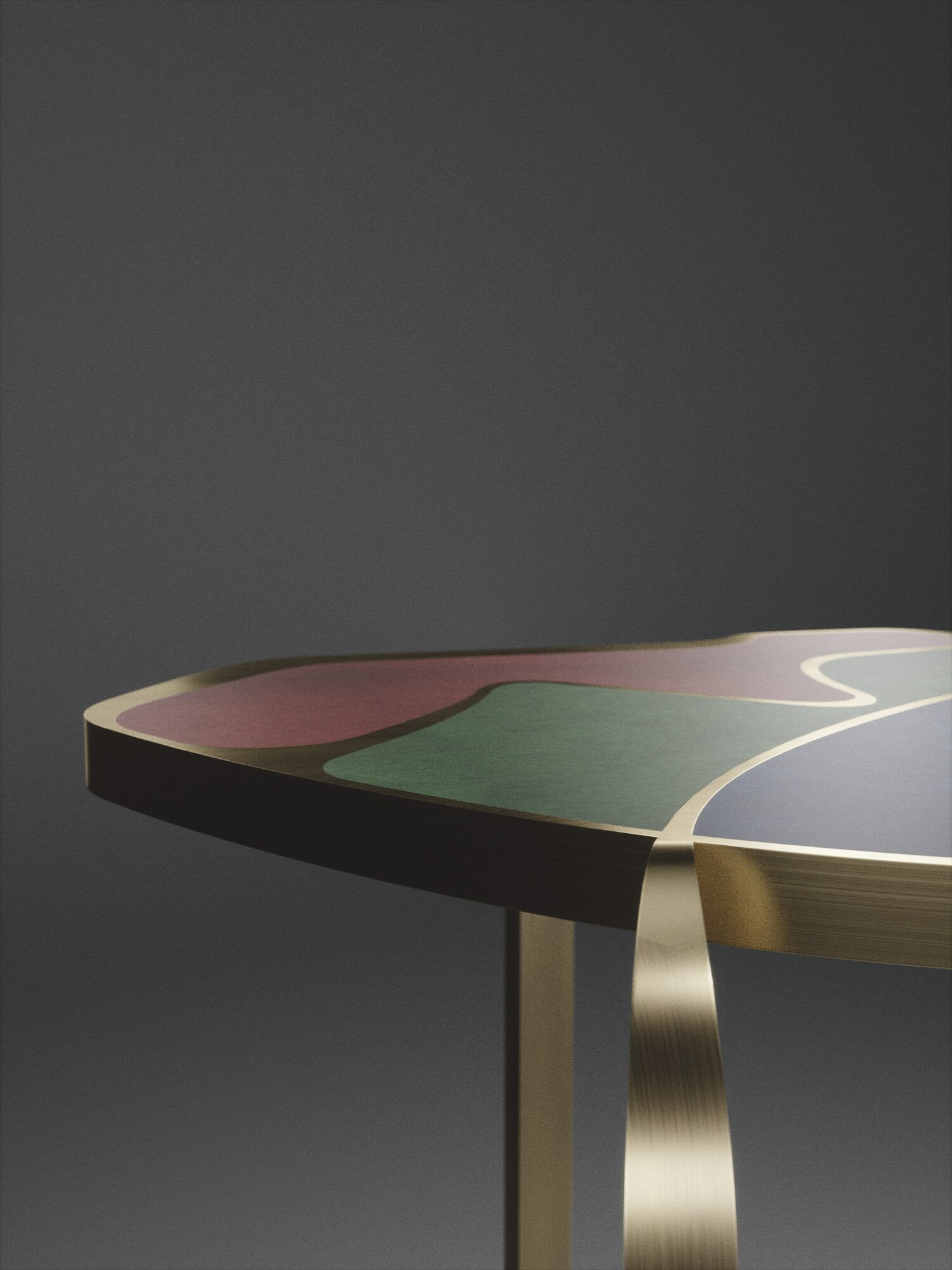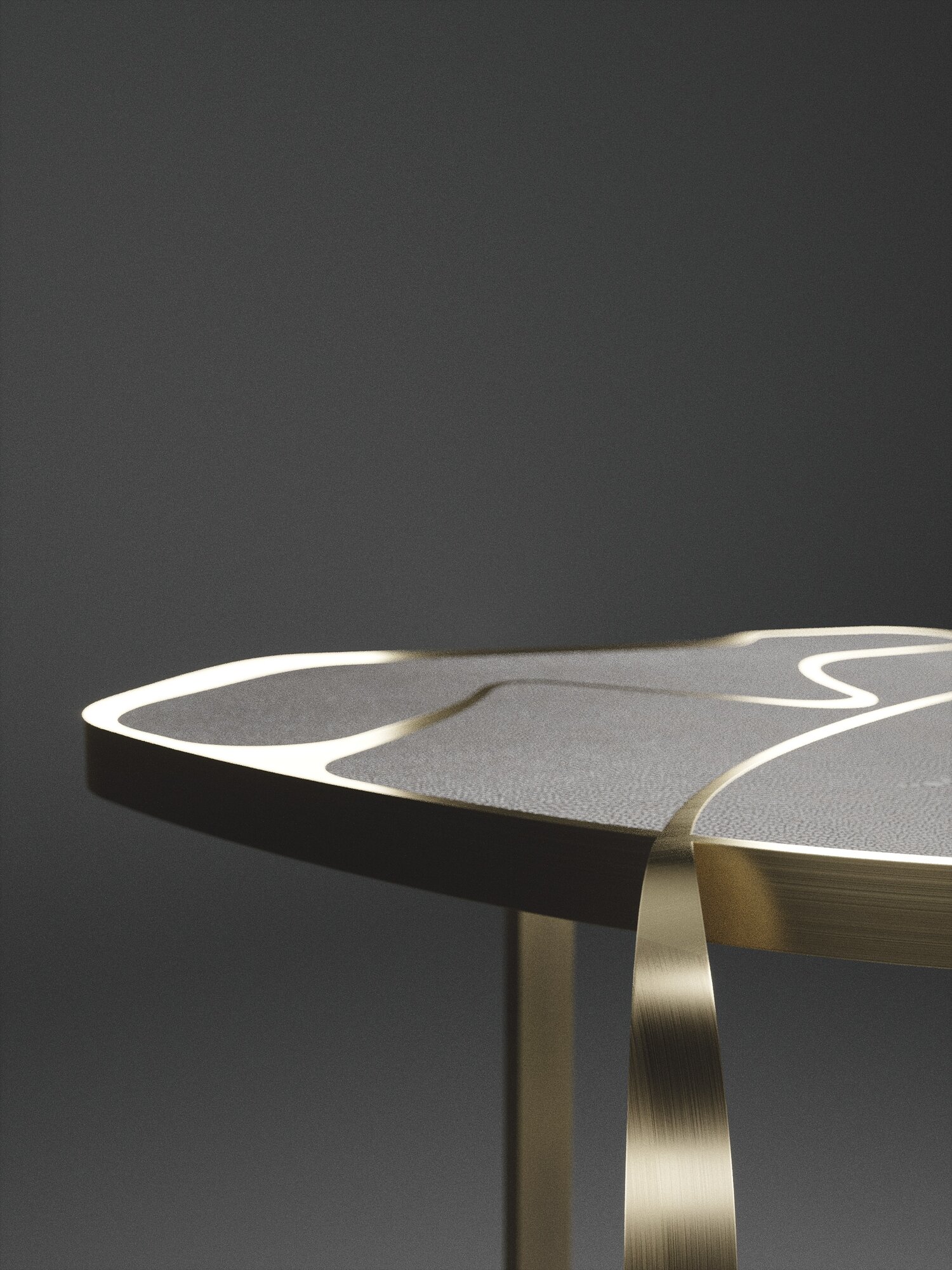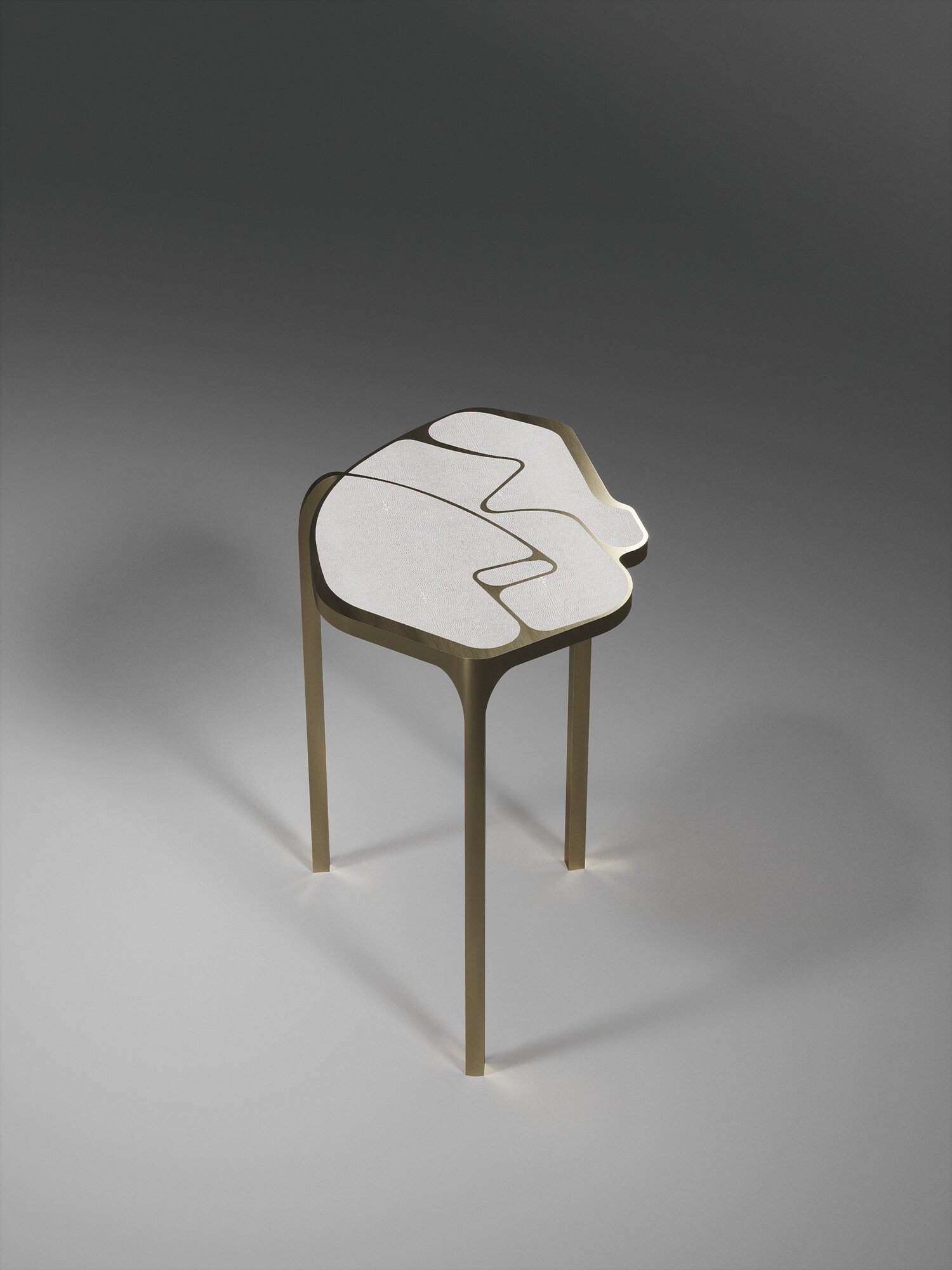 The Cocteau side table by R & Y Augousti is a truly one of a kind piece. The sculptural and ethereal piece has abstract forms, shapes and figures within it that one could interpret in different ways. The bronze-patina brass inserts in the cream shagreen inlaid surface "melt" organically into the floating frame and base to create this overall beautiful amorphous shape.