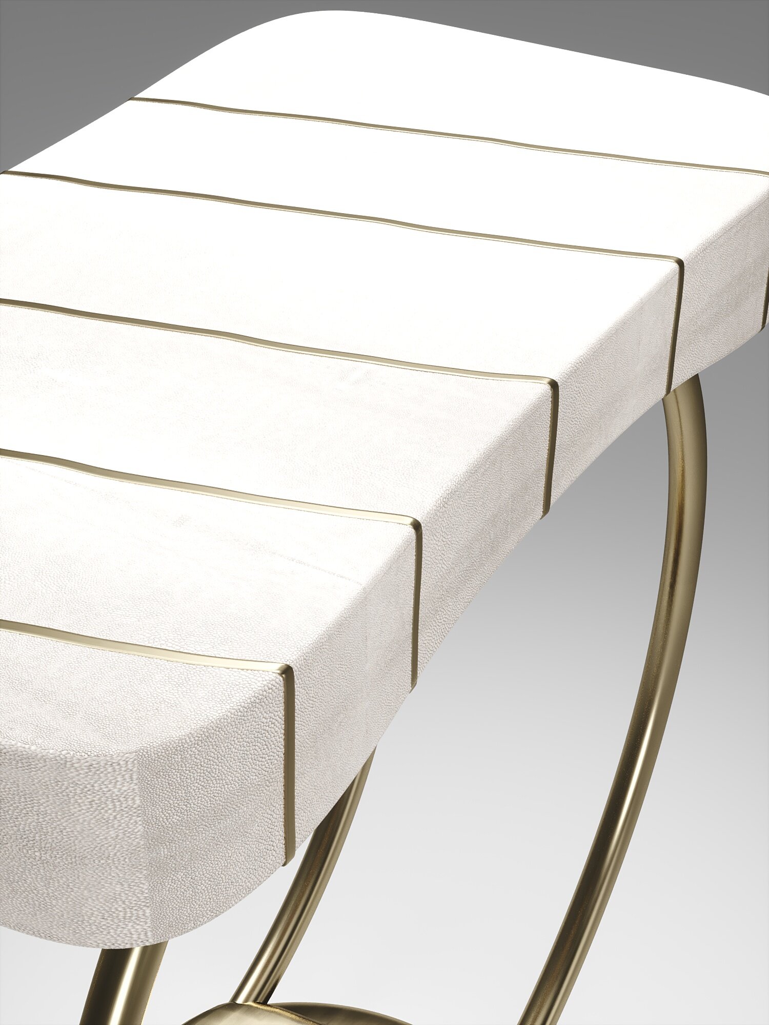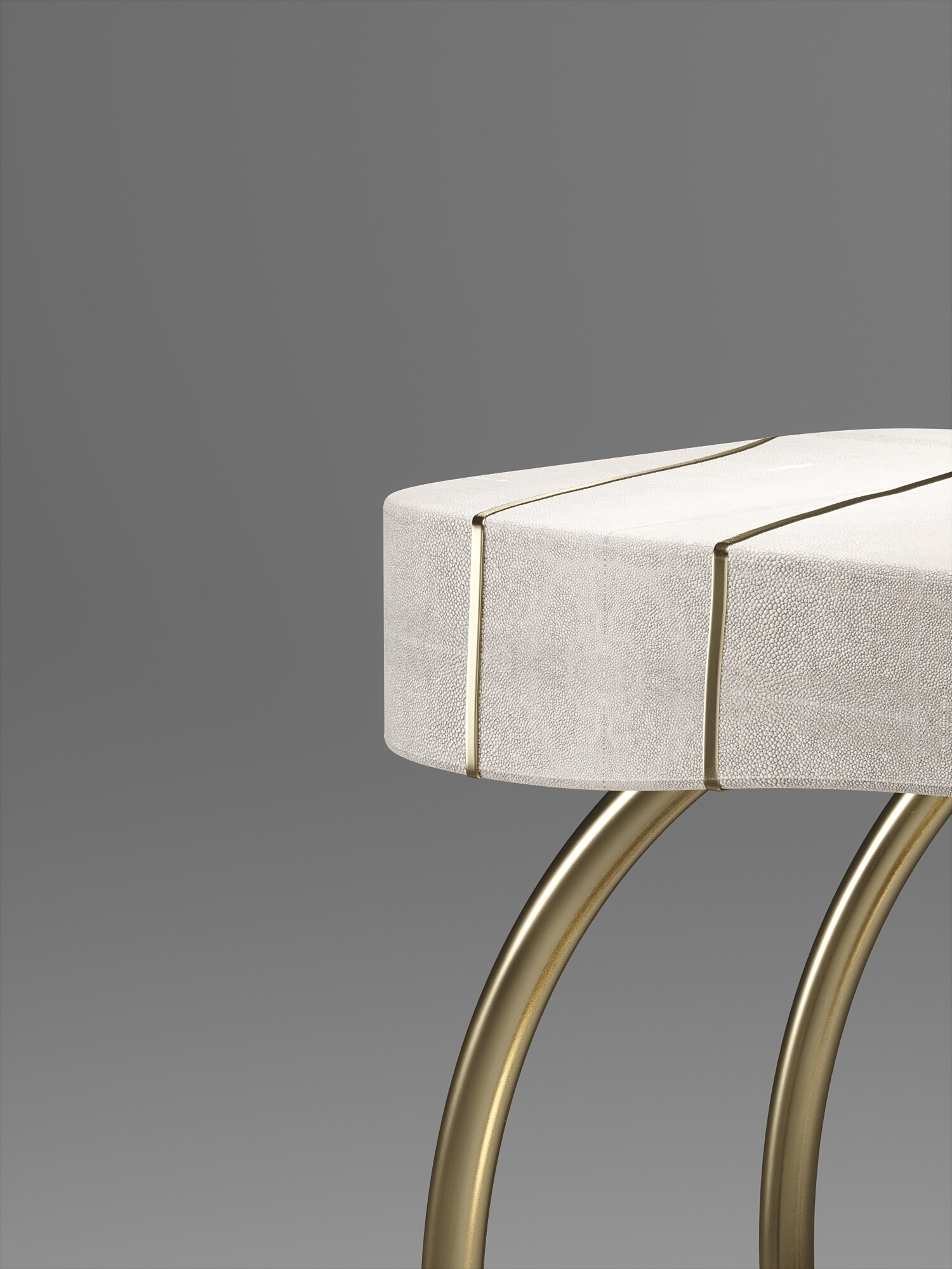 The Melting Ring side table by R&Y Augousti inlaid in cream shagreen is an elegant and sculptural piece for your home. The rectangle top has the iconic melting pattern of Augousti that is slightly in relief from the shagreen surface, and sits on the jewelry-inspired bronze-patina brass structure.