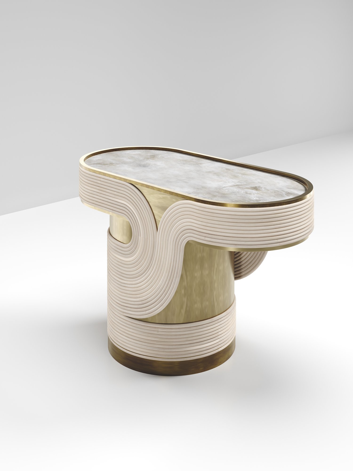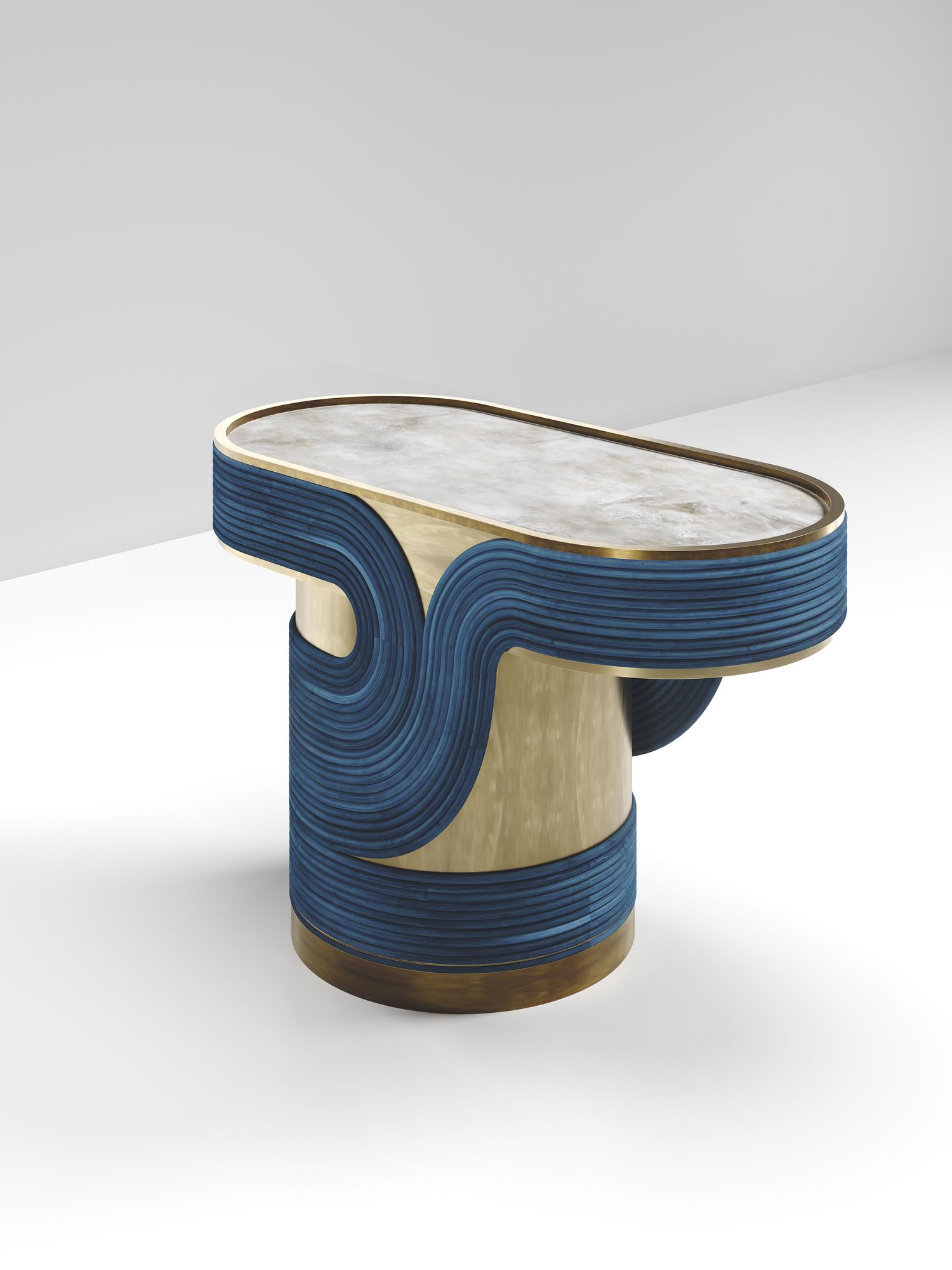 The Licol Side table by R & Y Augousti is a part of their new Rattan capsule launch. The piece explores the brand's iconic DNA of bringing old world artisanal craft into a contemporary and utterly luxury feel. This table is done in a cream rattan finish, with a smokey white quartz inlaid top and bronze patina brass details. Available in other finishes. Part of the Augousti Rattan capsule, see images of the collection at end of slide. Custom sizing/finishing on request.