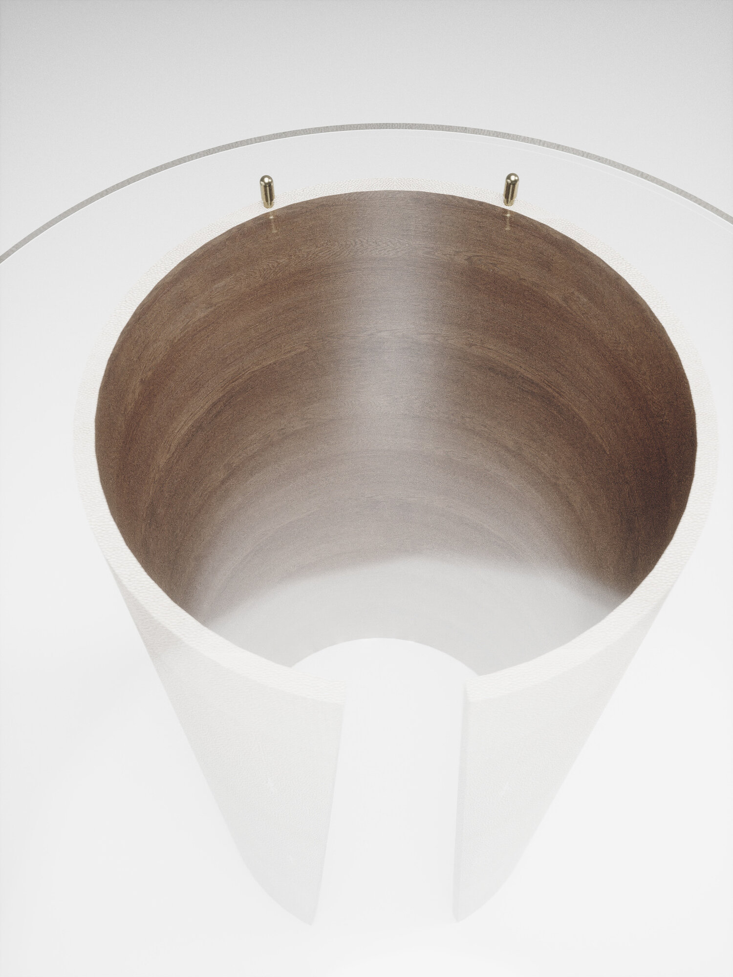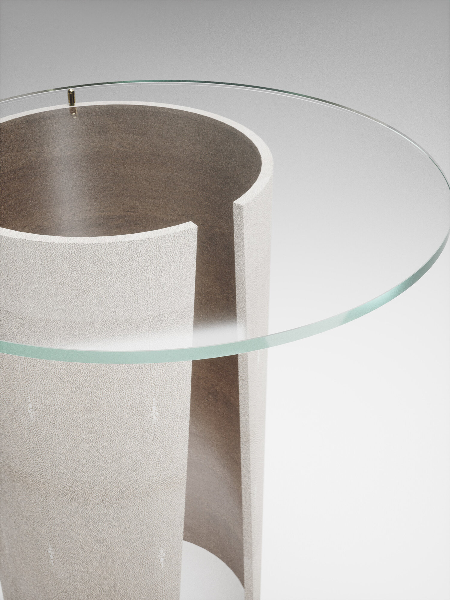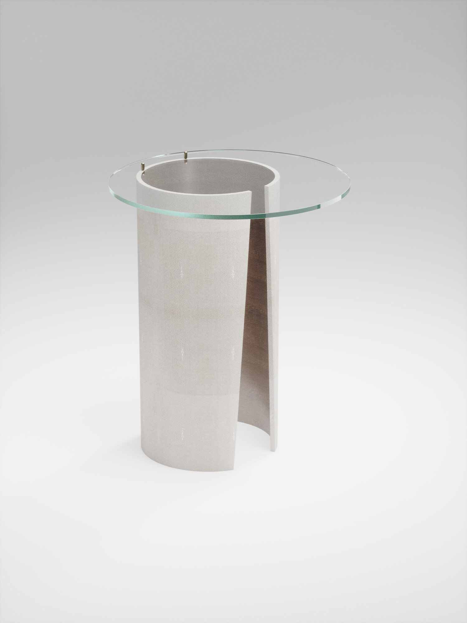 The Wrap side table by R&Y Augousti inlaid in cream shagreen with a glass top is an elegant and classic piece for your home. The round glass top sits on the asymmetrical cream shagreen inlaid base and is fastened together with discreet bronze-patina brass parts. The interior of the base is inlaid in gemelina wood veneer.
