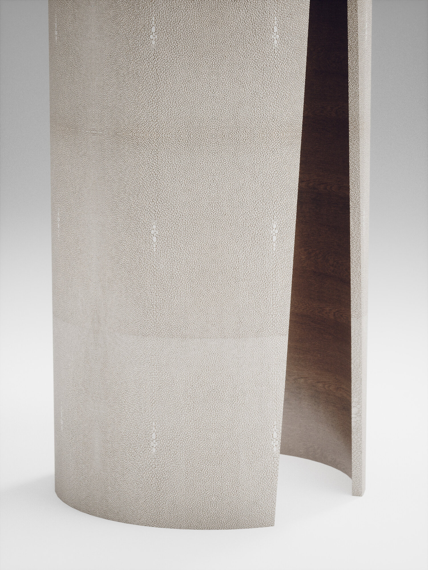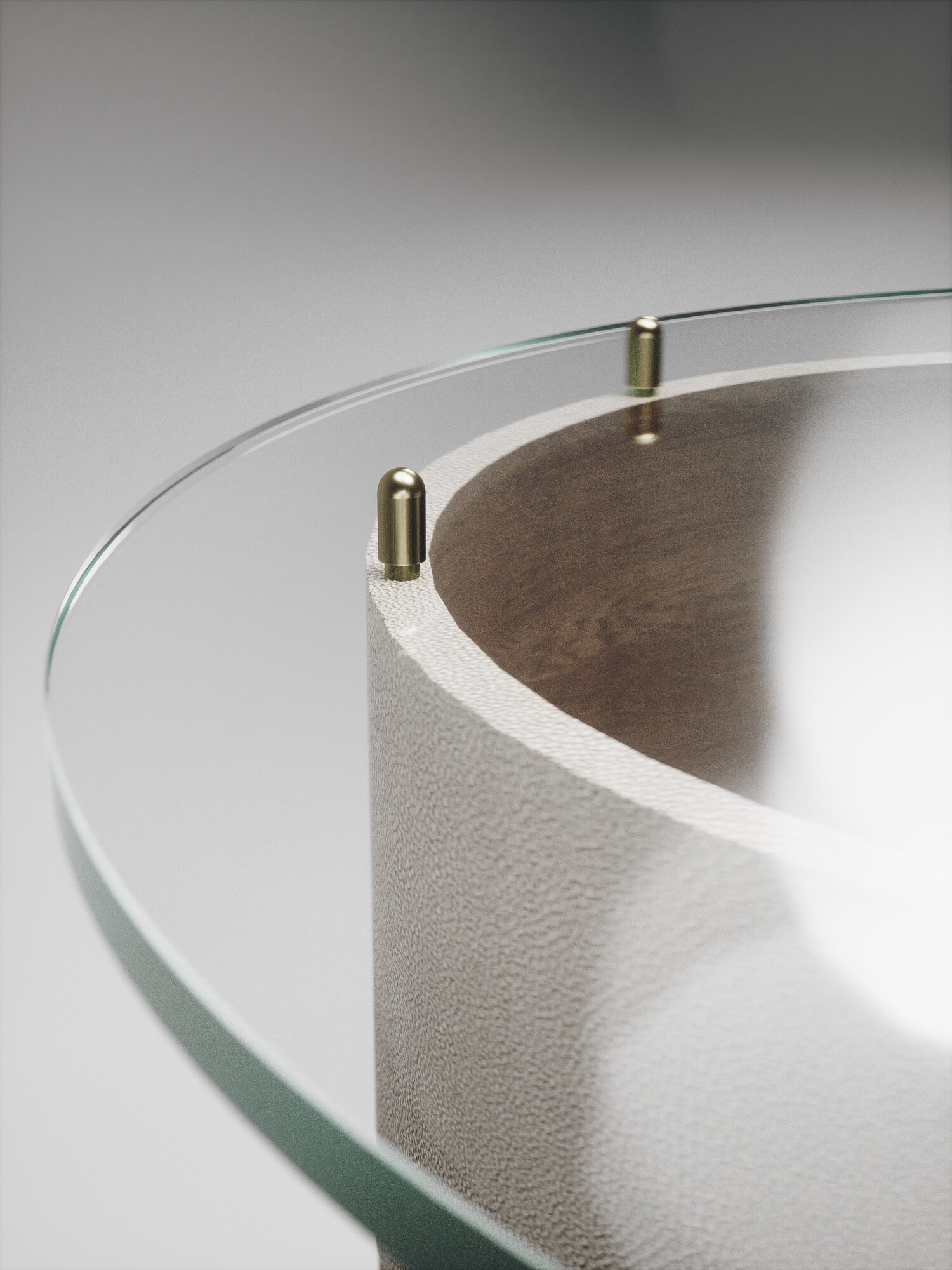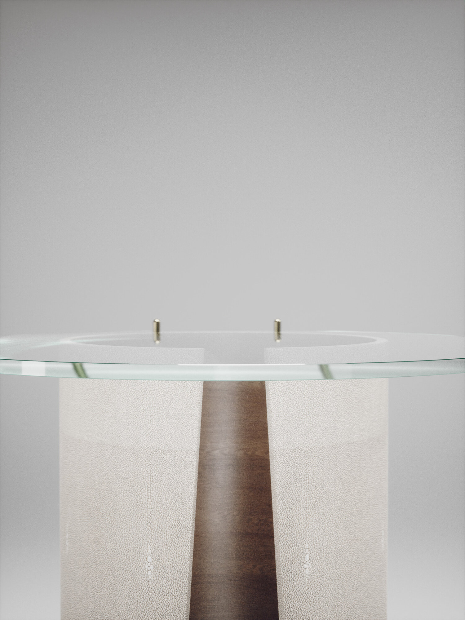 The Wrap side table by R&Y Augousti inlaid in cream shagreen with a glass top is an elegant and classic piece for your home. The round glass top sits on the asymmetrical cream shagreen inlaid base and is fastened together with discreet bronze-patina brass parts. The interior of the base is inlaid in gemelina wood veneer.