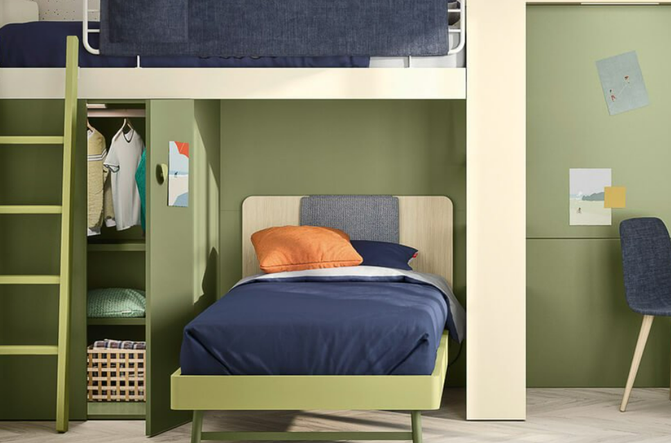 Con i suoi fianchi sagomati più larghi alla base, il ponte Tippy accoglie un letto, uno scrittoio o entrambi. E grazie al meccanismo, lo scrittoio lascia spazio al secondo letto senza dover spostare nulla.