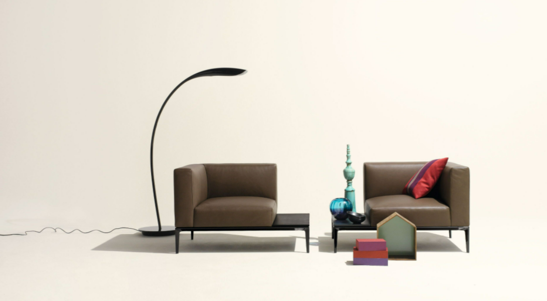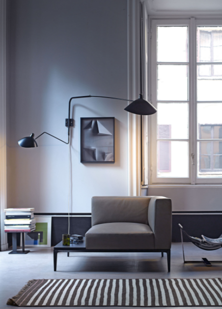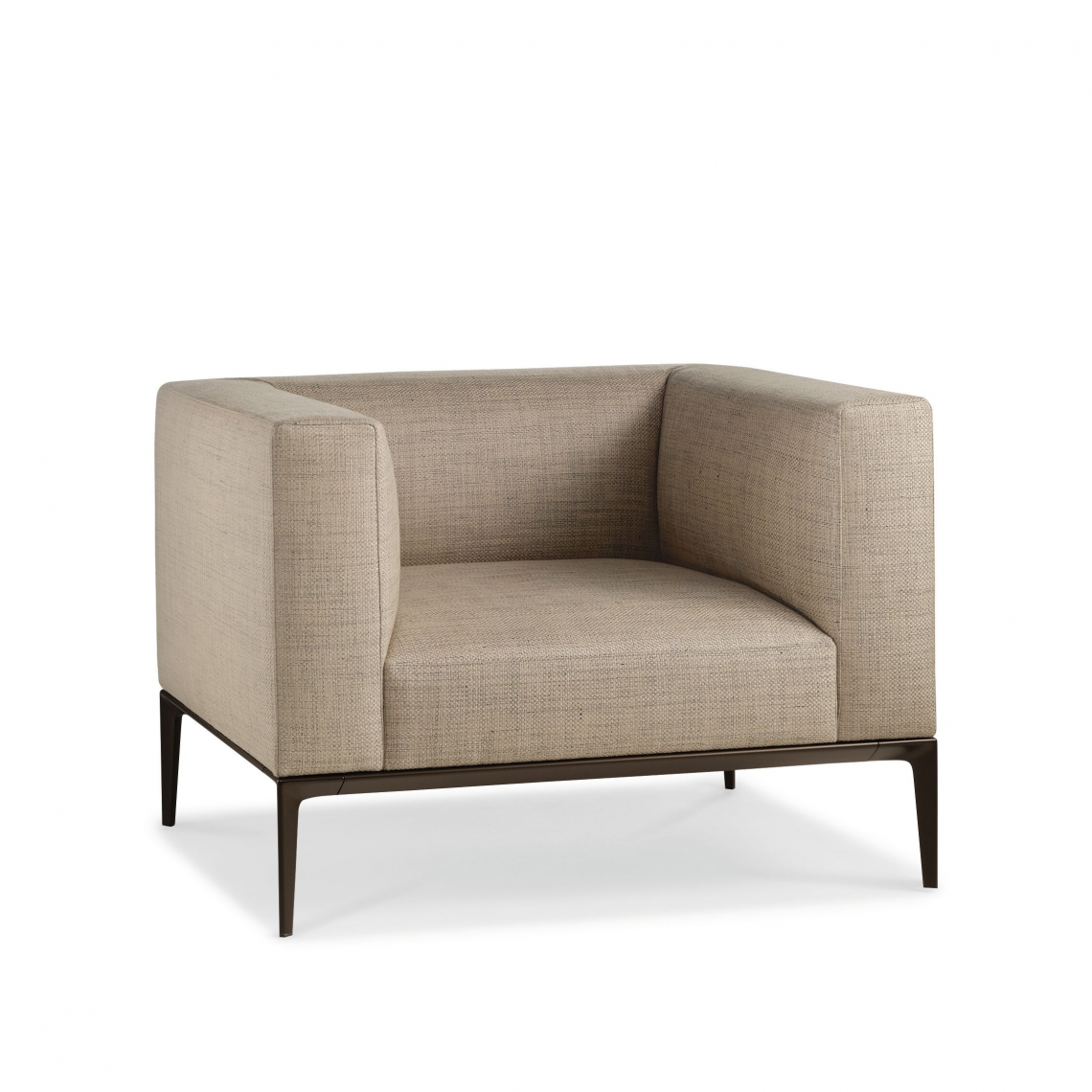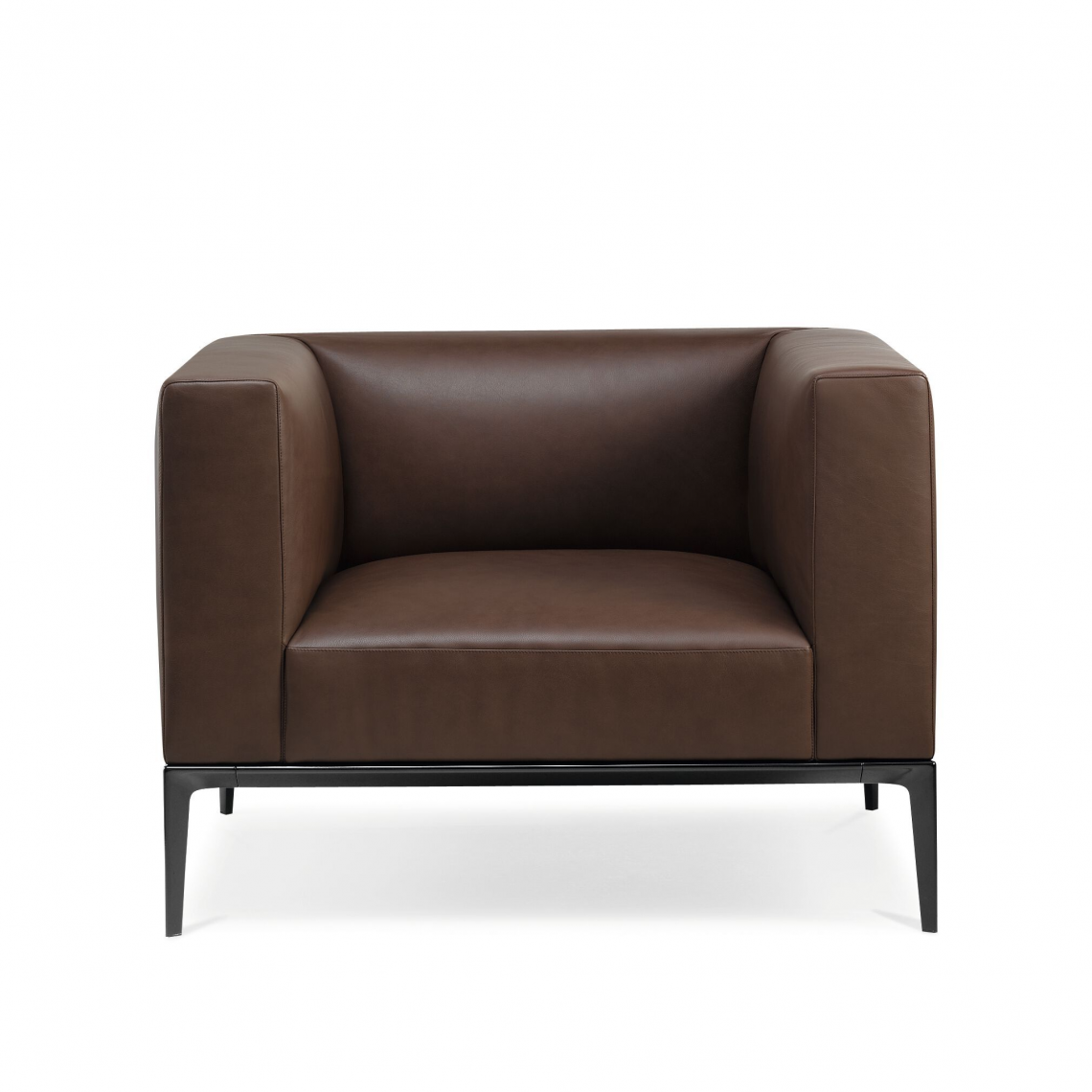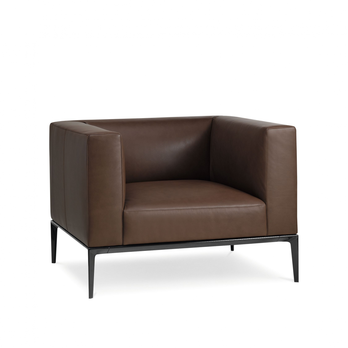 The compact spatial dimensions of the solidly upholstered chair are poised on delicate feet. The fine felled seams are a sign of expert craftsmanship. The chair-chaise longue can be fitted with side shelves. Excellent design for two worlds: private and public.