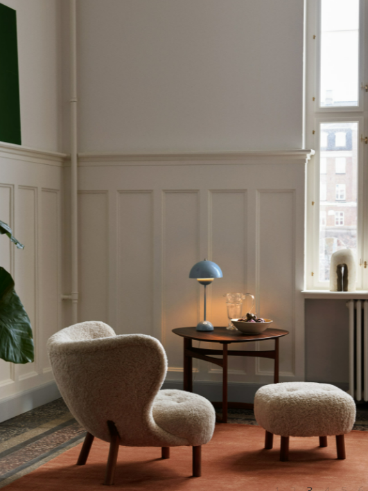 Veneer sheets formpressed together towards a solid wood insert. Milled into shape and lacquered. Natural Rattan weaved around a powder coated stainless steel frame.