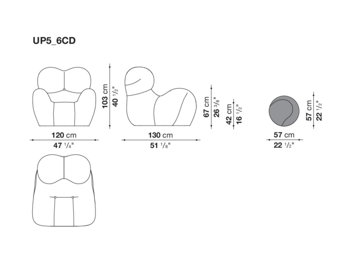 UP系列設計于1969年,它從一開始就是最為突出的設計表達,采用彈性面料作為飾面,造型極具表現力。組成該系列的七件產品包括扶手椅和厚圓椅墊UP5_6,這是現代性的標志,隱喻擁有舒適子宮(comfortable womb)卻依然受到禁錮的女性。這個無與倫比的設計標志目前有一個初級版本,除了體積小于原版之外,其他都是完全相同的。這是為3歲以上兒童設計的。