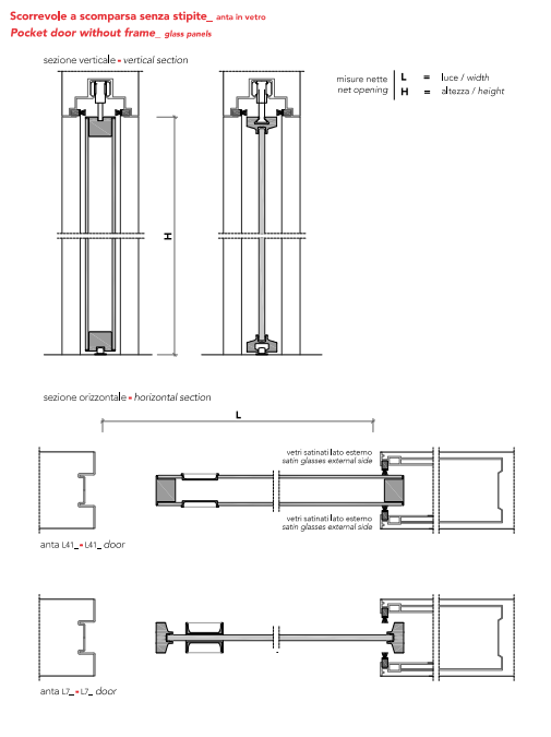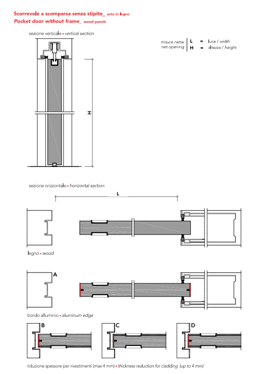 Wood pocket door, or glass door with aluminum frame, 41 mm thickness.