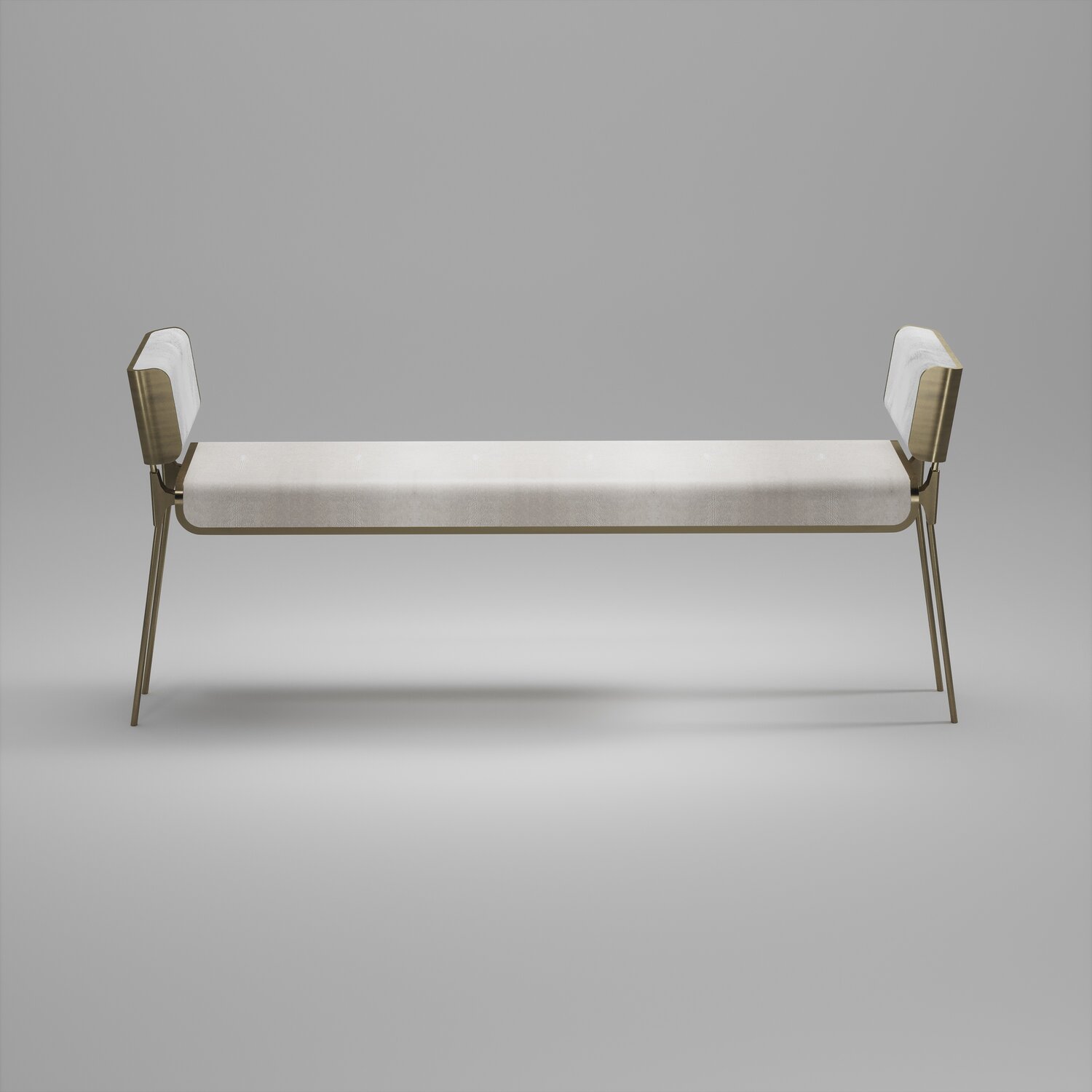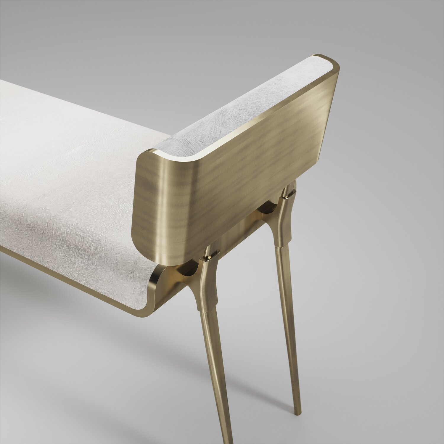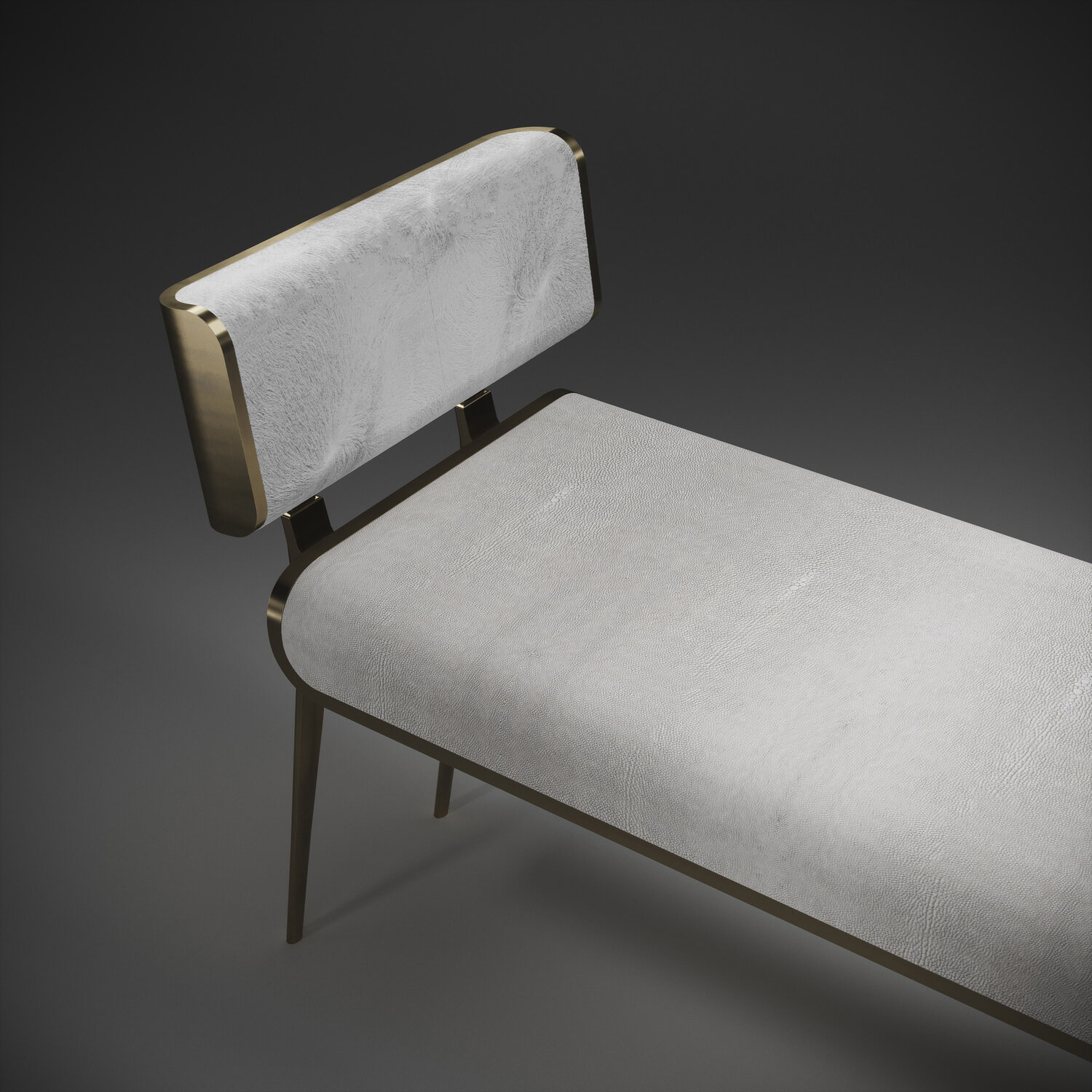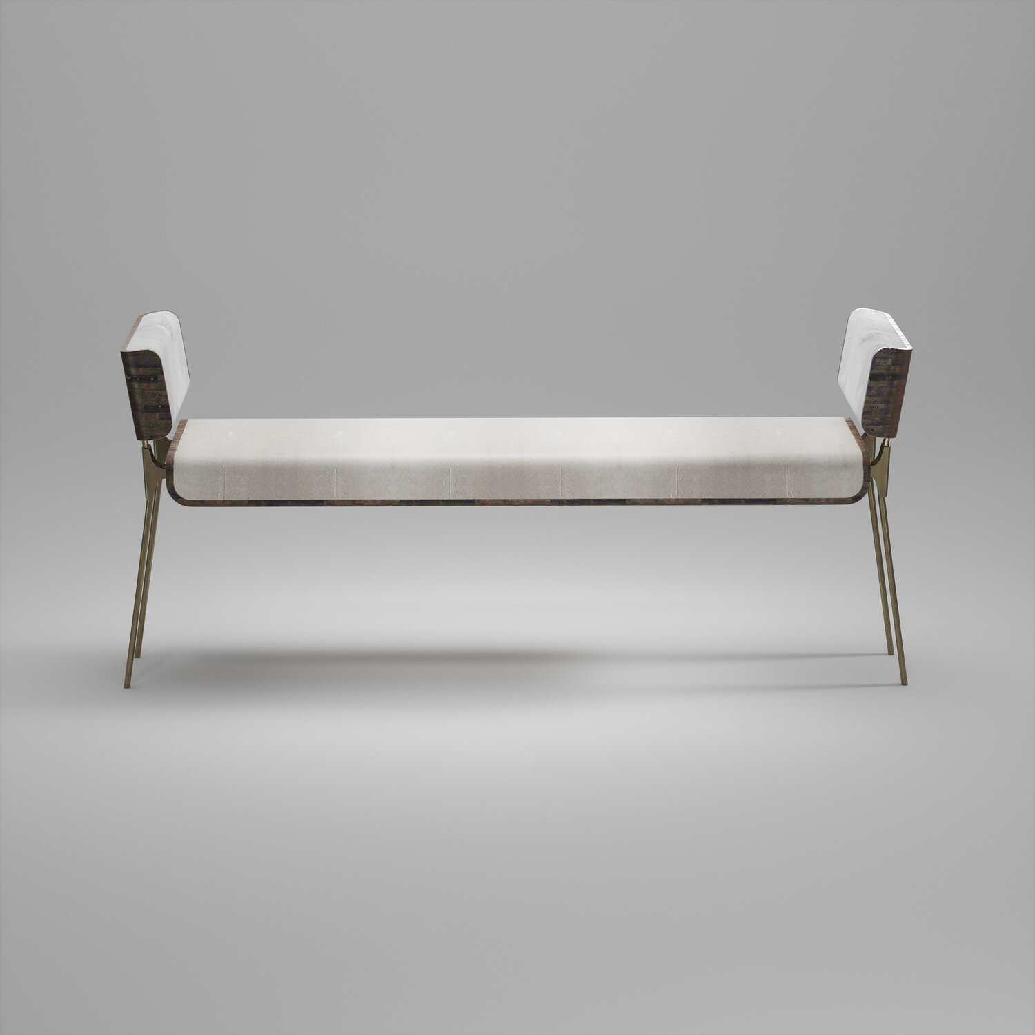 Inspired by the original Dandy bench by Kifu Paris, the Dandy II Entrance Bench is the ultimate luxury seating. The seating area is inlaid in cream shagreen and the frame, legs and sides of the bench are completely inlaid in bronze-patina brass. On the left and right side of the bench both armrests are in upholstered with white vachette.