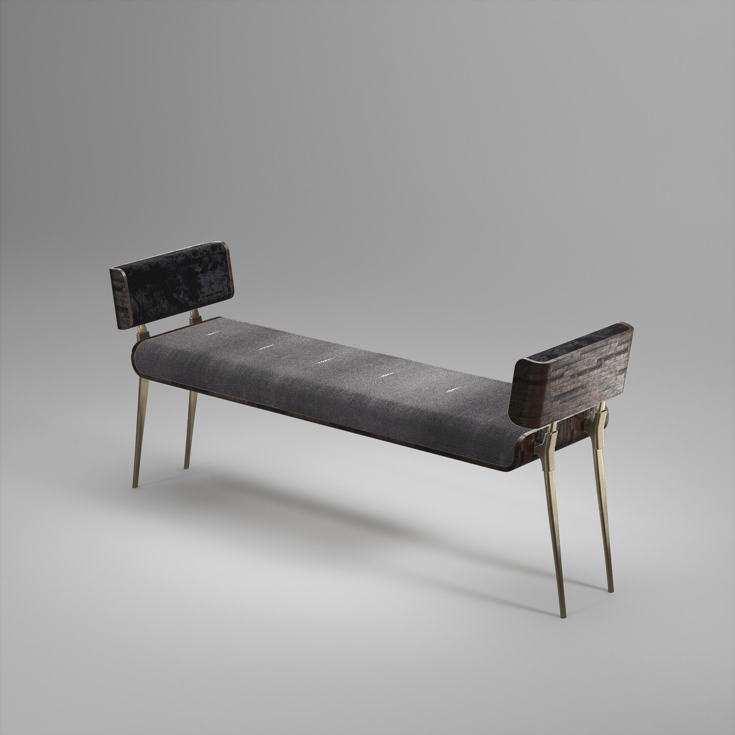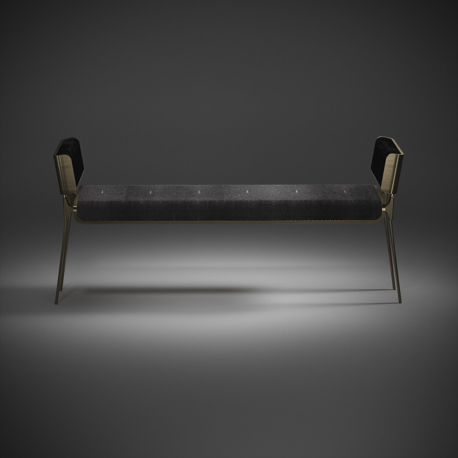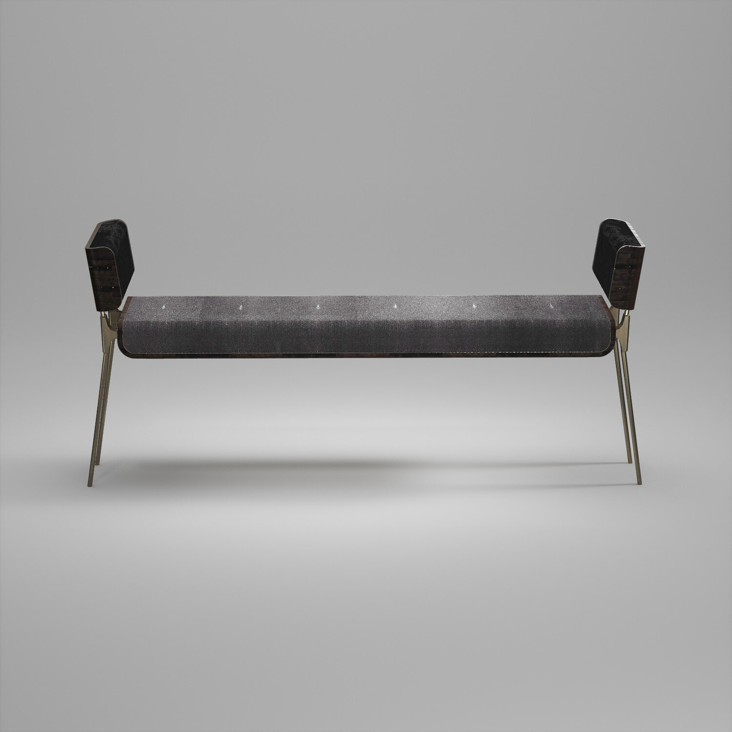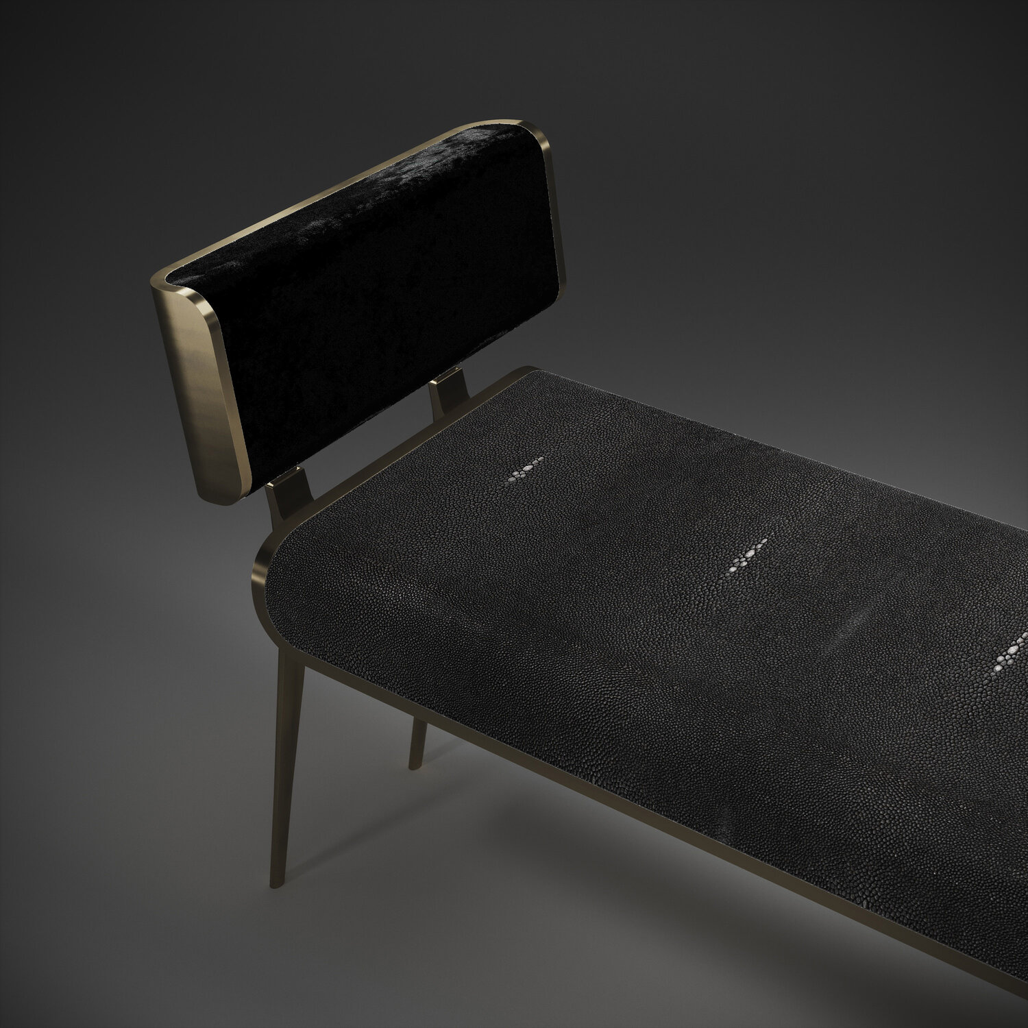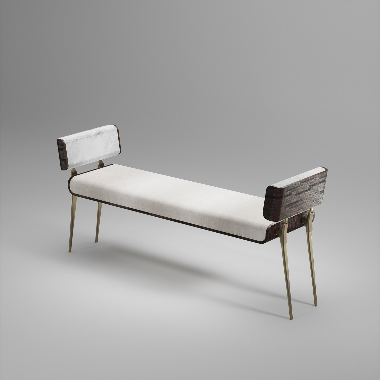 Inspired by the original Dandy bench by Kifu Paris, the Dandy II Entrance Bench is the ultimate luxury seating. The seating area is inlaid in cream shagreen and the frame, legs and sides of the bench are completely inlaid in bronze-patina brass. On the left and right side of the bench both armrests are in upholstered with white vachette.
