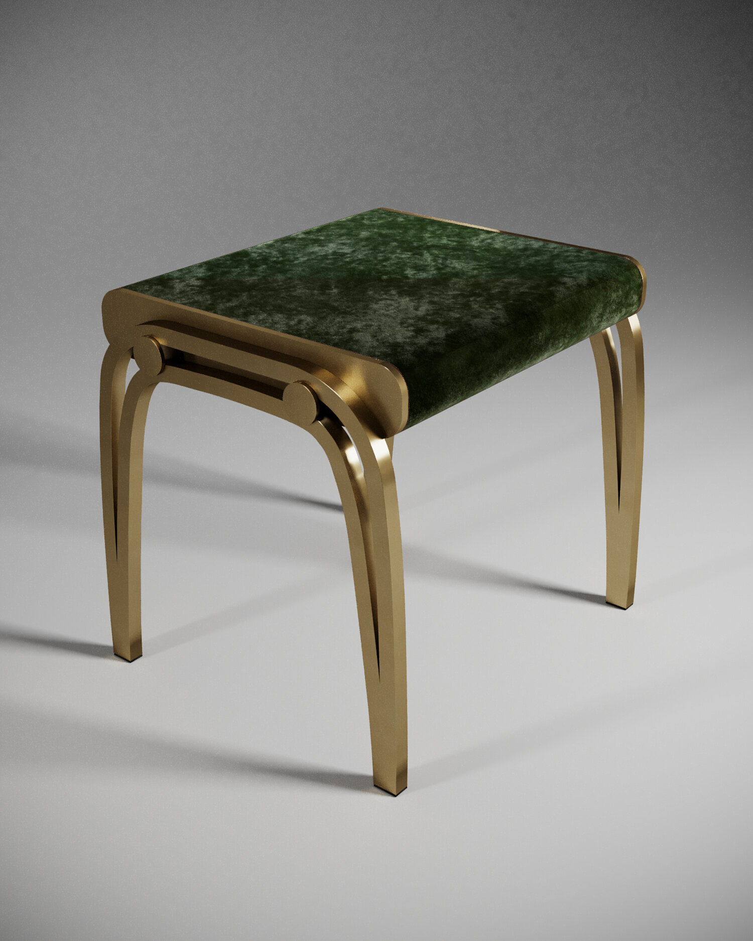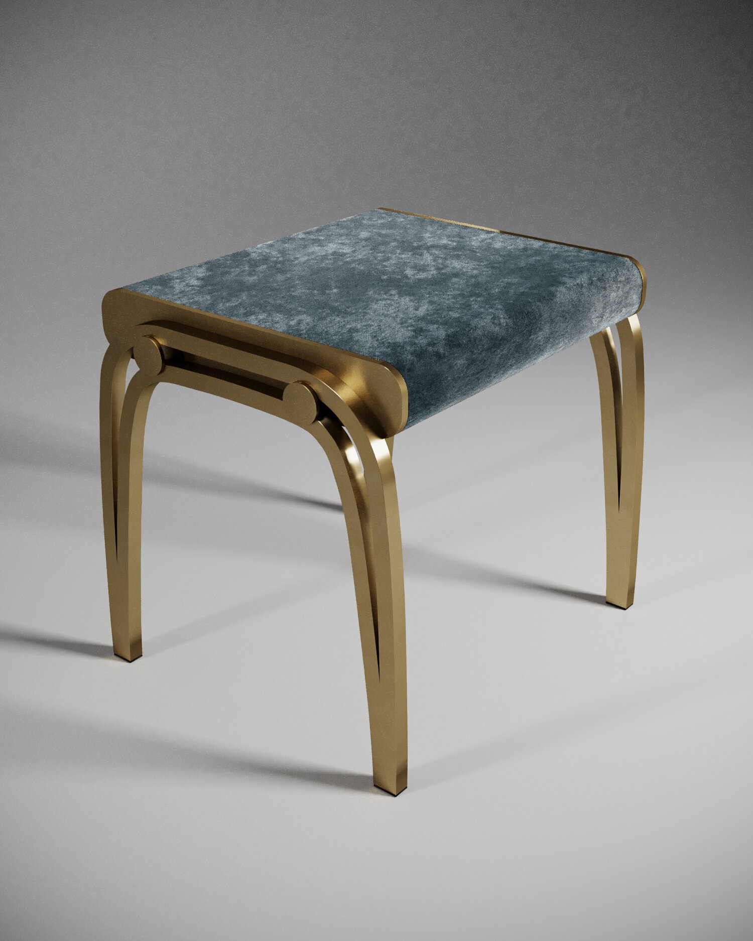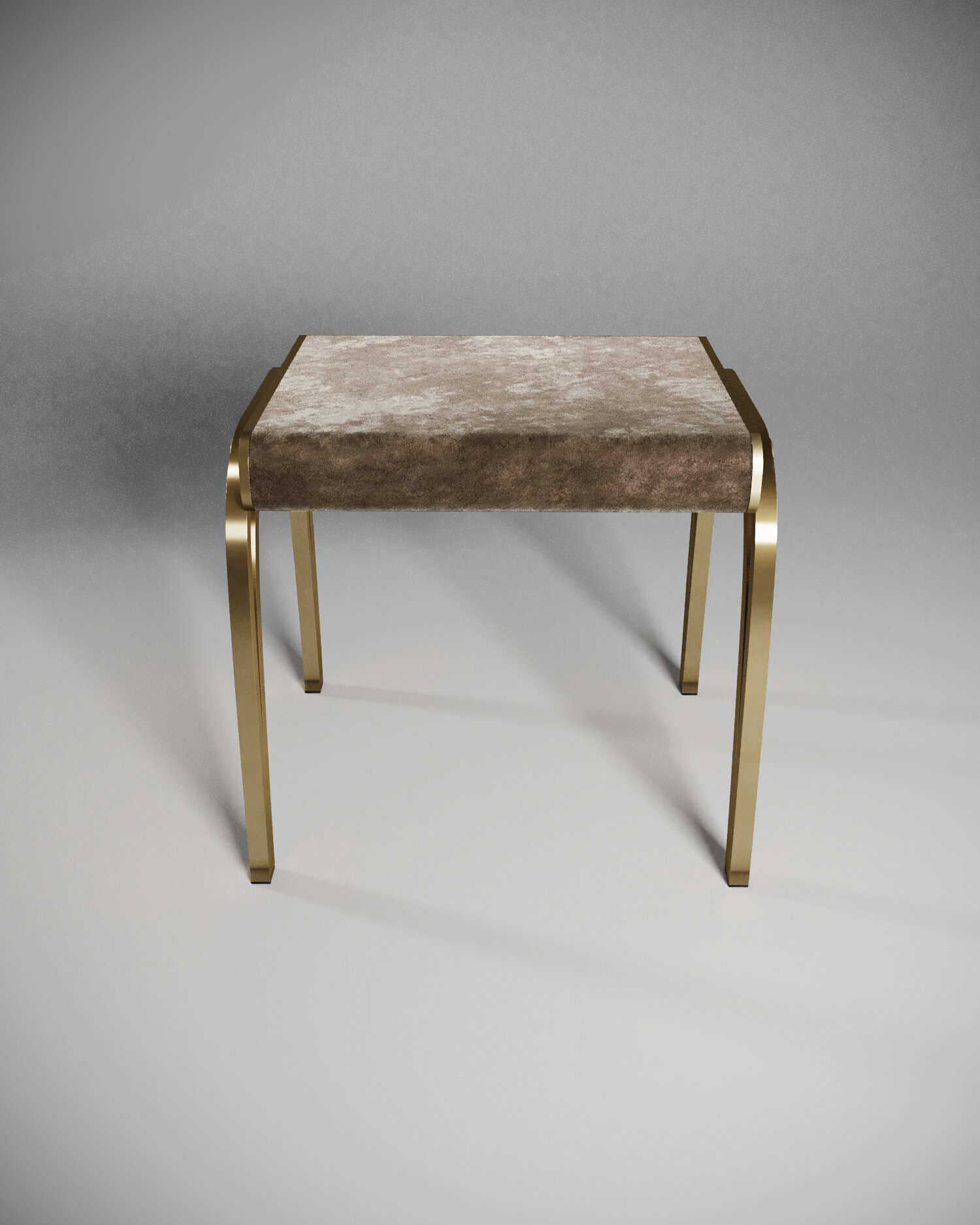The limited edition Victoria stool by R&Y Augousti is a sophisticated piece that provides comfort, whilst retaining its elegant and luxurious aesthetic. The seat is upholstered in a creamy taupe, black, mustard, pink, green, or blue Pierre Frey Velvet, with a bronze-patina brass frame. This stool is a part of a 4-piece limited edition capsule collection by R&Y Augousti.