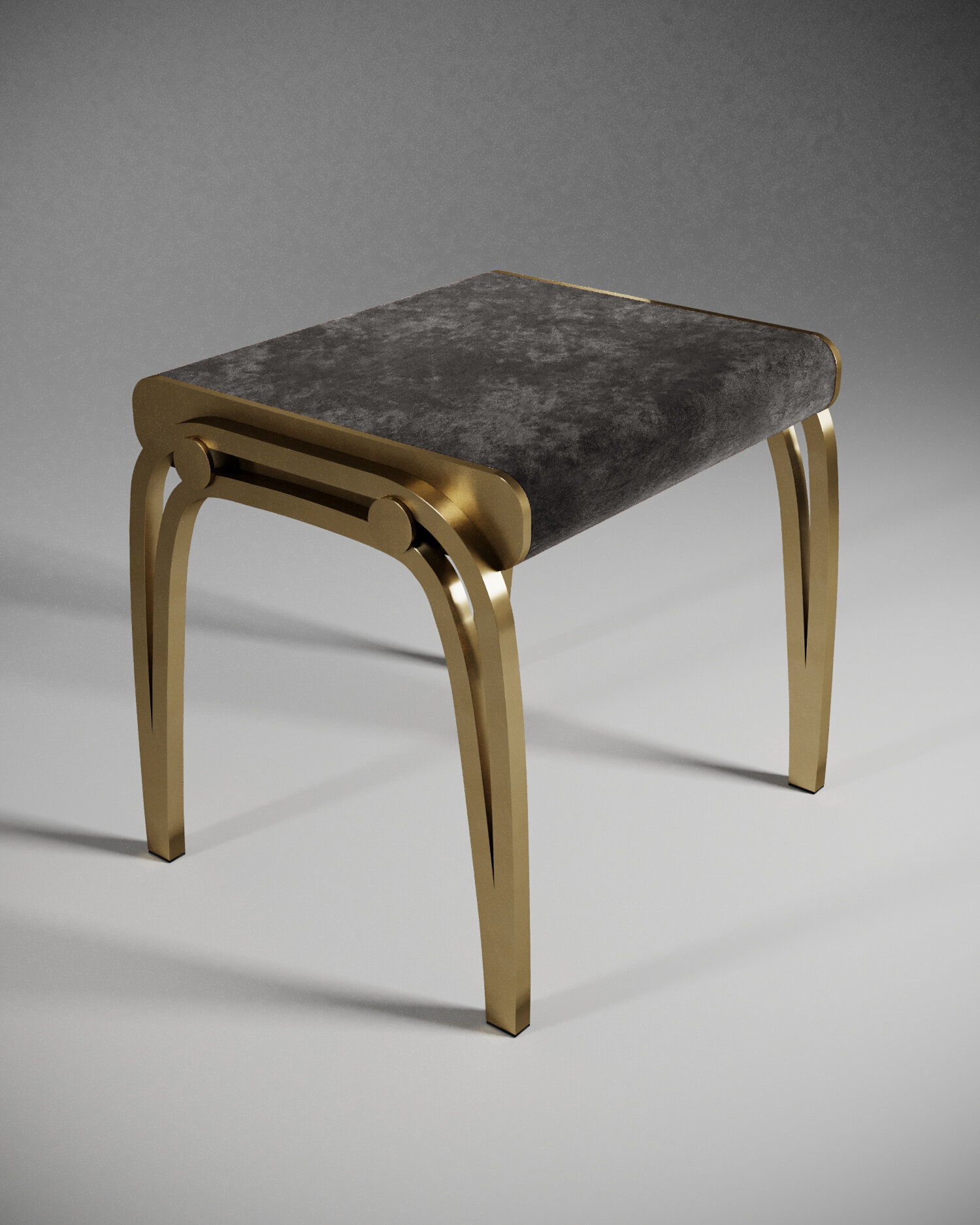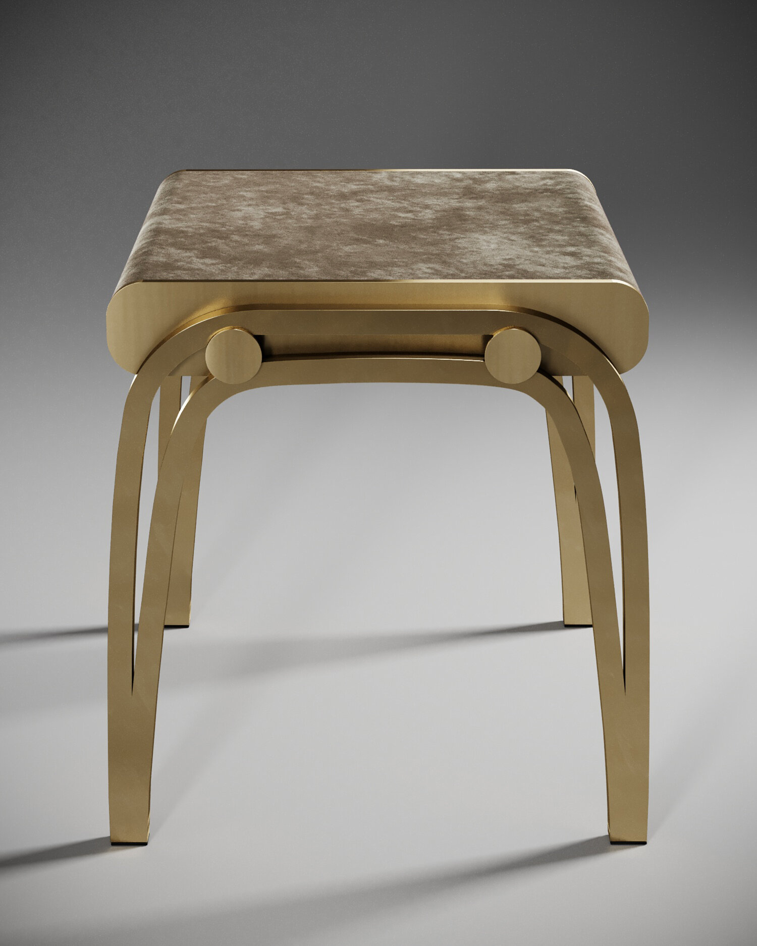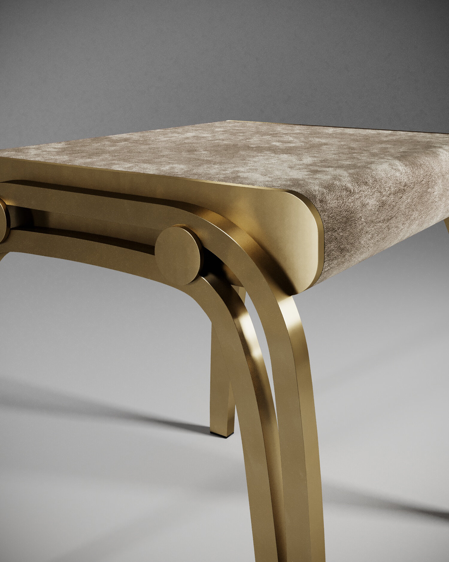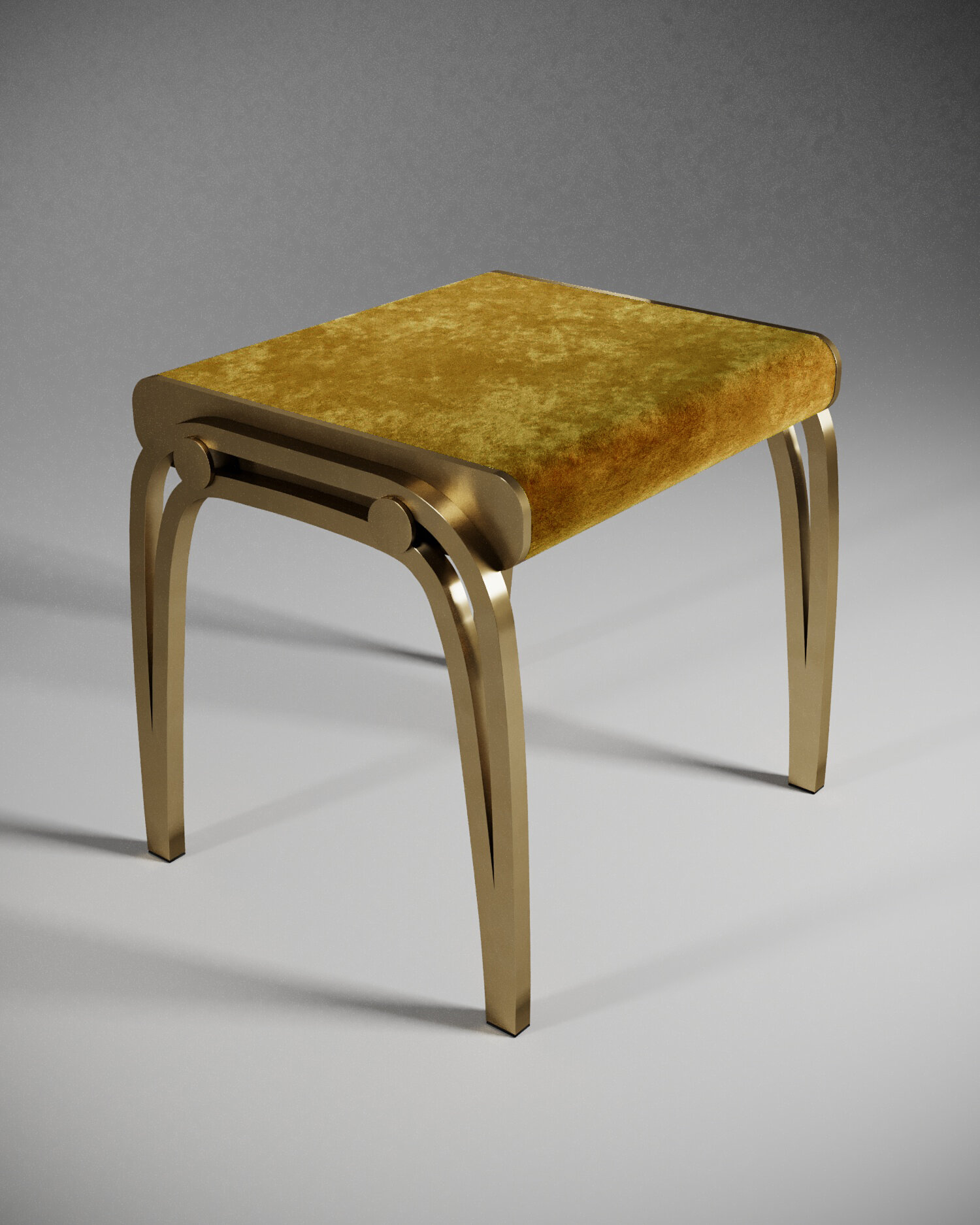The limited edition Victoria stool by R&Y Augousti is a sophisticated piece that provides comfort, whilst retaining its elegant and luxurious aesthetic. The seat is upholstered in a creamy taupe, black, mustard, pink, green, or blue Pierre Frey Velvet, with a bronze-patina brass frame. This stool is a part of a 4-piece limited edition capsule collection by R&Y Augousti.
