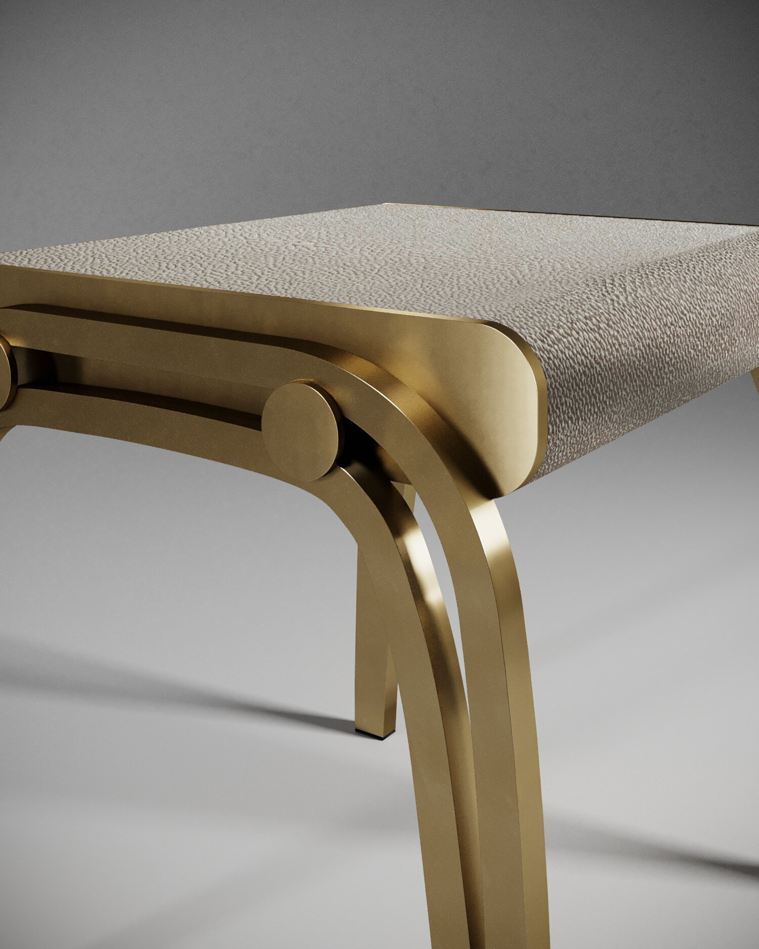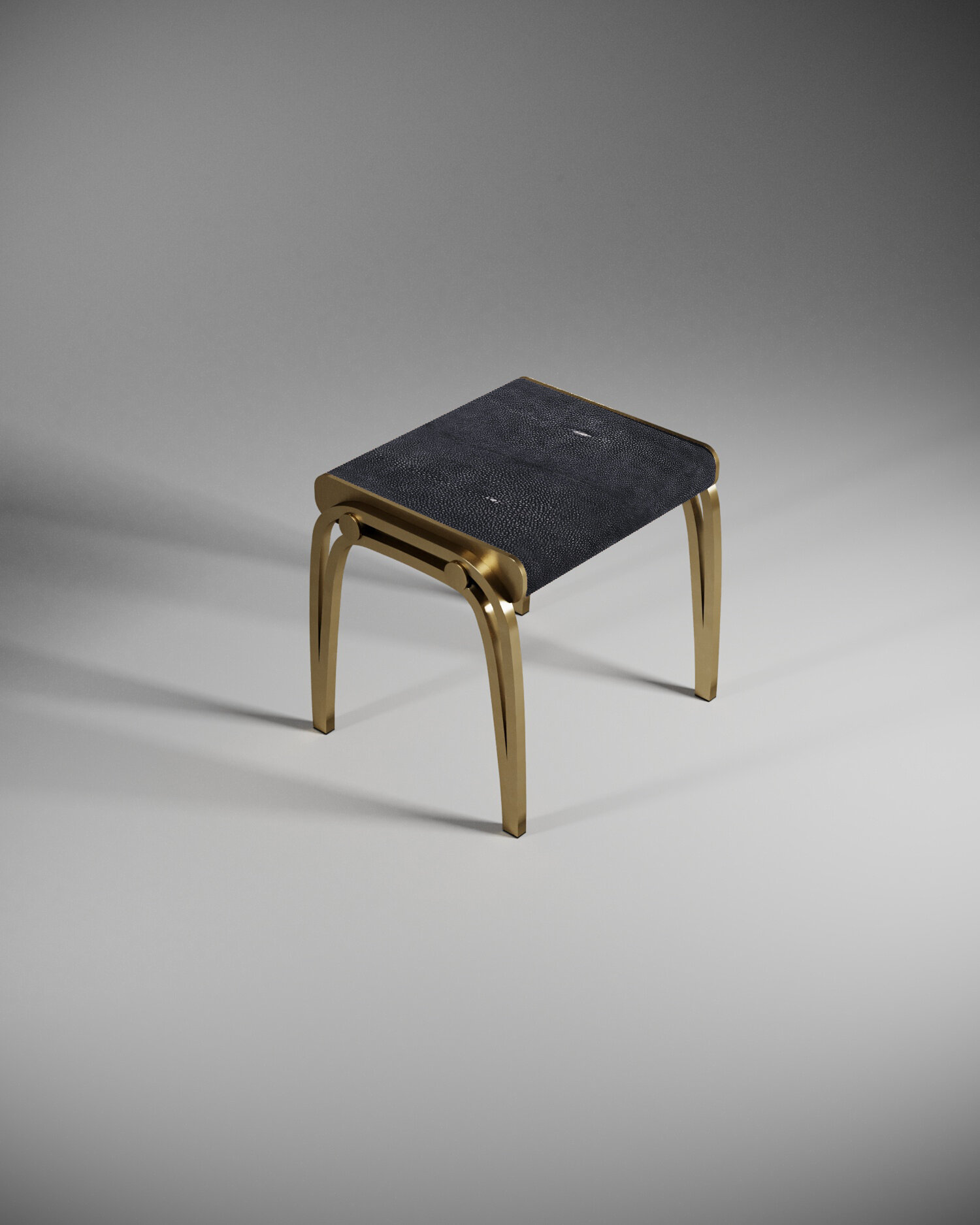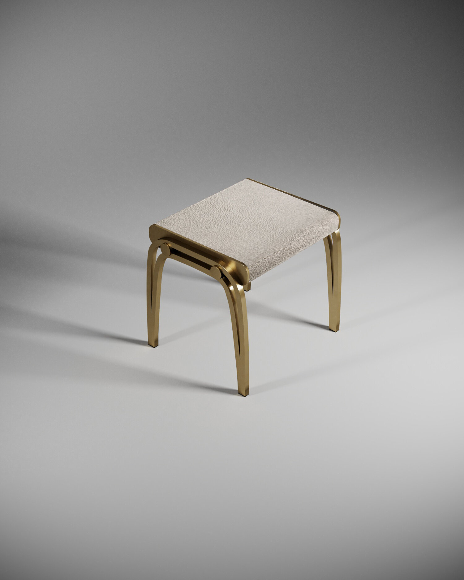 The Limited Edition Victoria stool by R & Y Augousti is a sophisticated piece that provides comfort, whilst retaining its elegant and luxurious aesthetic. The seat is inlaid in cream or black shagreen, with a bronze-patina brass frame. Available in other finish combos. This stool is a part of a 4-piece limited edition capsule collection by R & Y Augousti.