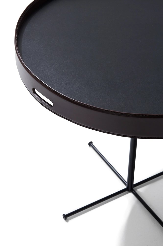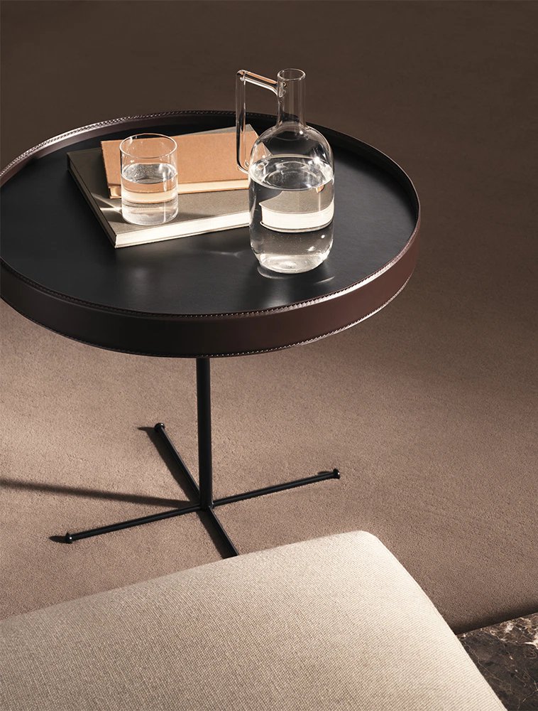 Delicate in its balances, Chab-Table Leather is sewn onto the material. Supported by a minimal structure in black-painted steel, its circular top is a tray covered in pigmented leather with visible stitching. A tribute to the 20 years of collaboration with Nendo, it embodies all the essential forms and moves in the combination of black – for the top or the edge – with taupe, natural leather, or brown.