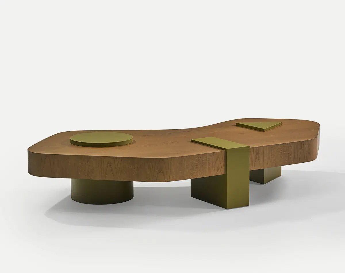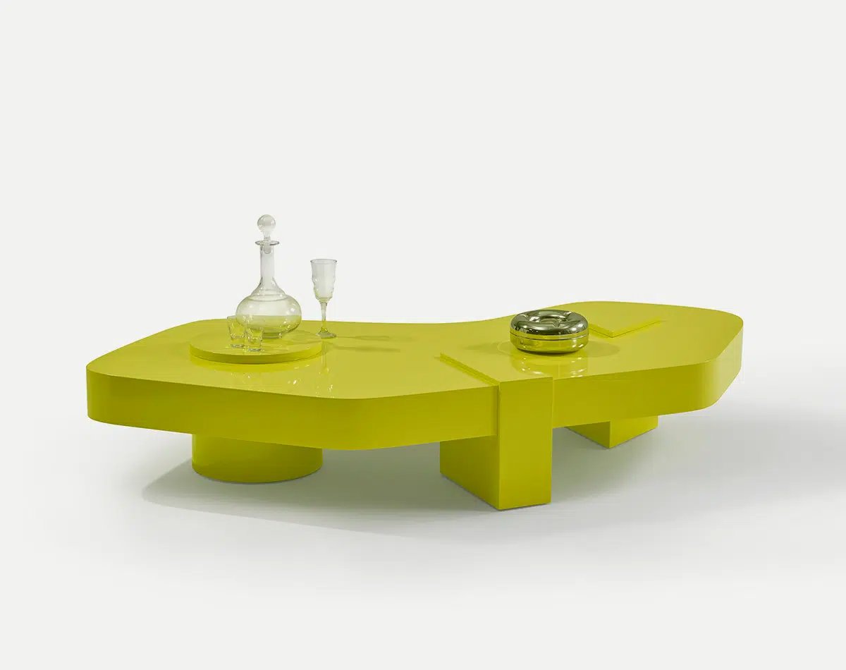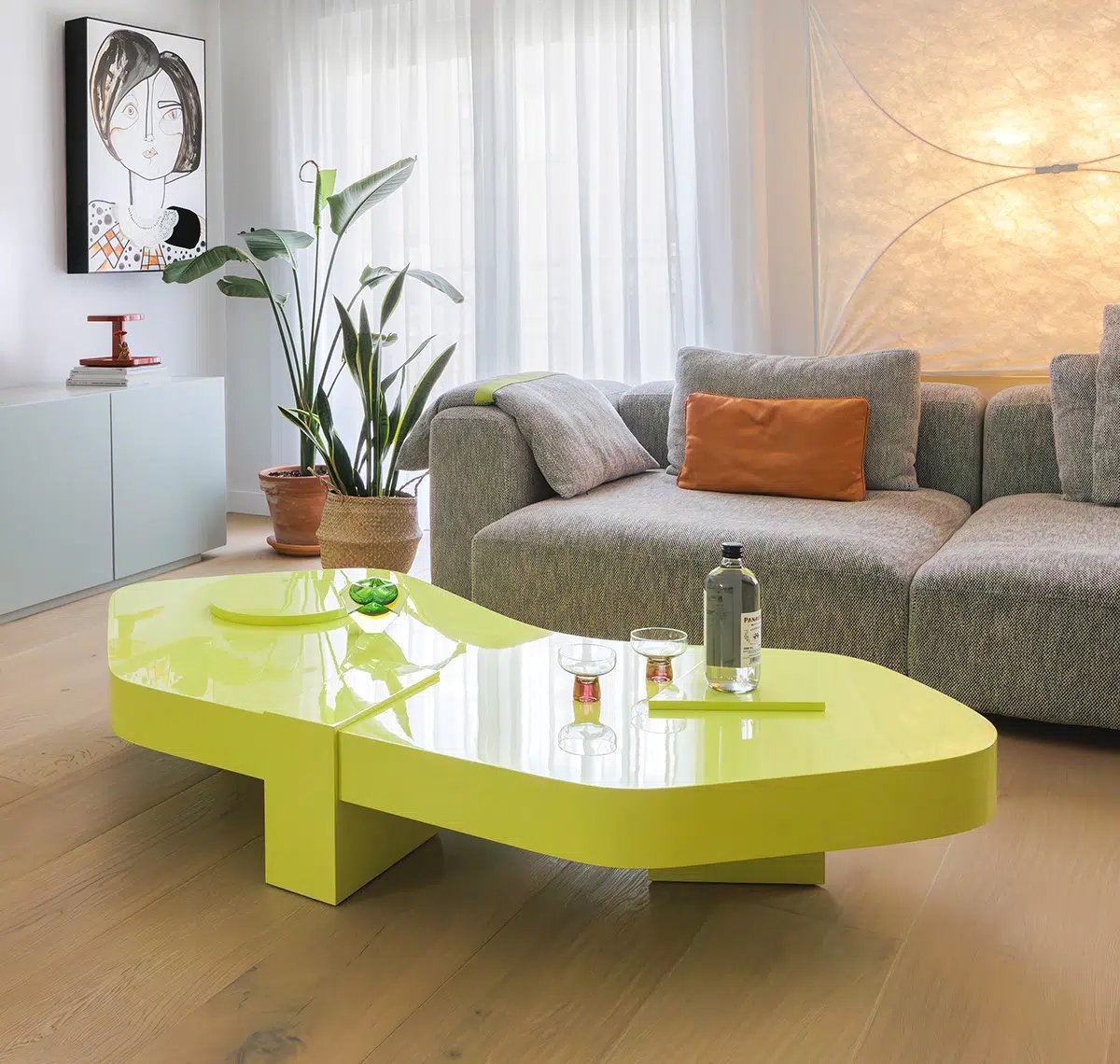 On the one hand, the new coffee table is smaller in size and retains its asymmetrical top with geometric rectangle and circle bases. Like its predecessor, it is available in the 4 carefully curated finishes: monocolour high gloss or extra matte lacquer, stained ash wood top and lacquered bases or the iconic Designer’s Edition with the sophisticated Sottssas Grey veneer by Alpi with lacquered bases.