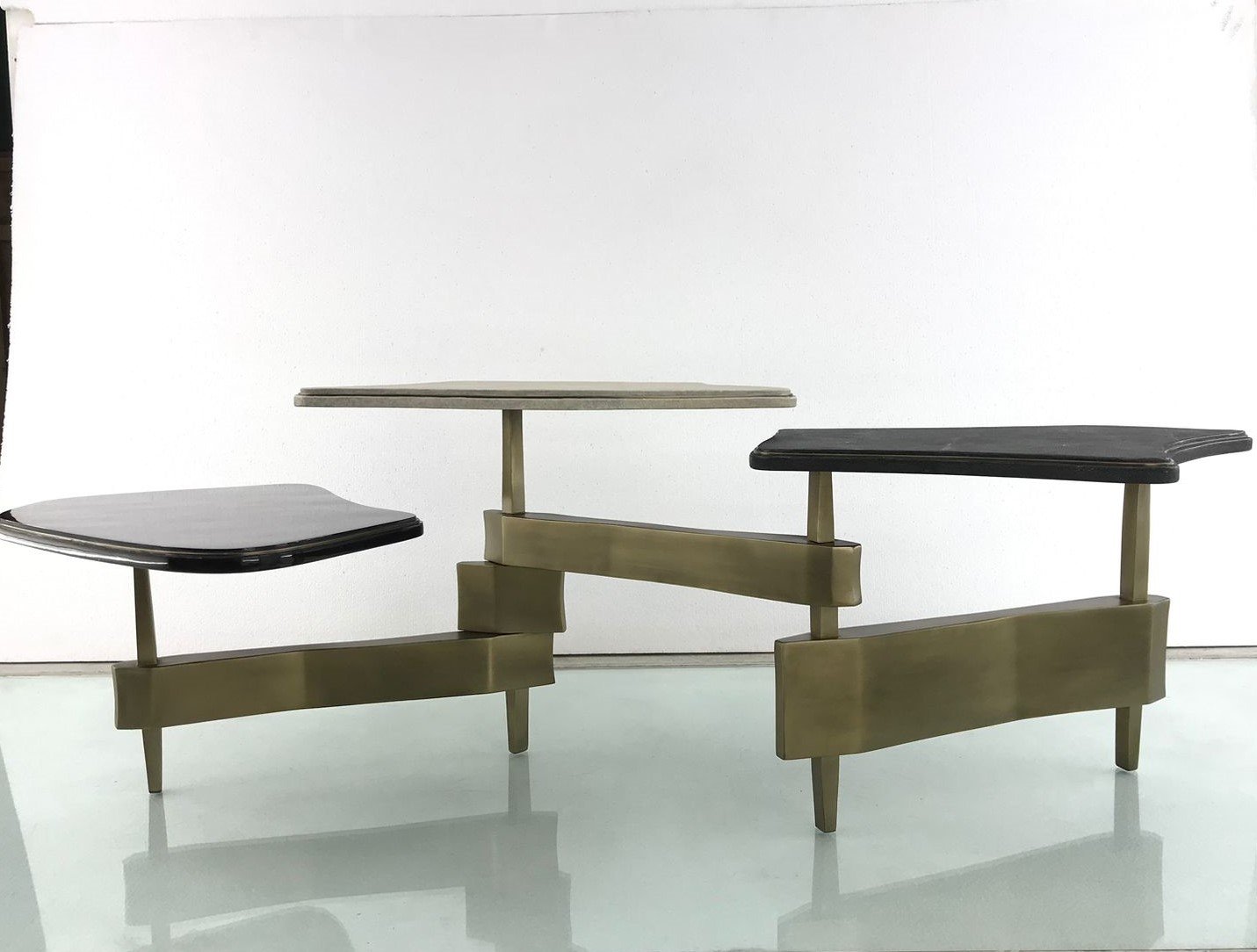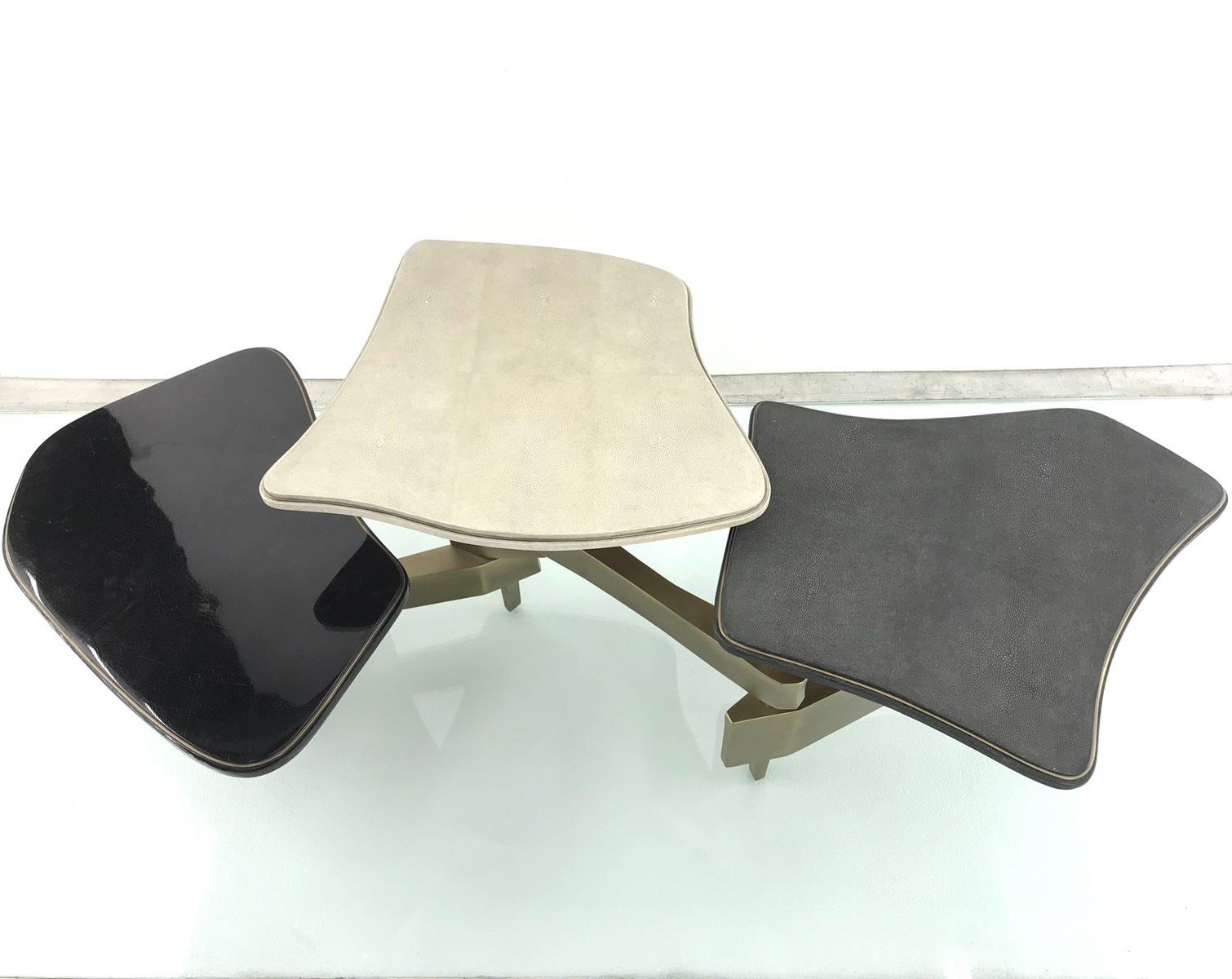 The Metropolis 3-top coffee table by Kifu Paris is a dramatic and sculptural design that demonstrates the incredible and signature artisanale work from her Augousti genes. The bronze-patina brass base of the coffee table is conceptually inspired by the skyline of cosmopolitan cities. The tops are inlaid in a mixture of cream shagreen, black Shagreen and black pen shell with a subtle metal indentation detail. This piece comes as a console table and side table variations.