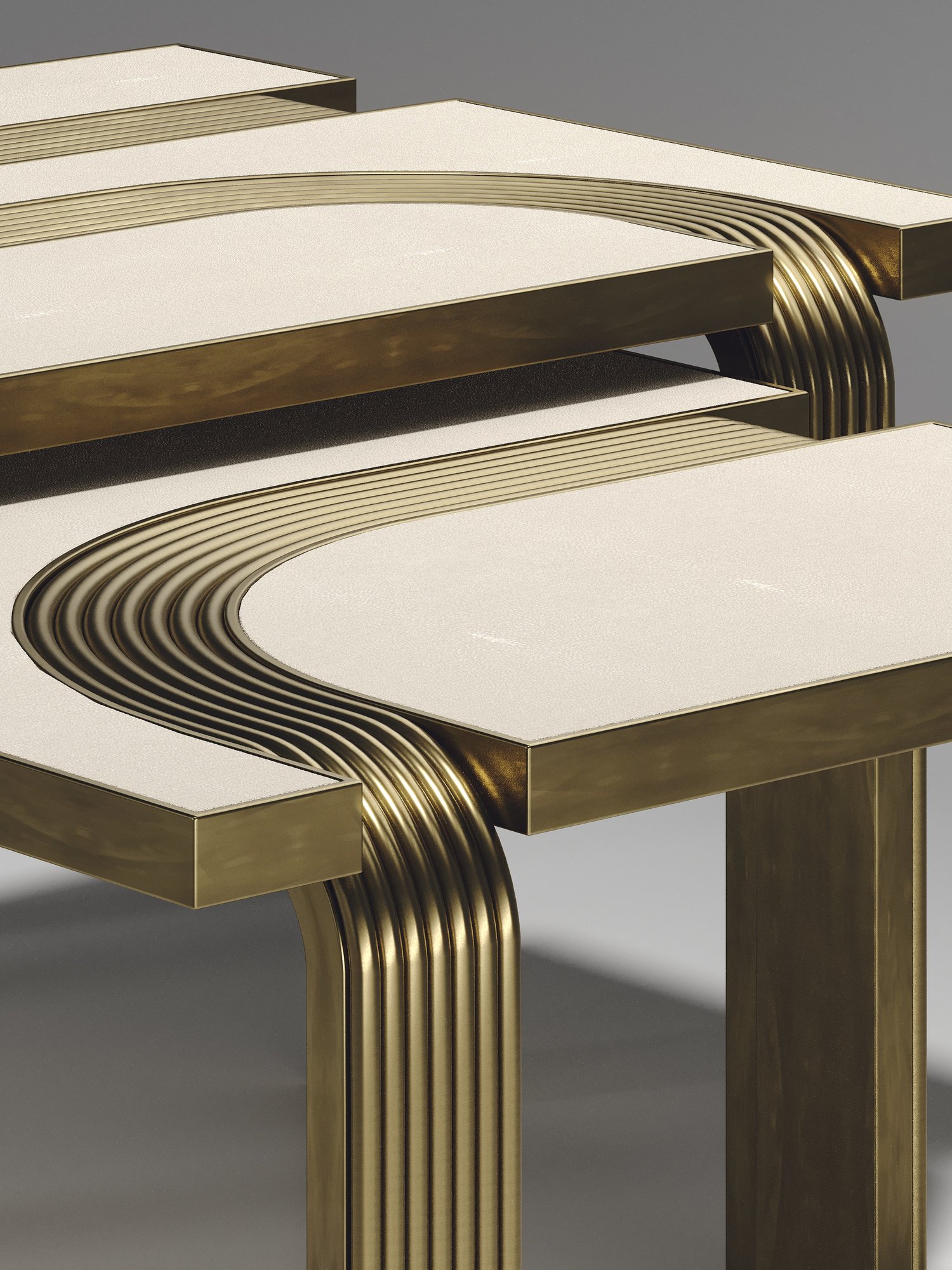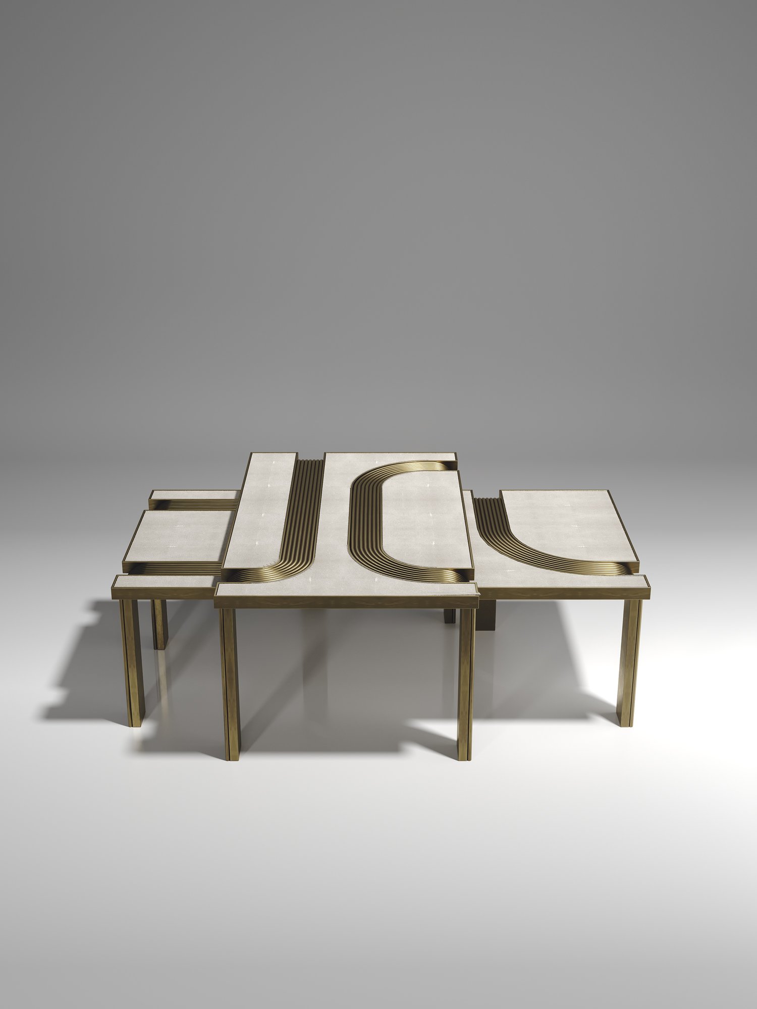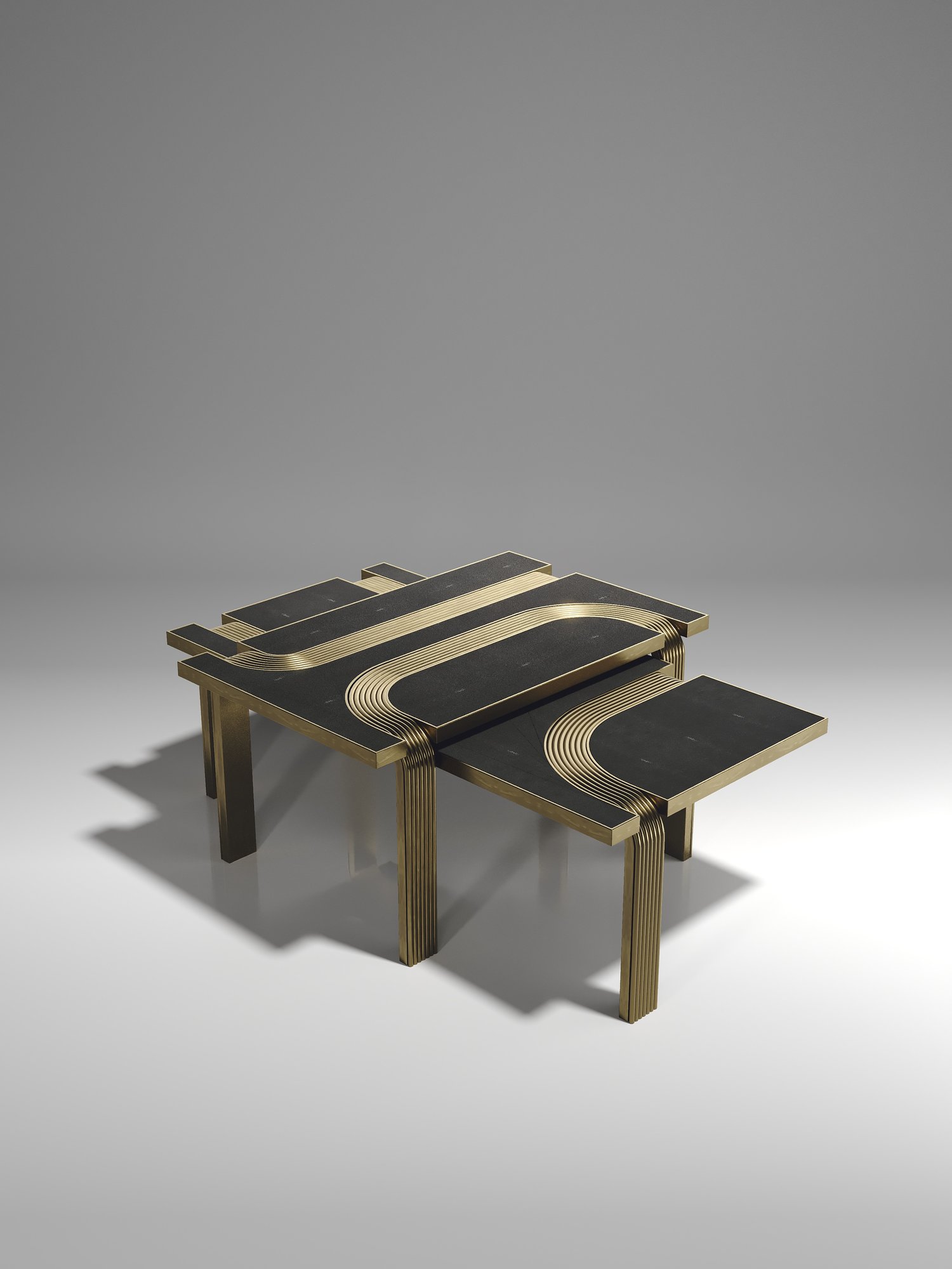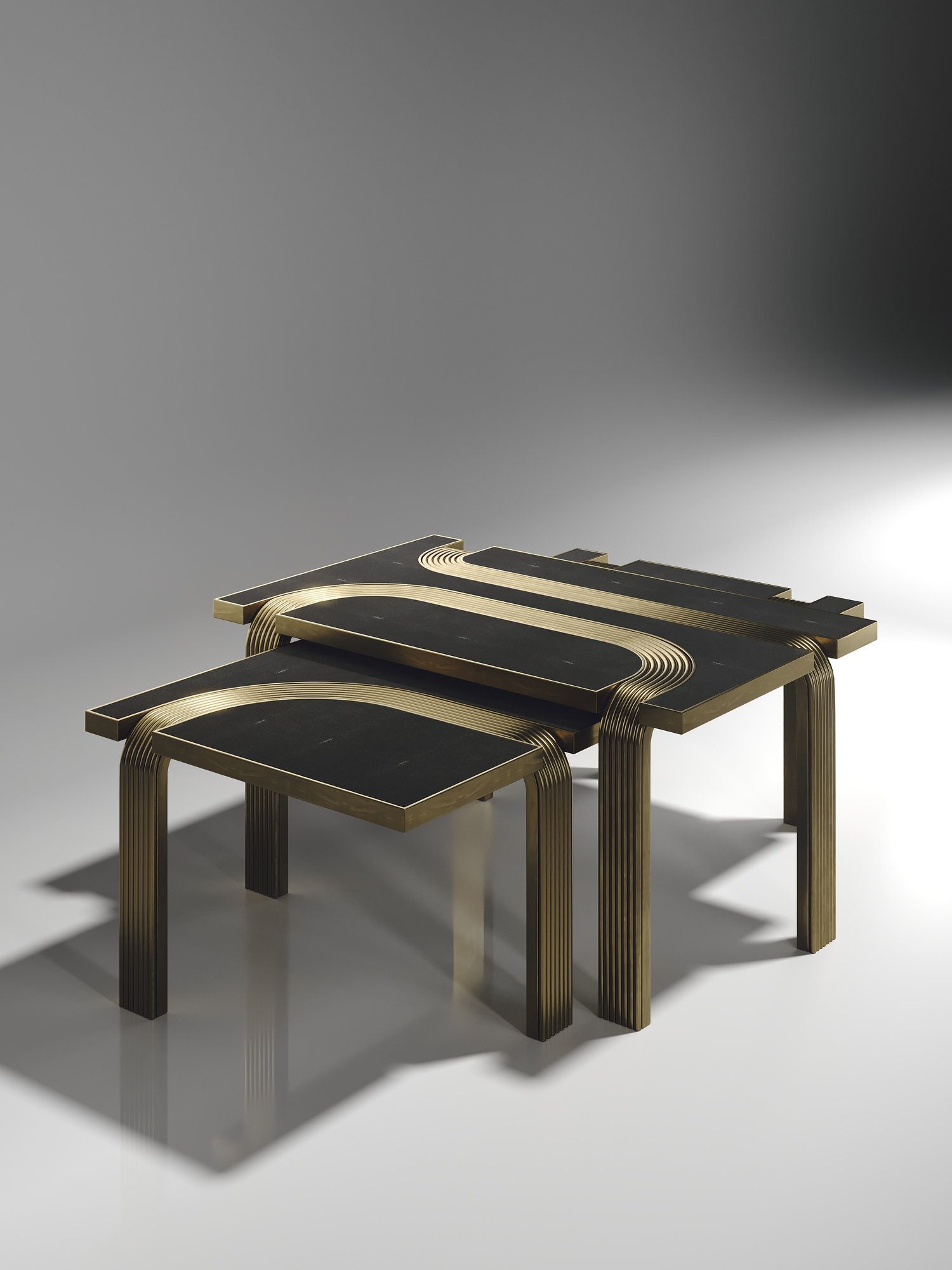 The Set of 2 Licol Nesting Coffee Tables by R & Y Augousti explore the brand's iconic DNA of bringing old world artisanal craft into a contemporary and utterly luxury feel. These tables are done in different finish variations including shagreen and pen shell with bronze-patina brass accents, and inlay mixed with rattan. Custom sizing/finishing on request.