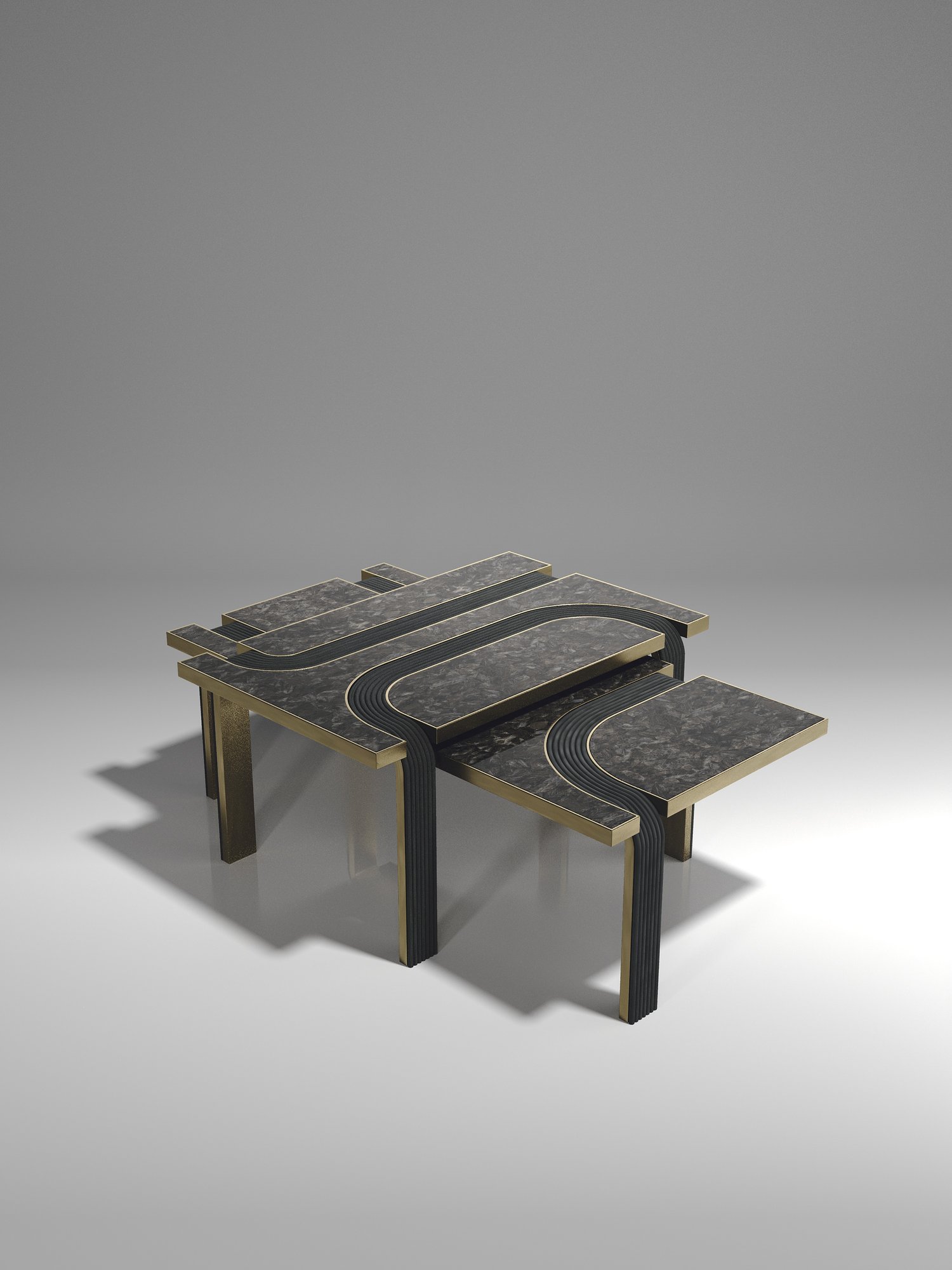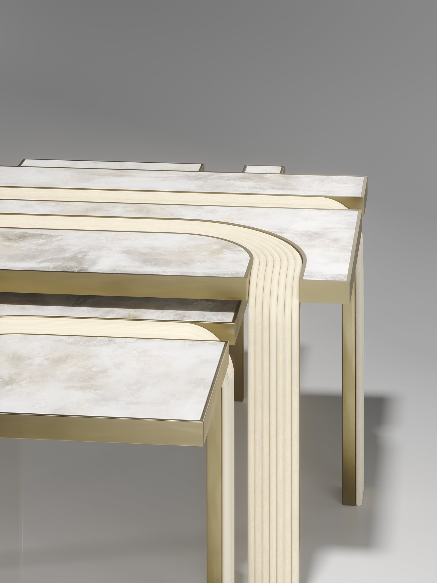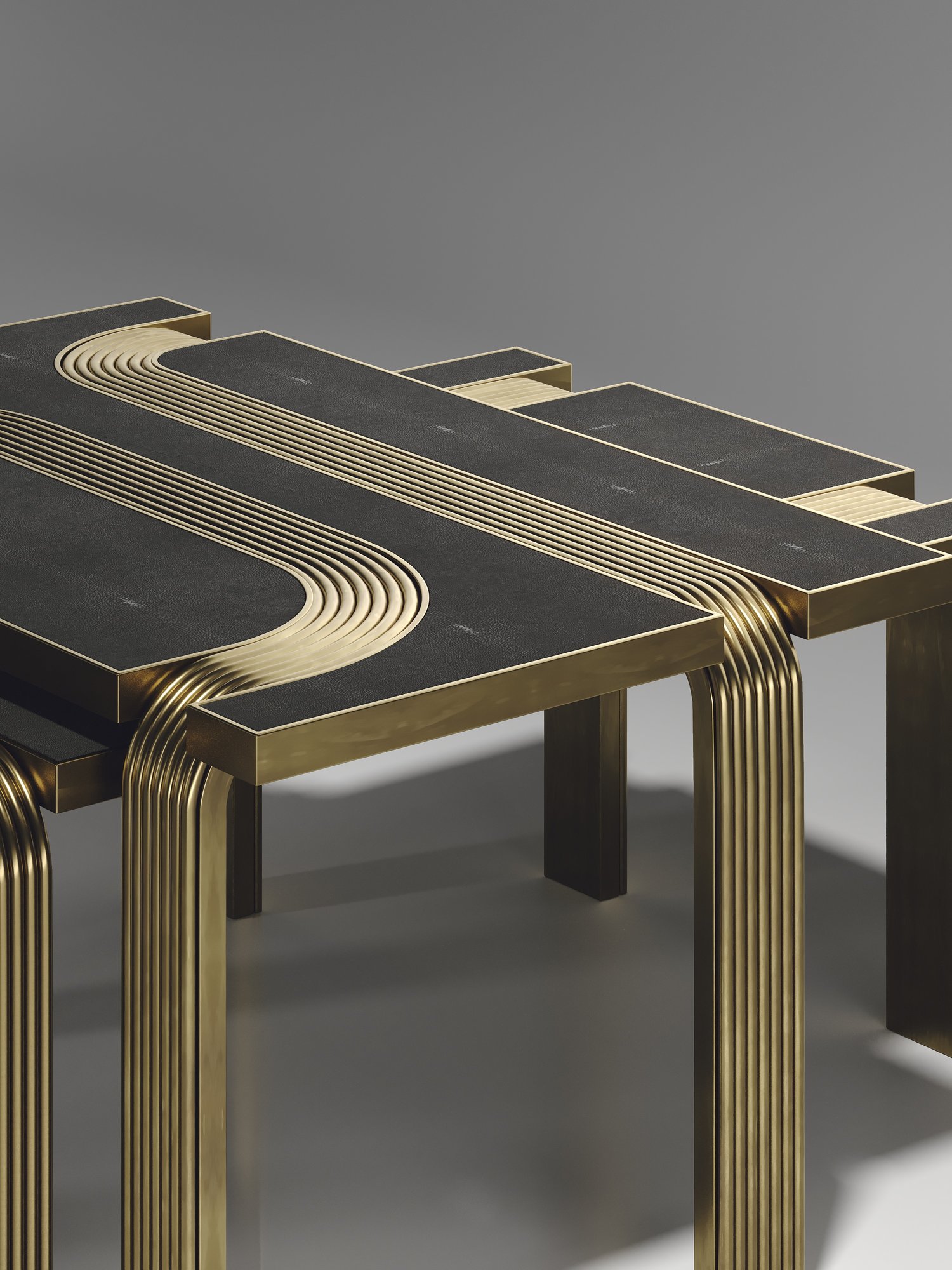 The Set of 2 Licol Nesting Coffee Tables by R & Y Augousti explore the brand's iconic DNA of bringing old world artisanal craft into a contemporary and utterly luxury feel. These tables are done in different finish variations including shagreen and pen shell with bronze-patina brass accents, and inlay mixed with rattan. Custom sizing/finishing on request.