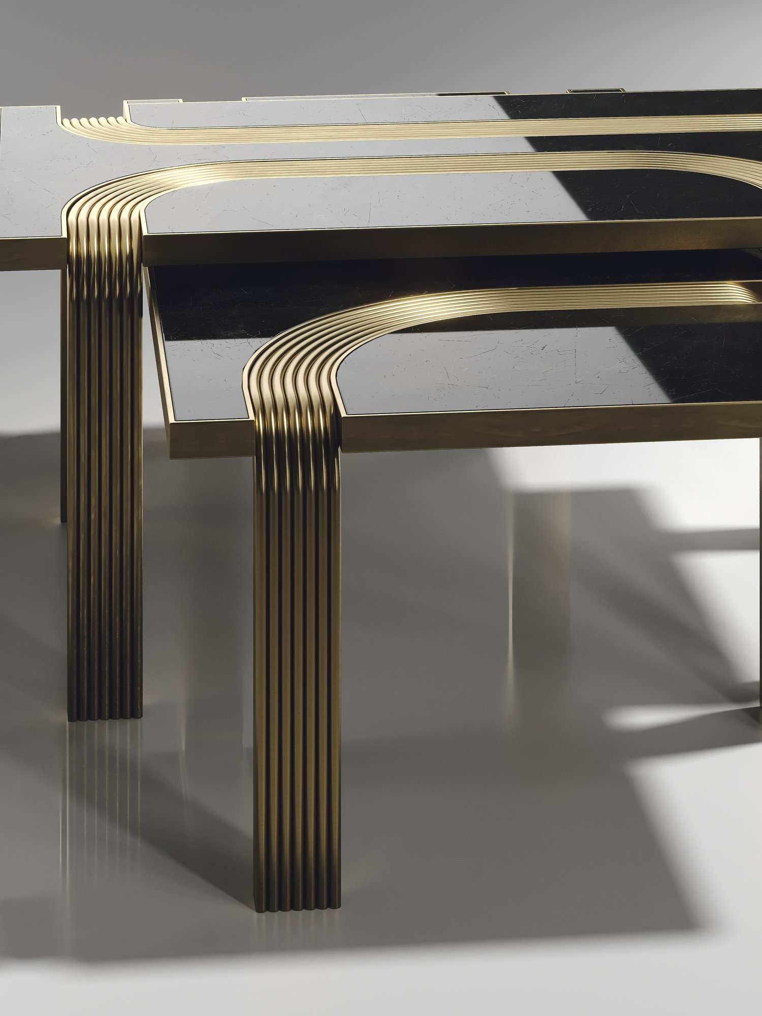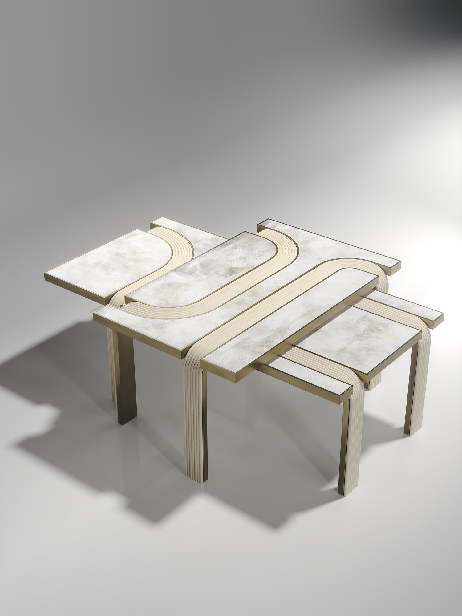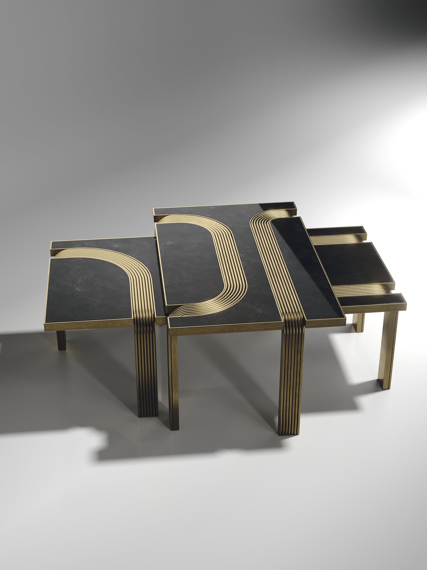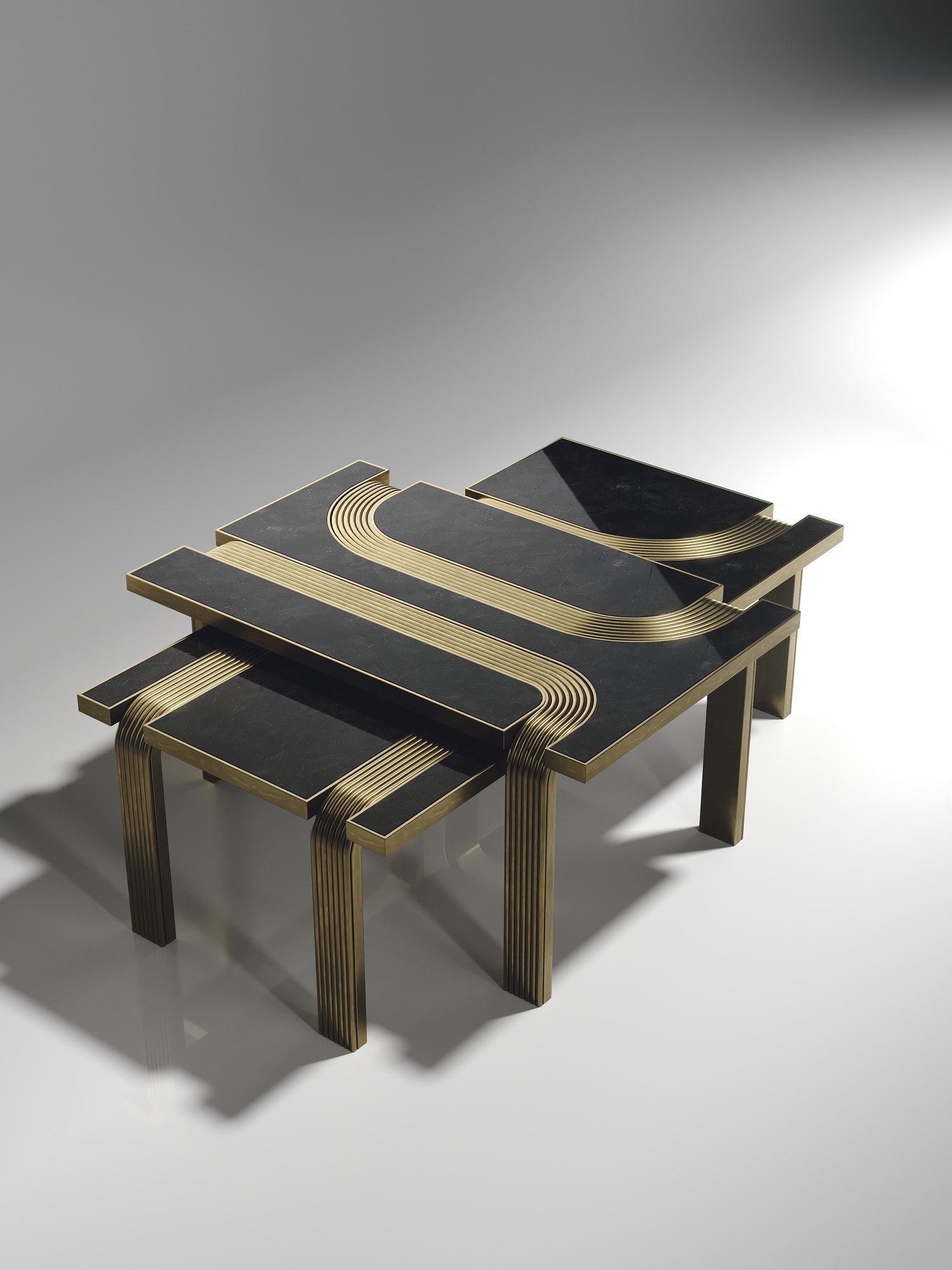 The Set of 2 Licol Nesting Coffee Tables by R & Y Augousti explore the brand's iconic DNA of bringing old world artisanal craft into a contemporary and utterly luxury feel. These tables are done in different finish variations including shagreen and pen shell with bronze-patina brass accents, and inlay mixed with rattan. Custom sizing/finishing on request.