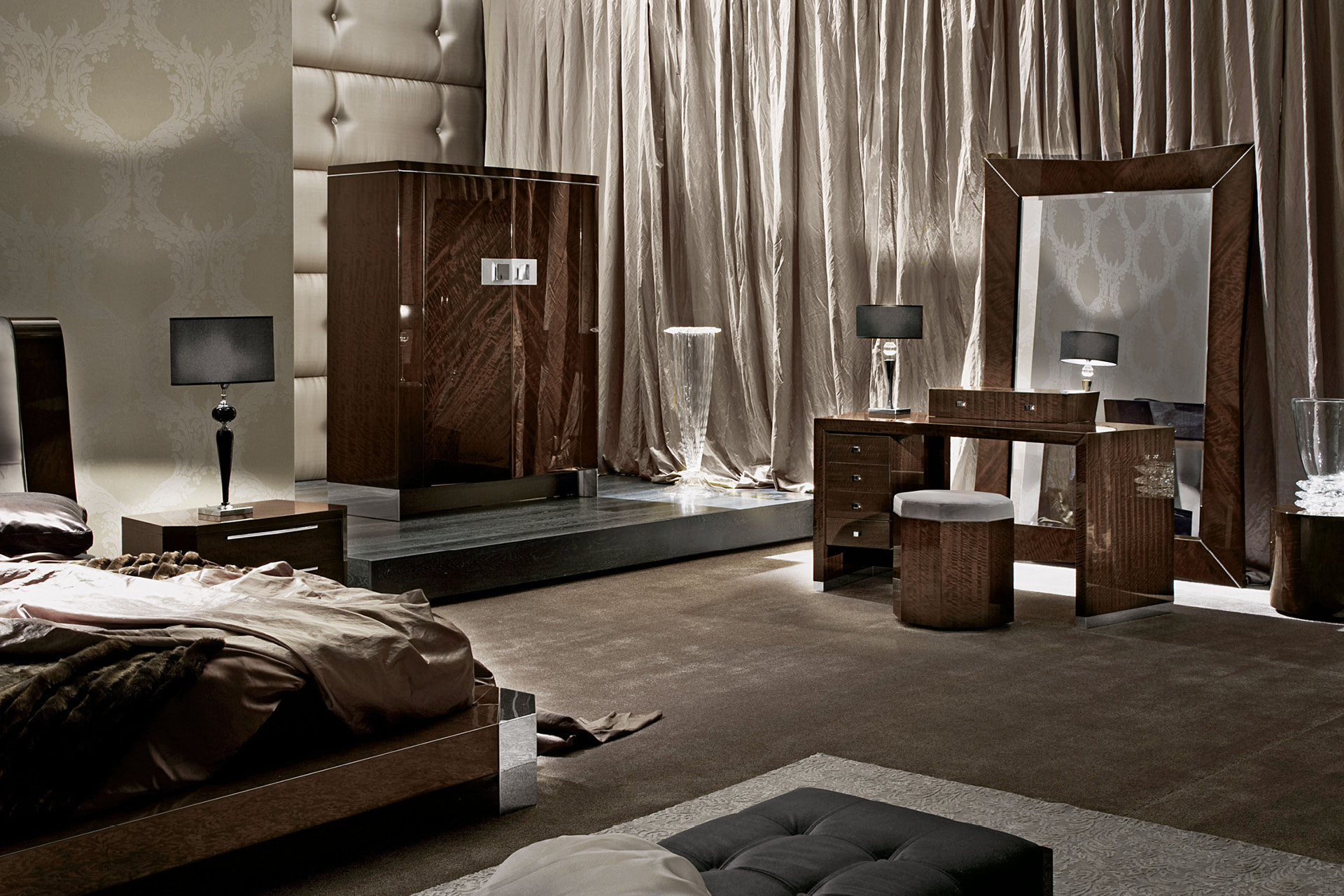 Armoire in european curly eucalyptus veneer in high gloss polyester