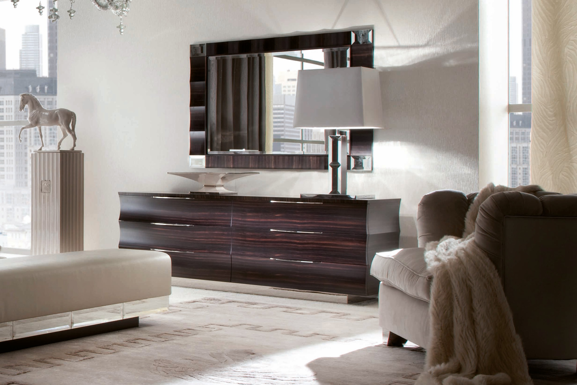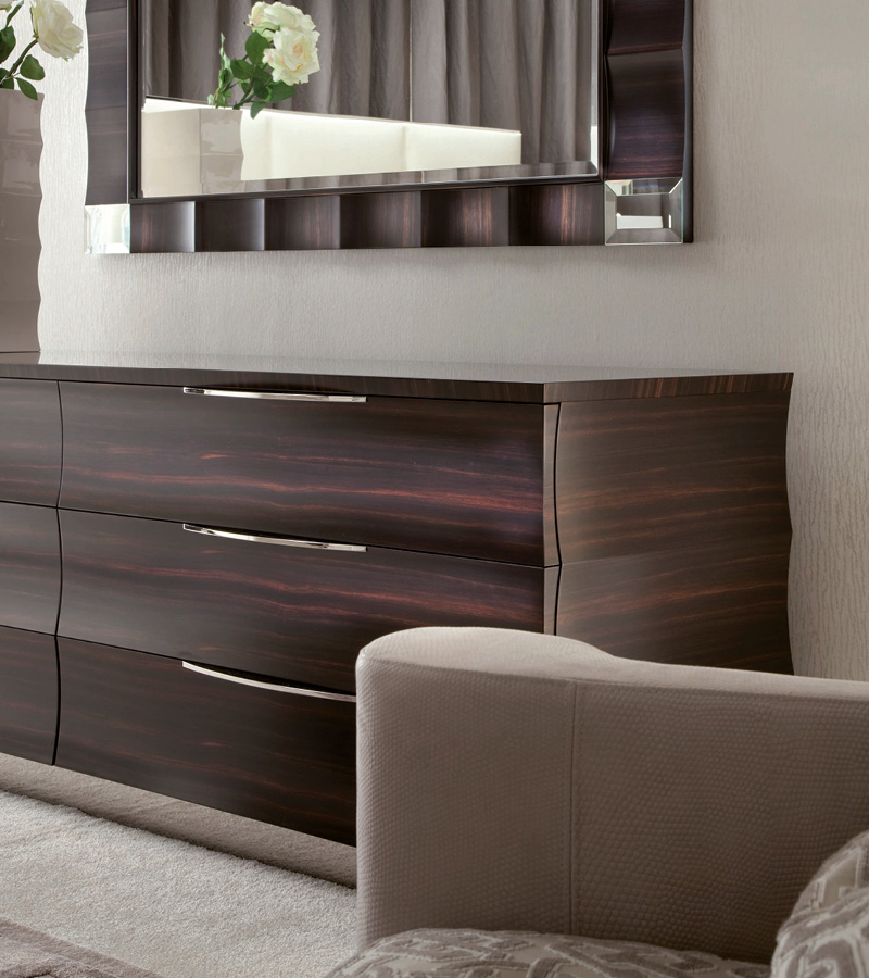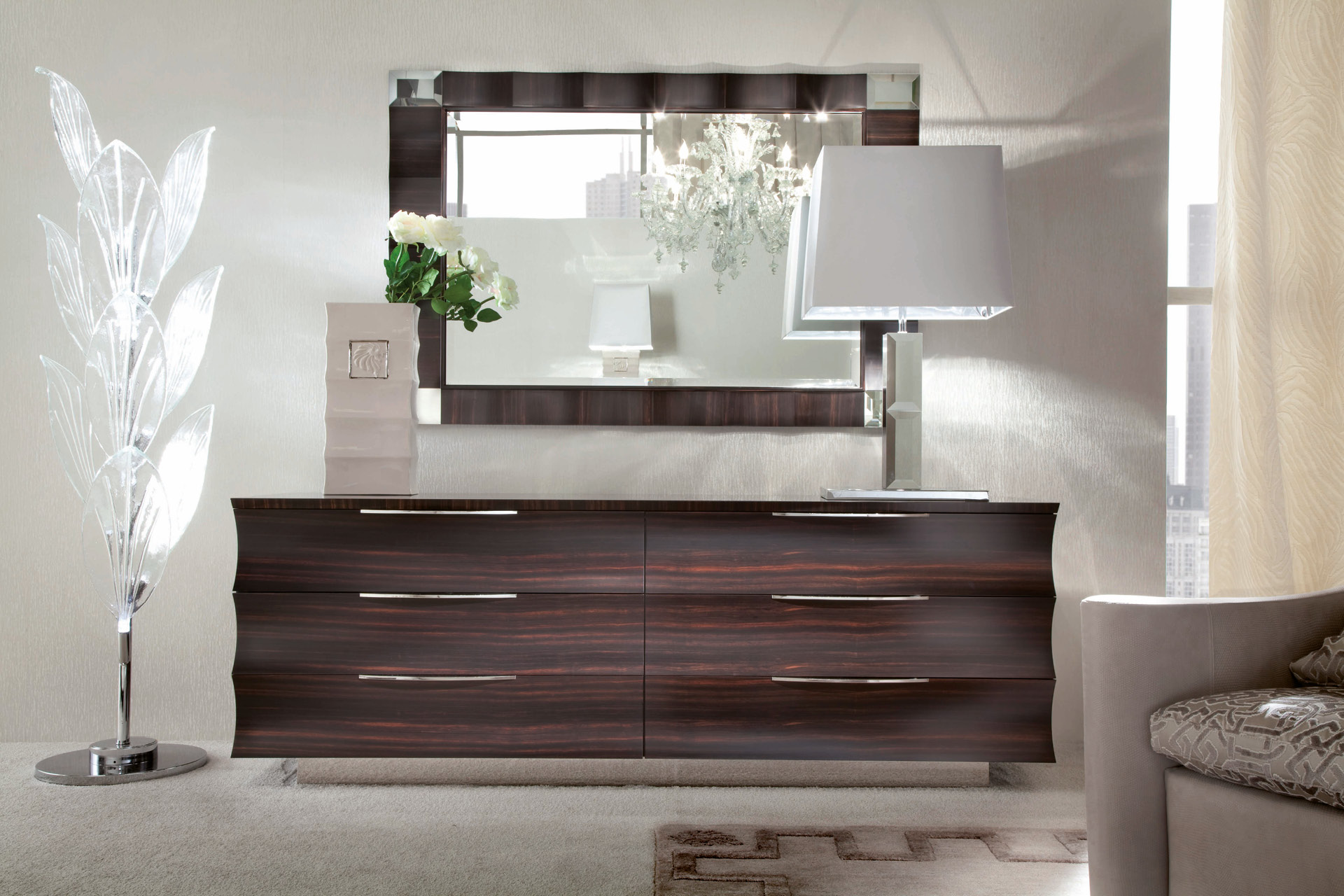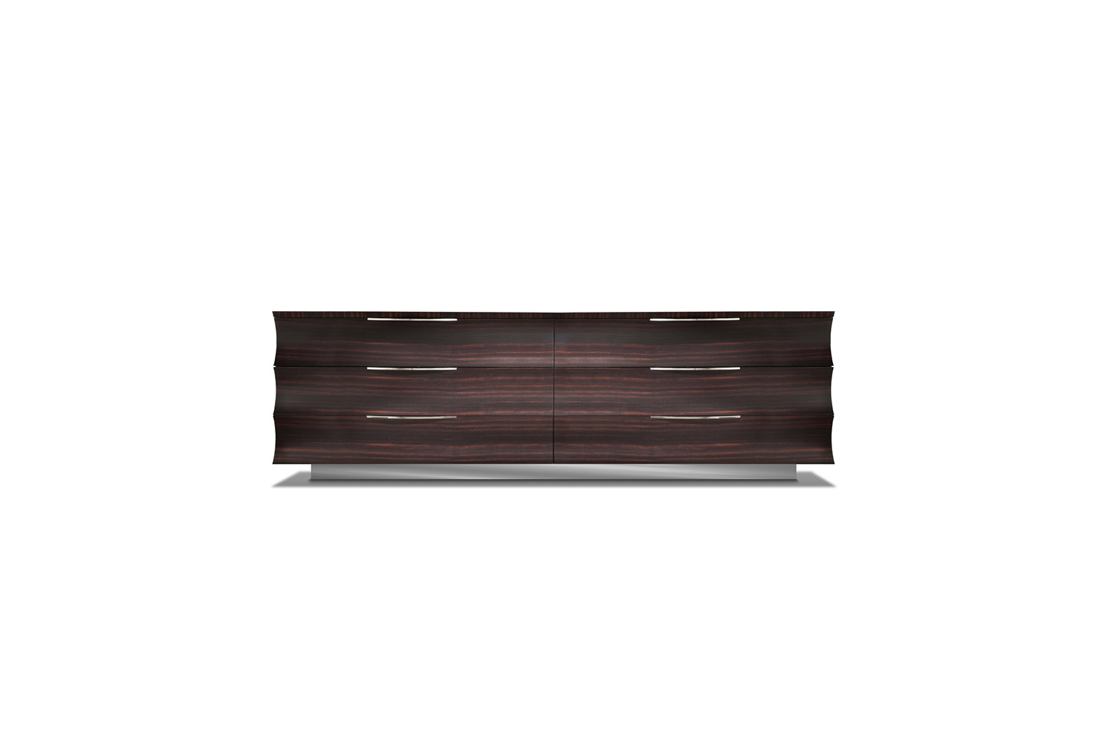 Dresser in makassar ebony veneer in satin finish. 6 full extension double drawers with top drawers in bottom in velvet fabric. Chrome stainless steel top inlay. Chrome stainless steel handles and base.