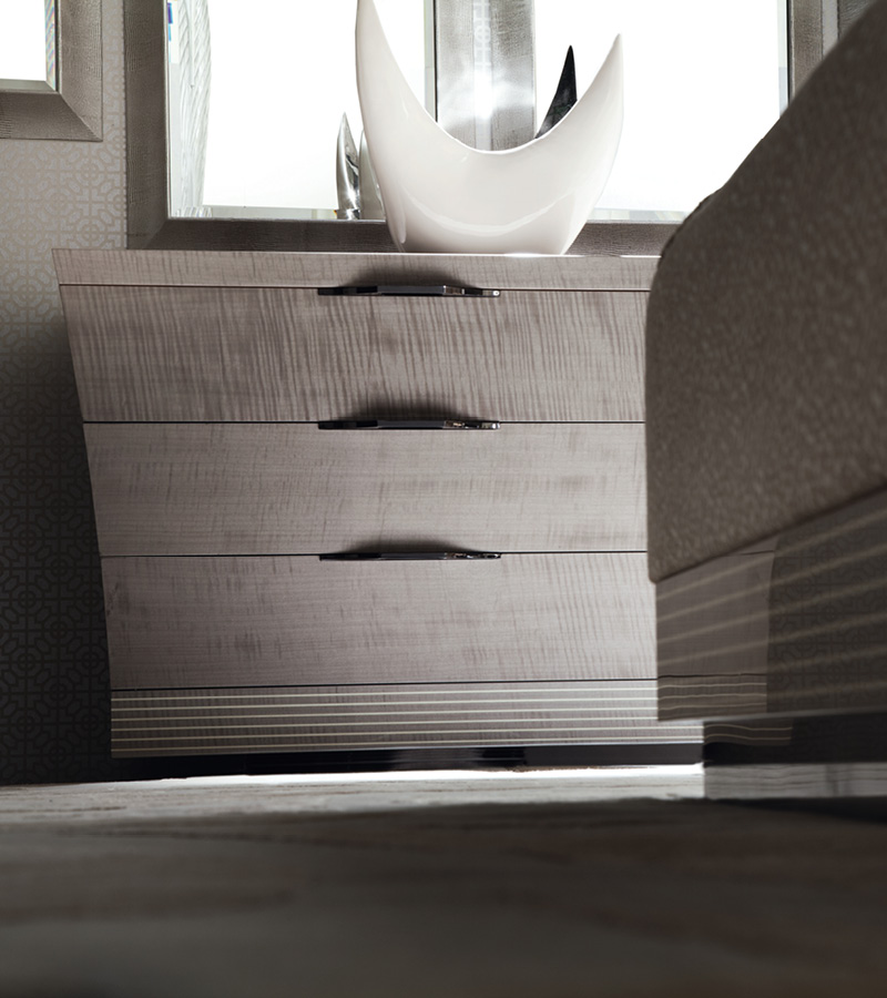 Dresser in tiger African sycomore veneer with high gloss polyester finish and storm dark grey finish stainless steel handles and base. 6 full extension drawers w/bottom in silver lizard printed leather. White maple fine line inlay in the top and in the base.