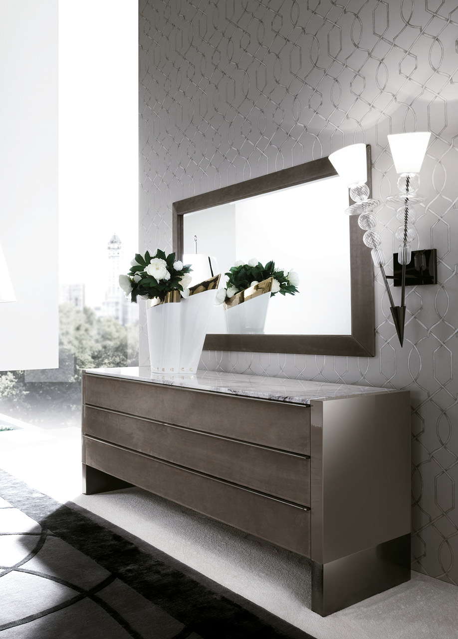 Dresser in high gloss polyester grey lacquer with marble top. 3 full extension double drawers with fronts in natural protected nubuk leather, bottom part in velvet fabric. Base, legs and handles in black nickel steel.
