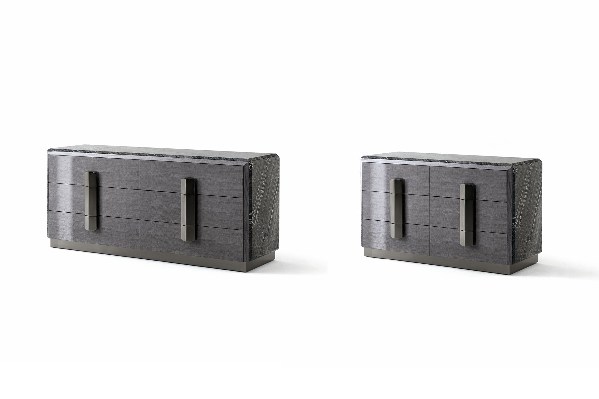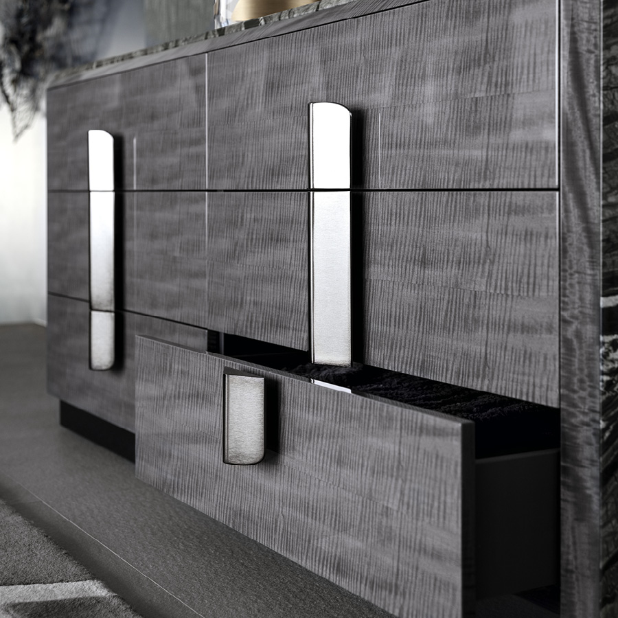 Dresser in Madagascar figured Mowinghi veneer in high gloss polyester finish. Top and sides in Kenya Black marble. Base and handles in satin black nickel stainless steel. 6 full extension drawers with bottom part in velvet fabric.