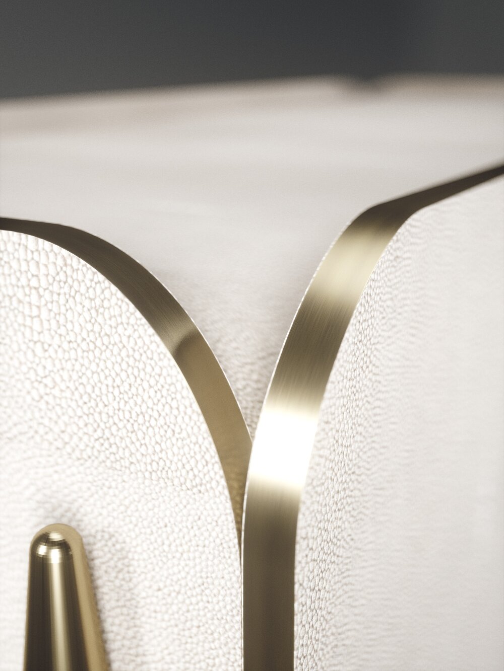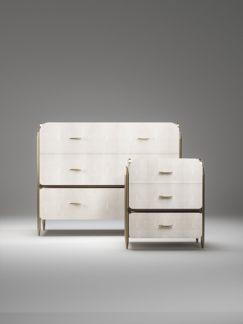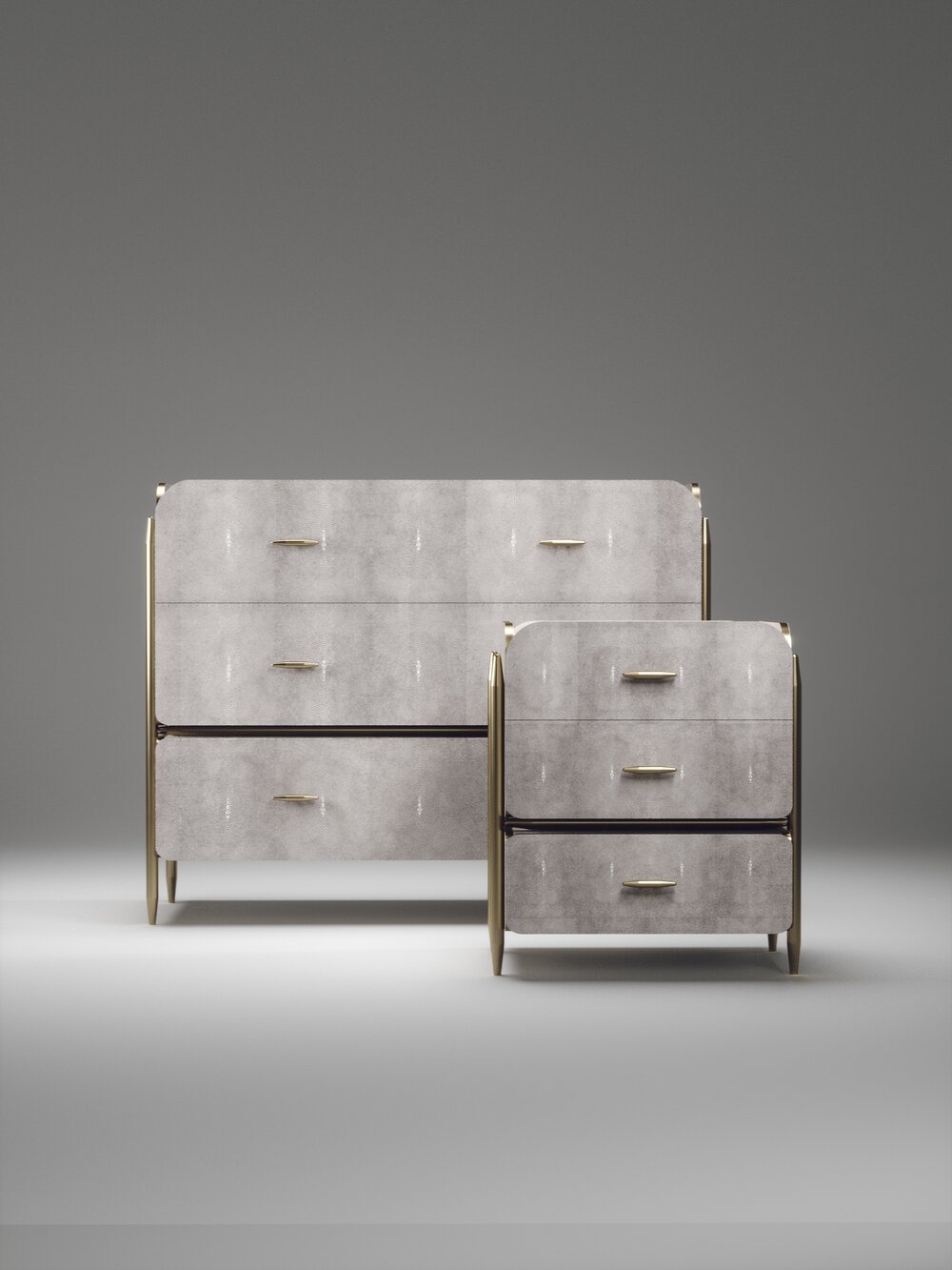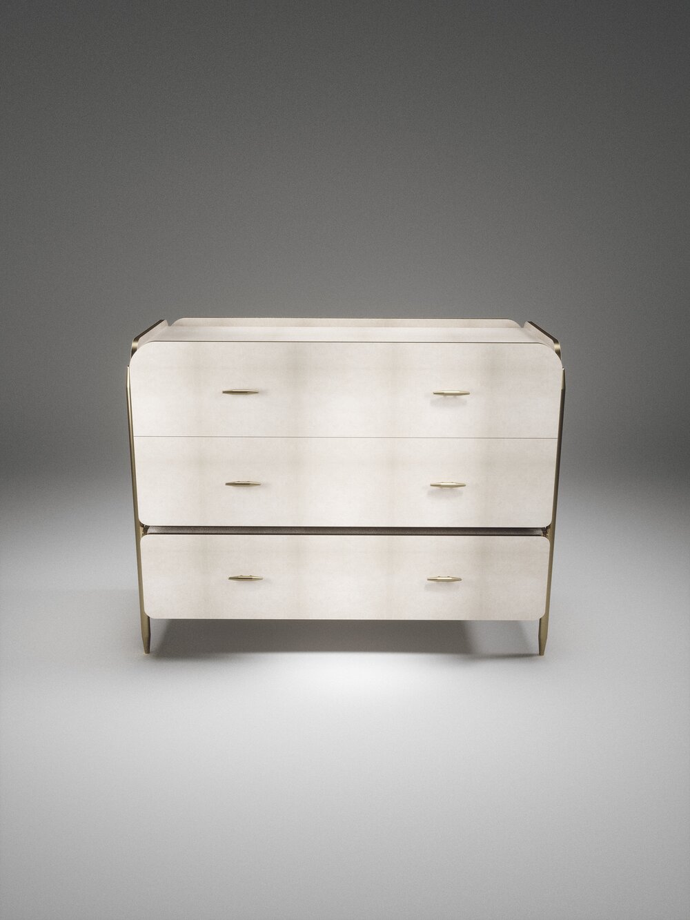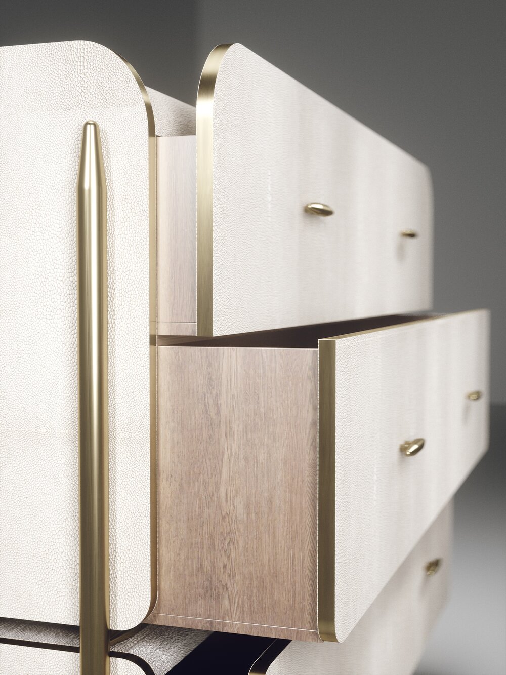 The Dandy Rectangle Chest of Drawers by Kifu Paris is an elegant and a luxurious home accent, inlaid in cream shagreen with bronze-patina brass details. This piece includes 3 drawers total and the interiors are inlaid in gemelina wood veneer. The back of the piece is inlaid in wood veneer, or in shagreen. Available in light grey and as an oval version and as a bedside table. This piece is designed by Kifu Augousti, the daughter of Ria and Yiouri Augousti.