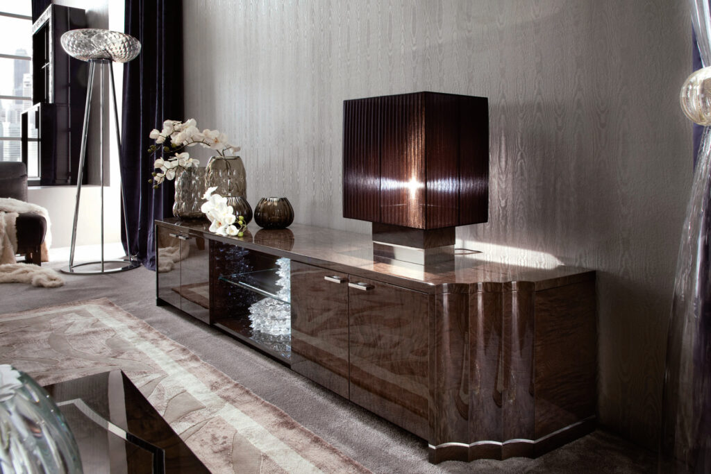 Base for T.V. unit in moka japanese tamos burl veneer in high gloss polyester. 4 doors and 1 open space w/ glass shelf with led light. Base, and handles in chrome stainless steel.