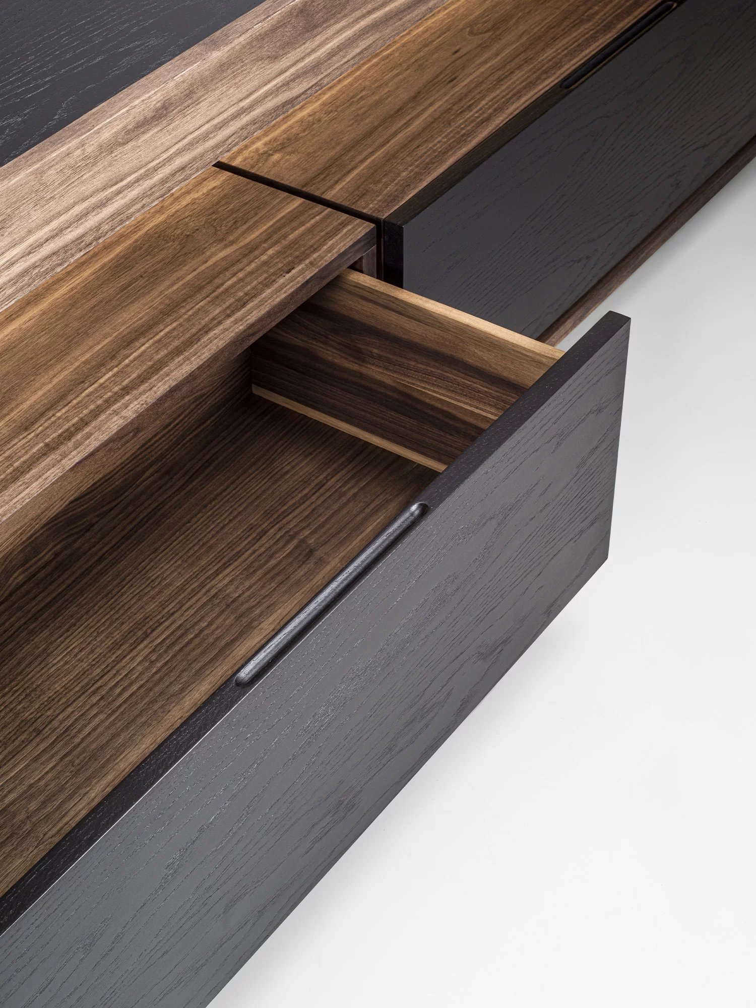 Madia in legno massello e listellare, a giorno, con cornice in legno e due cassetti assemblati con tradizionale incastro a coda di rondine. Top incassato, luci a LED a illuminare il vano a giorno.