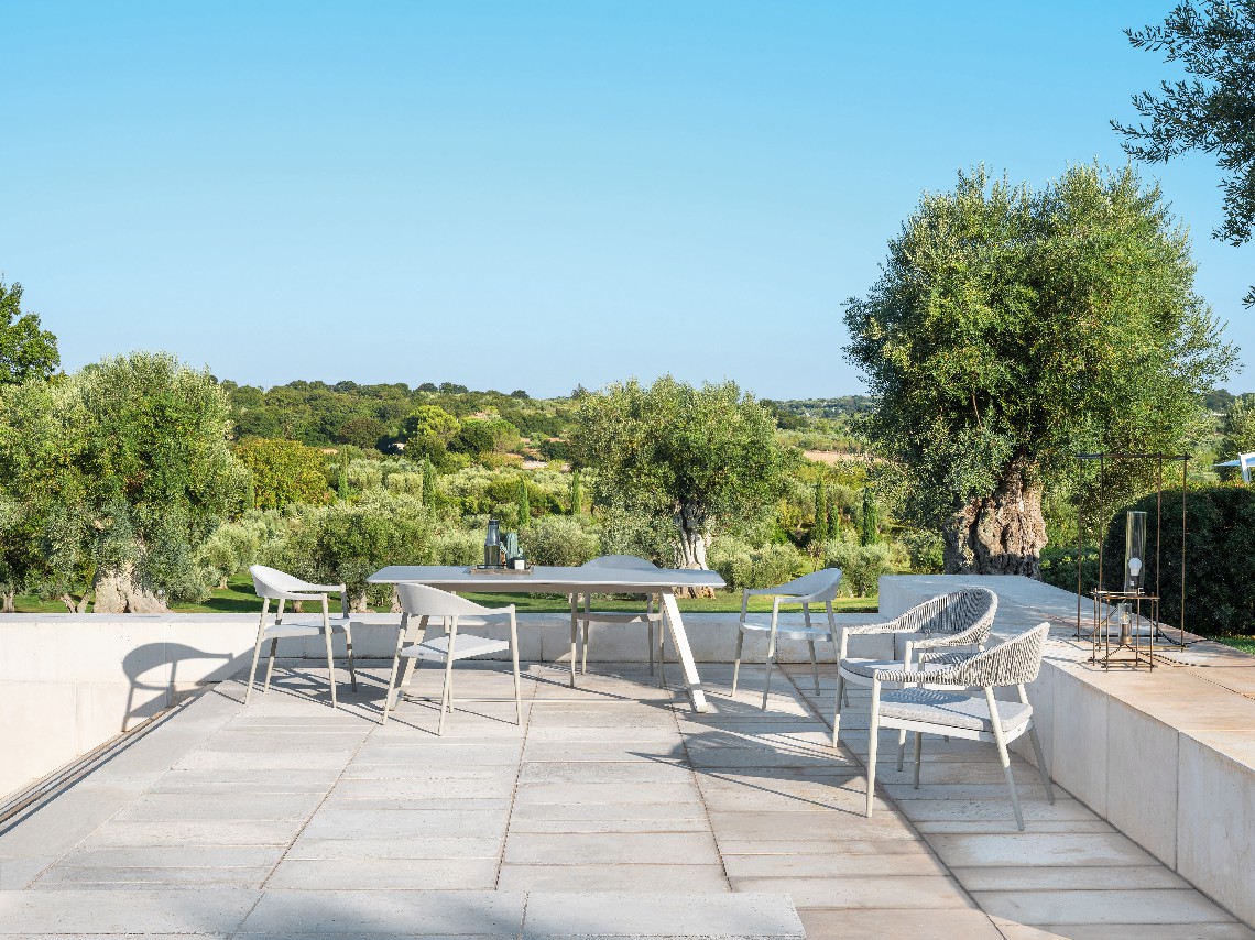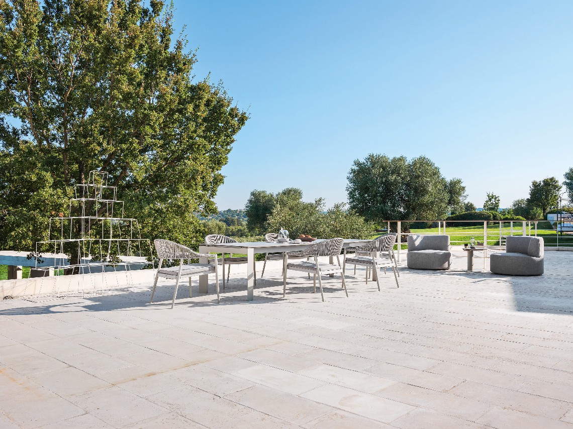 Clever lounge is perfect for enjoying an aperitif or an outdoor lunch. A spacious cushion in water-resistant acrylic fabric can be added to its spacious seat.