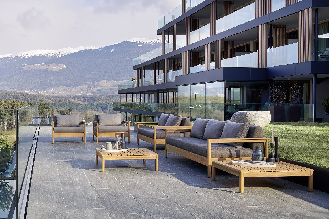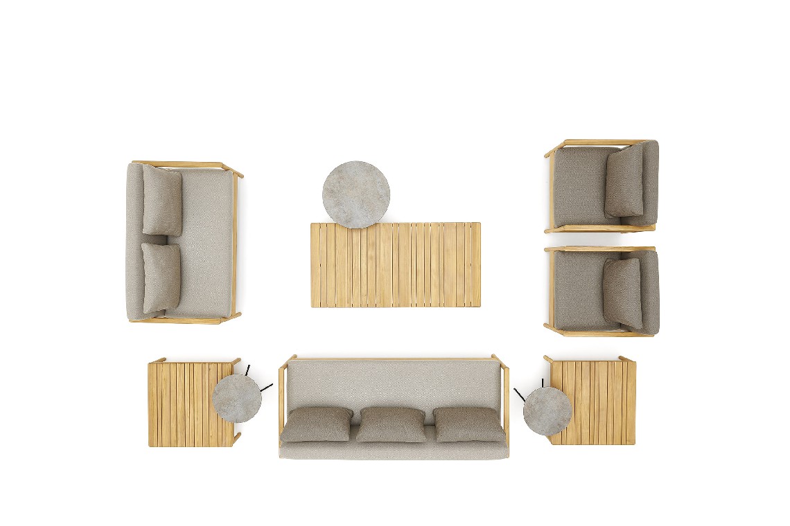 A structure with clean and regular lines in solid teak wood combines with large and soft cushions to give shape to a spacious and comfortable seat, which invites you to immerse yourself in relaxation.