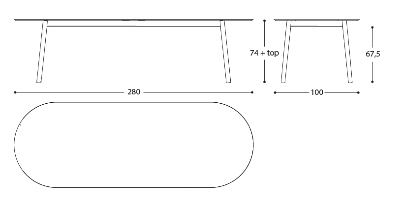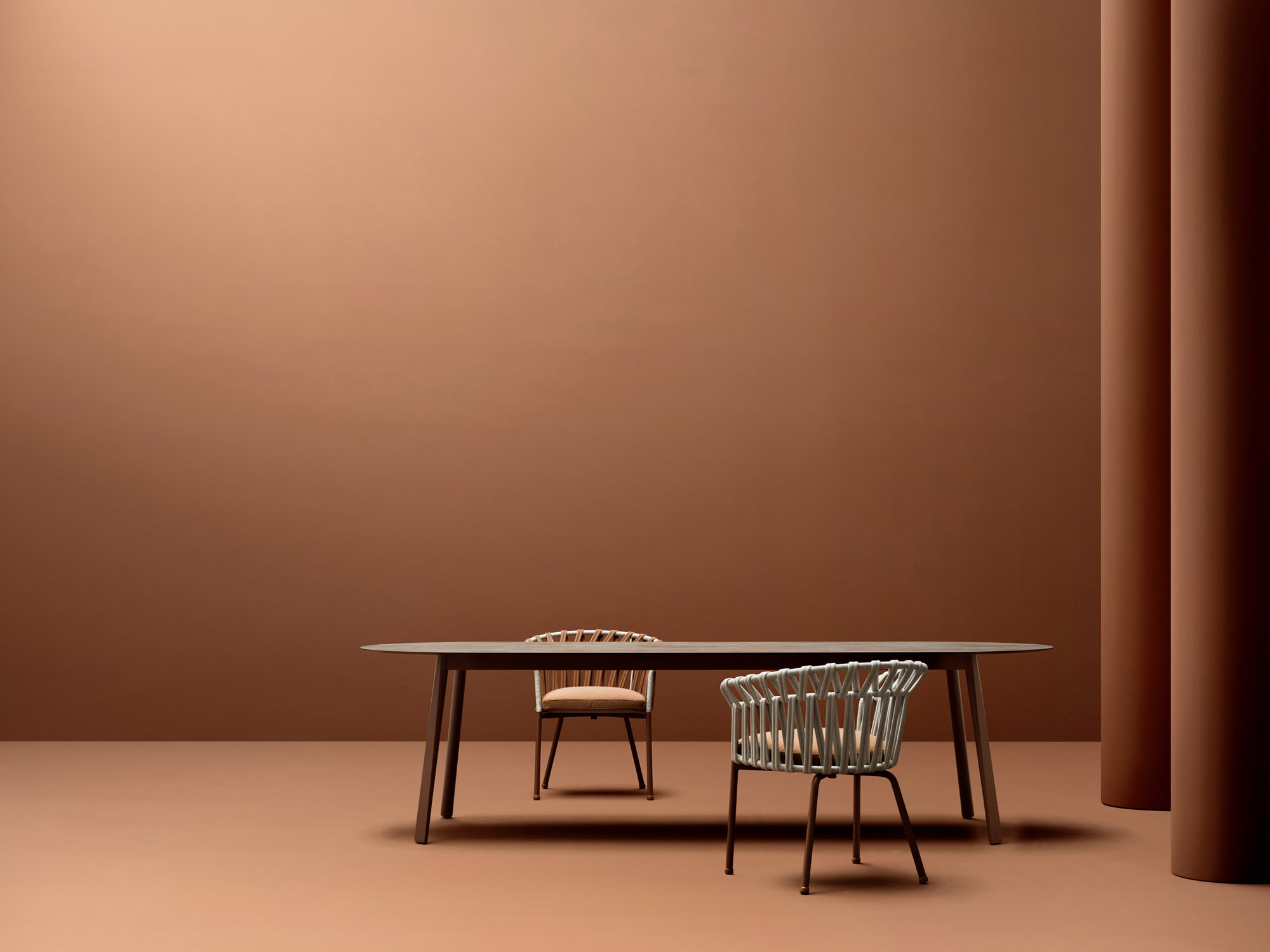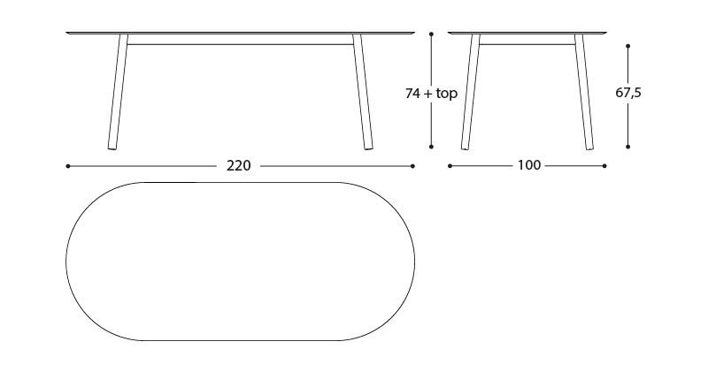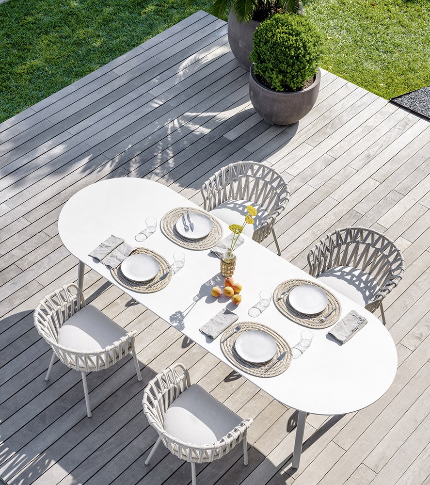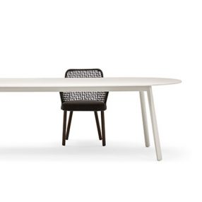 The gentle and graceful lines of the Emma collection give shape to a spacious table, designed for conviviality. The sturdy elliptical top rests on four legs with a tapered shape, a detail that makes them slender and elegant.