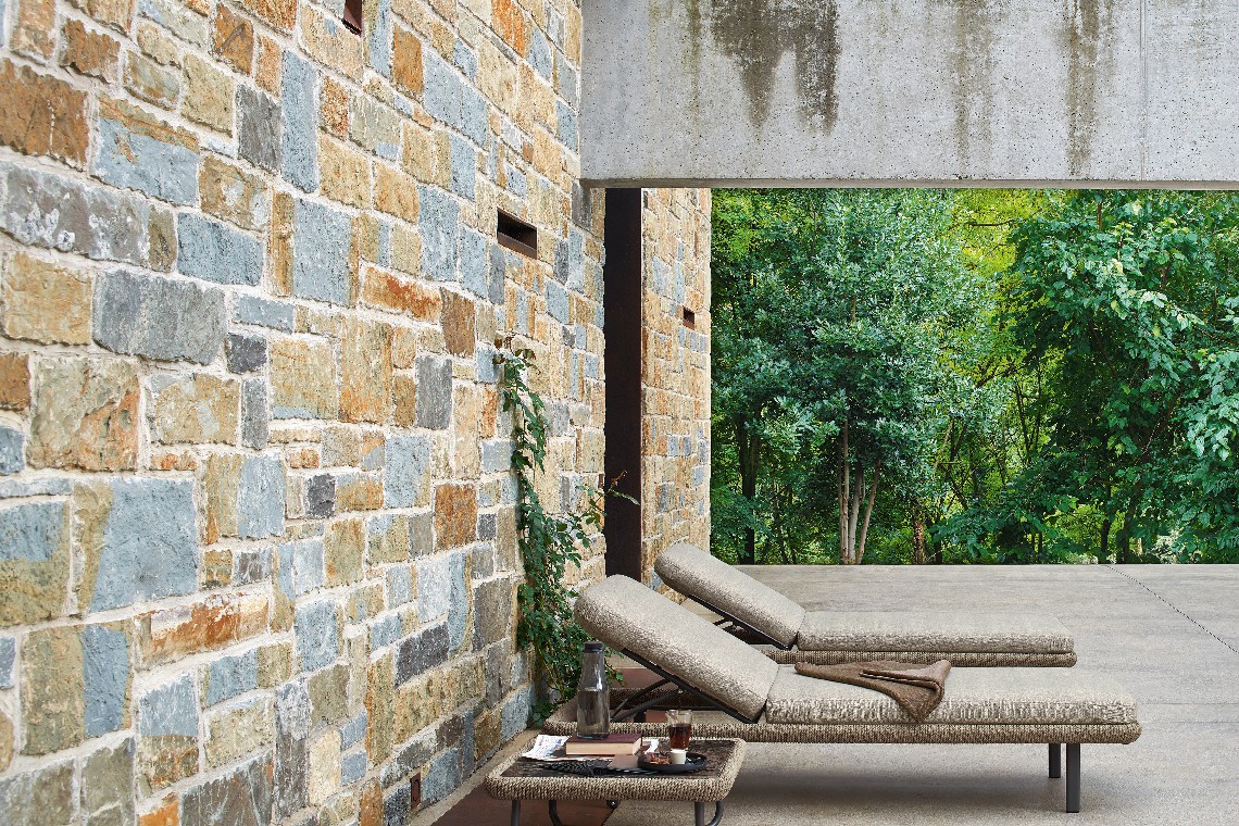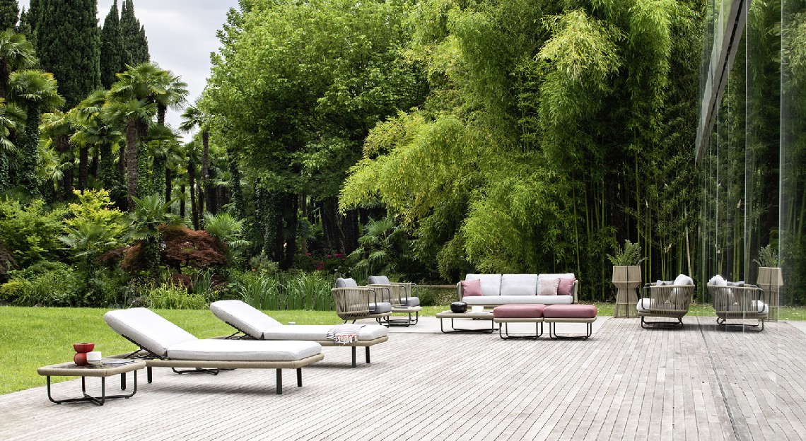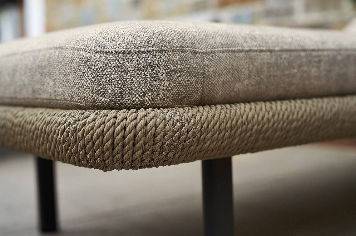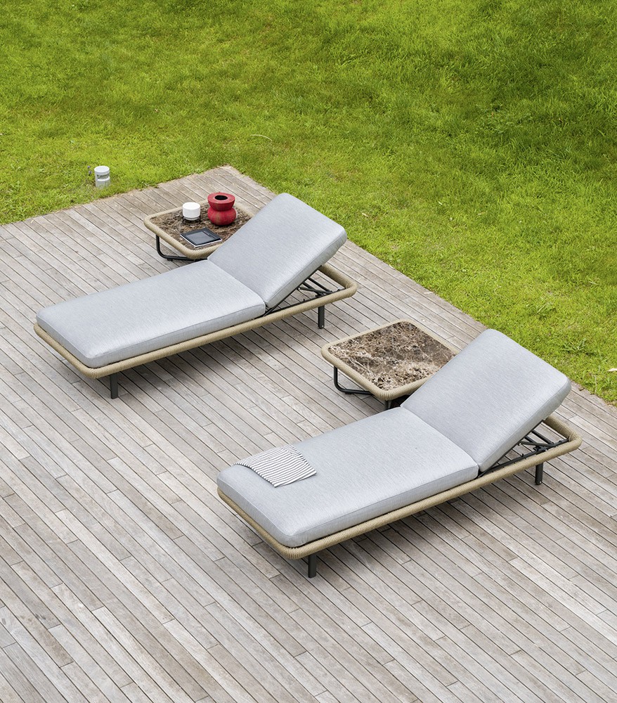Softness and comfort are the keywords for the Babylon sunbed. The padding of the backrest and seat, suitable for outdoor use even in saline fog areas, has rounded profiles that follow the perimeter of the structure, around which a synthetic fiber rope is woven. With its discreet colors inspired by nature, Babylon finds the right harmony with the surrounding environment, in the garden as on the veranda, on the terrace as by the pool.