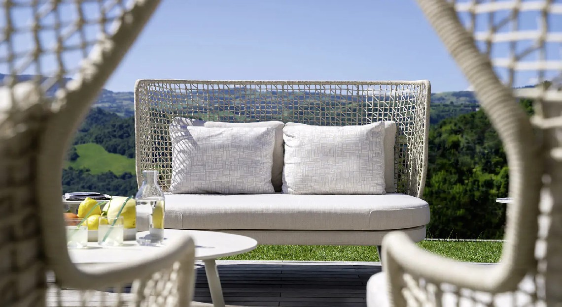 The particular weaving that characterizes the entire Emma collection finds its highest expression in the high backrest of this daybed and an unprecedented cocooning effect. With its soft and curvilinear design, it fits perfectly into any outdoor context, both residential and contract, becoming the protagonist.