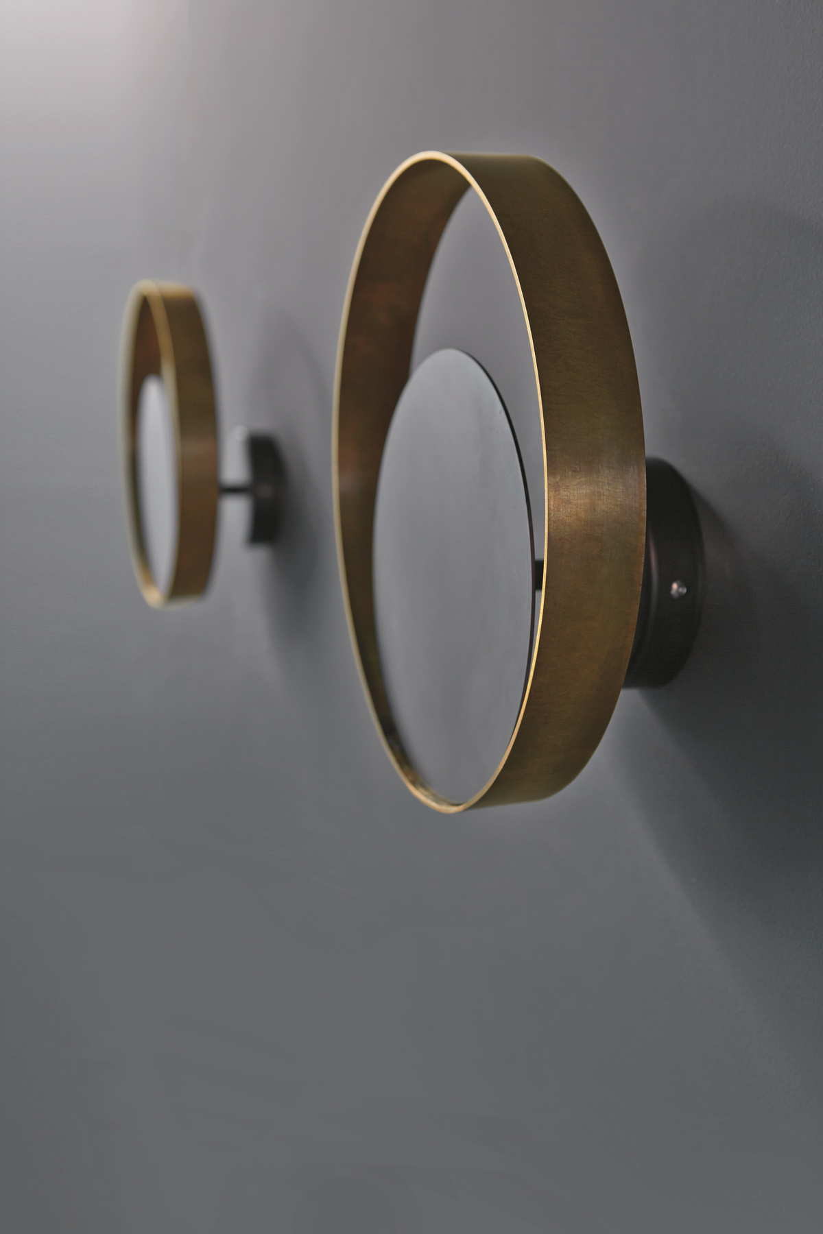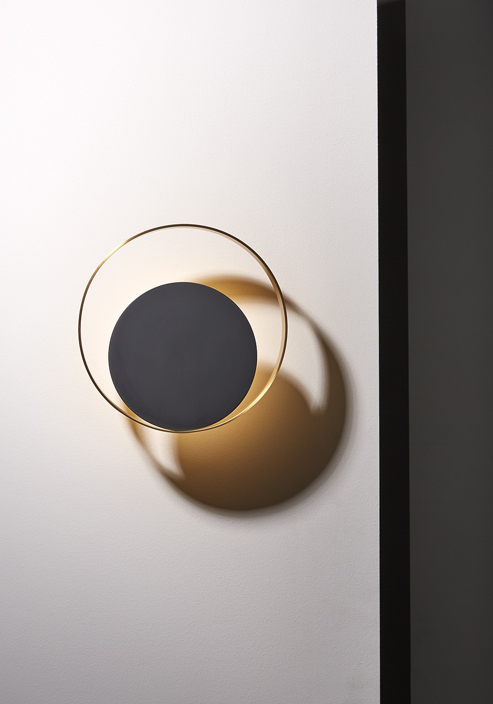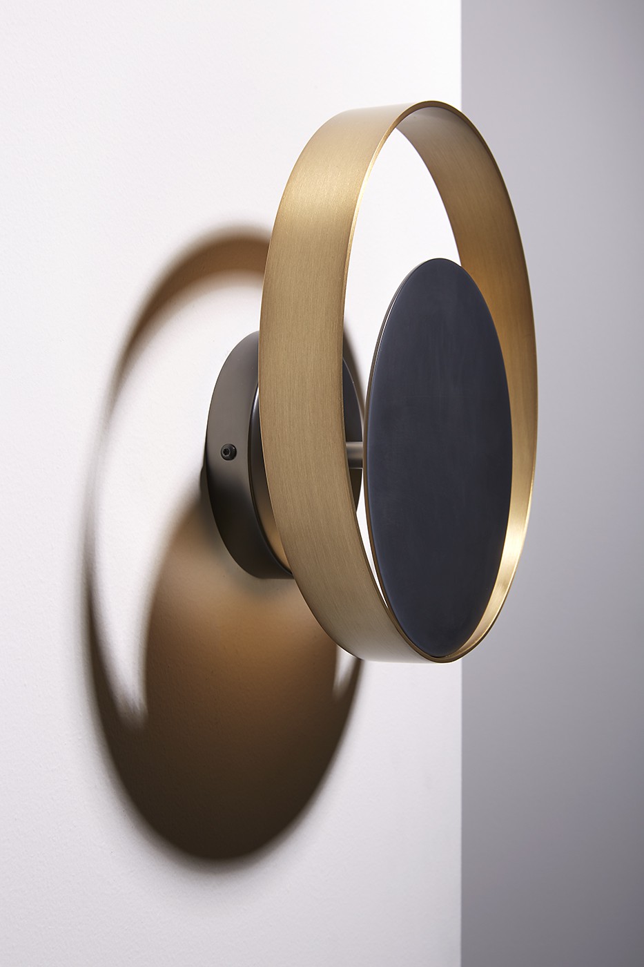 Ceiling lamp with indirect light. Light burnished brass rings and matte black nickel structure.