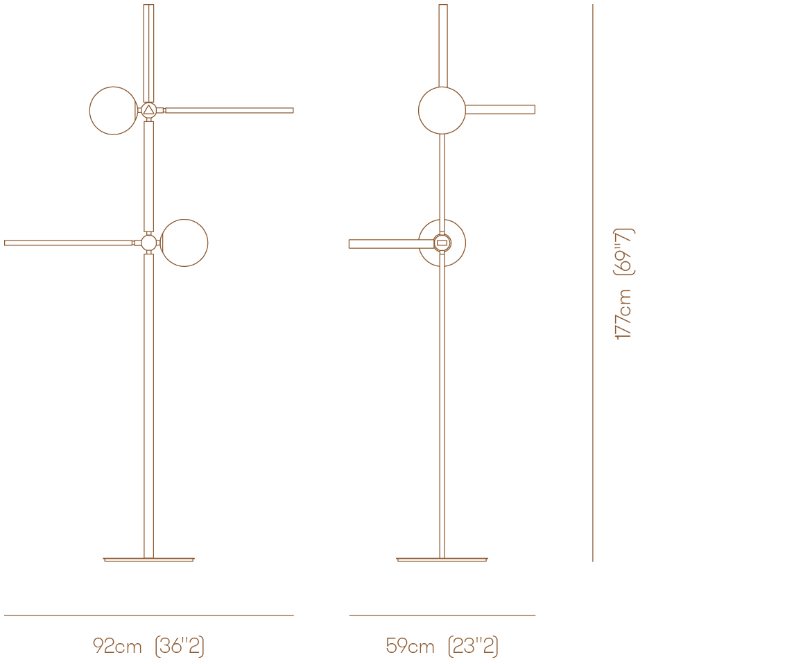 Floor lamp with diffused and direct light. Dark burnished brass structure with polished gold metal spheres or matte black nickel structure with polished black nickel metal spheres. White Murano blown glass diffusers and crystal, smoke grey or amber Murano blown glass trihedrons.