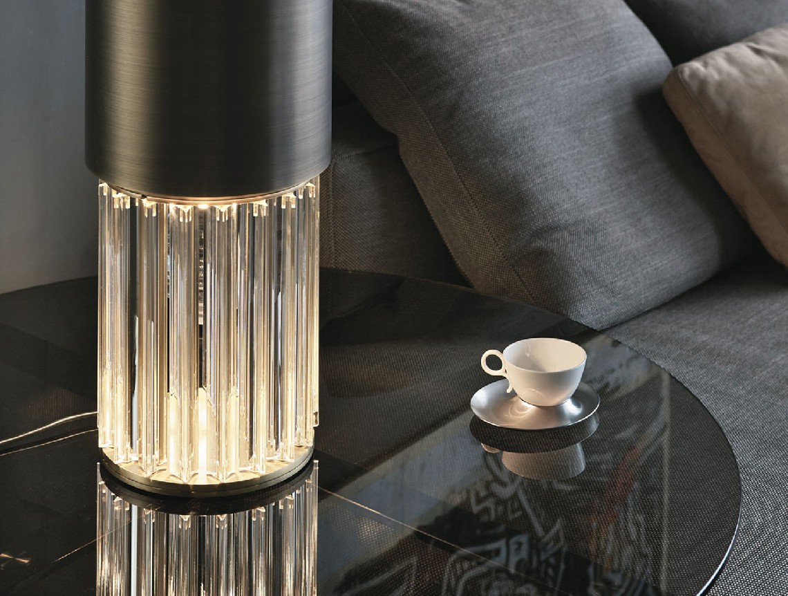 Table lamp with diffused light. Dark bronze striped structure and crystal, amber or smoke grey Murano blown glass trihedrons.