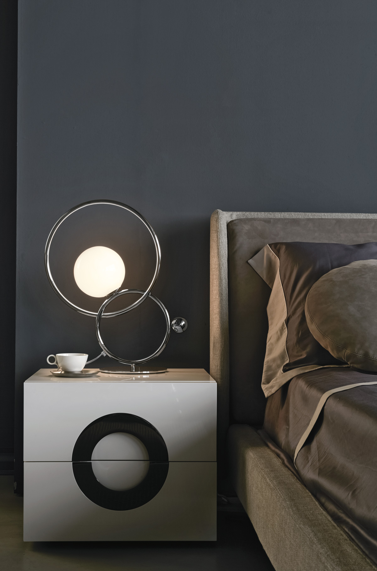 Table lamp with diffused light. Polished black nickel, polished gold, matte black nickel, polished chrome or light burnished brass structure and white Murano blown glass diffuser. Polished black nickel, polished gold or polished chrome metal sphere.