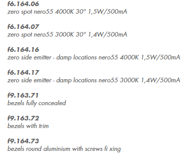recessed light fitting for indoor and outdoor use. it consists of a diameter 25mm/1’’ h.35mm/1.4’’ oxidised aluminium cylindrical body and round bezels with rebate or totally concealed. versions: zero spot is available wet location rated with 11° 18°43° optics or 9°x48° elliptical interchangeable optics, zero side emitter damp location rated with diffused light. wired with 3000K or 4000K led source up to 1.5W 121lm. accessories: recessed brick housings, fixing ring nut and springs. finishes: nero55 fitting, matt silver and satin polymethyl methacrylate bezels.