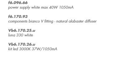 damp location rated recessed light fitting for indoor use. powder coated steel with natural alabaster made diffuser. versions: luna 330 with diameter ?324mm/12.7’’ diffuser. wired with 3000K Ra90 37W 3600lm led source. 120V 50-60Hz power supply not included, to be order separately. finishes: bianco V fitting, natural alabaster diffuser.