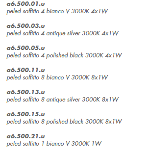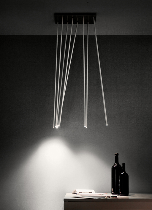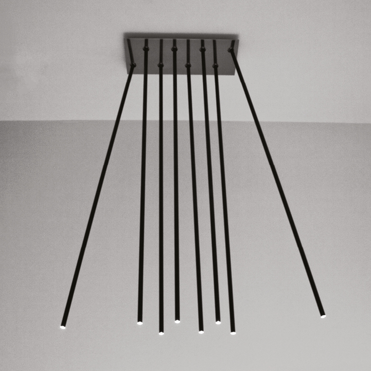 dry location rated ceiling light fitting for indoor use. made of extruded aluminium rods with a diameter 14mm/0.5’’ 1200mm/47.2’’ connected to a 170x170x40mm/6.7x6.7x1.6’’ steel support plate with a spherical joint that allows an inclination up to 30° on the vertical axis. versions: peled soffitto with 1 rod, peled soffitto with 4 rods, peled soffitto with 8 rods. wired with 3000K Ra98 1W led source. 120V 50-60Hz power supply included. accessories: joint, front plate for 1, 4, 8 and 16 rods. finishes: bianco V, polished black and polished stainless steel plate, aluminium rods painted in polished black