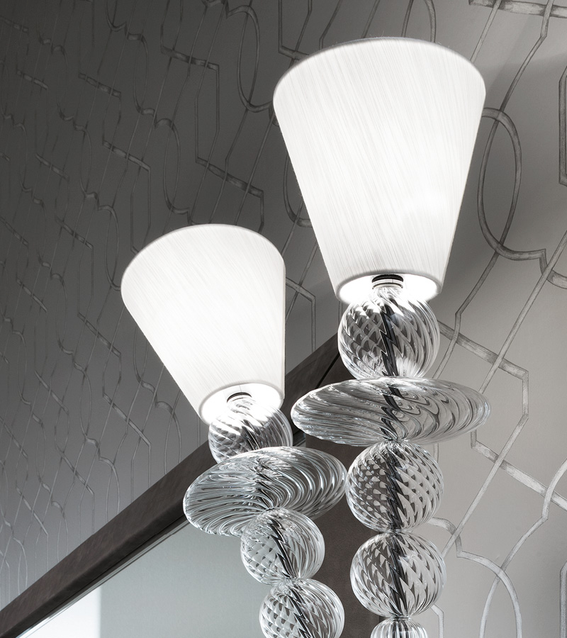Venetian "Murano" blown clear glass wall light. 2 "Murano" blown clear glass arms with 2 E14 lights inserted in a black nickel steel.