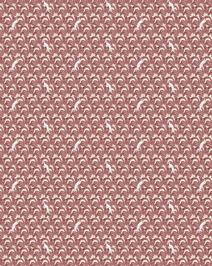 Wallpaper featuring an animal motif on a graphic background of leaves of the rainforest and birds of Paradise. It is available in three colours.