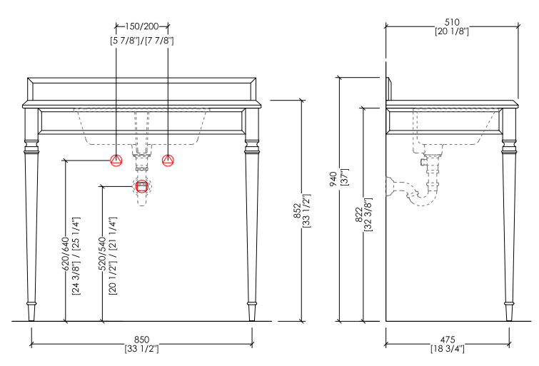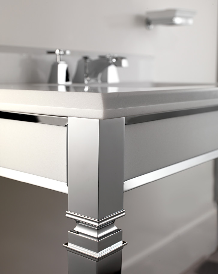 It is a small console with a linear design, whose truncated pyramid legs, inspired by Art Deco, make this piece exclusive. The ceramic basin rests on a marble top. Its legs are in aluminium and the frames are made of brass, with chrome, light gold or polished nickel finishes.