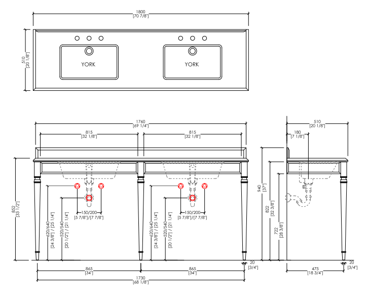 A console for double sink with linear design whose truncated pyramid legs, inspired by Art Deco, make this piece exclusive. The marble top, with veils, available in white Carrara, white Sivec, Black Marquinha marble or absolute black granite contains two large ceramic basins. Its legs are in aluminium and the frames are made of brass, with chrome, light gold or polished nickel finishes.