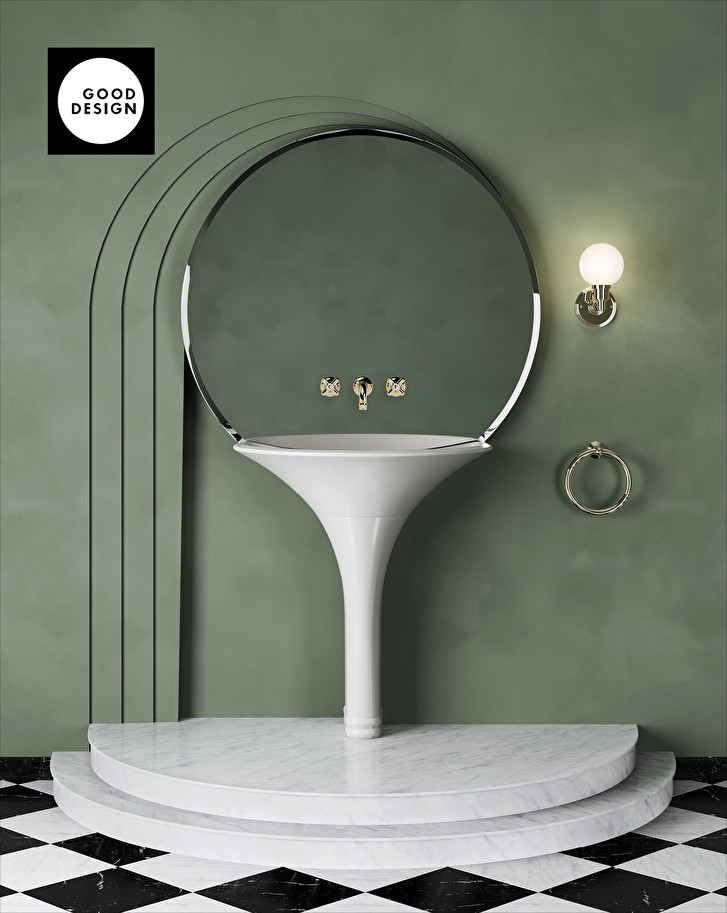 The washbasin designed by Massimo Iosa Ghini, being the result of Devon&Devon's collaboration with this prominent figure in contemporary architecture, reinterprets sophisticated retro inspirations in a contemporary twist. The design, with its soft and sinuous lines, refers to the organic shapes of a flower corolla. A large circular mirror hangs naturally over the basin.The Kalos body is made entirely in White Tec, a mixture created and processed exclusively for Devon&Devon, which guarantees excellent impact and mark strength, and complies with the highest standards in terms of quality and sustainability.