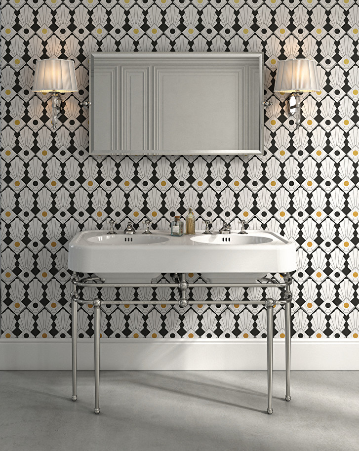 Memphis, a large console characterized by a double sink unit, is inspired by the lively urban atmosphere of the early American twentieth-century. The single ceramic piece contains two large oval basins. The bearing structure consists of tubular turned brass elements, available in chrome, light gold, polished or white nickel finishes.