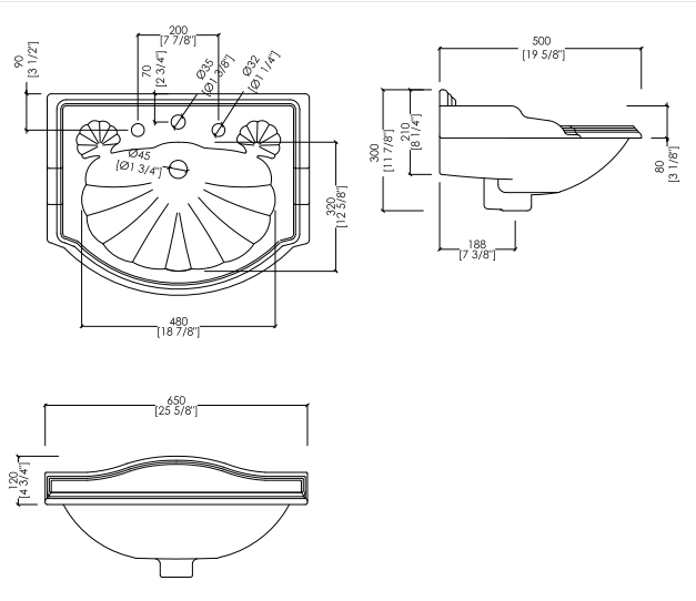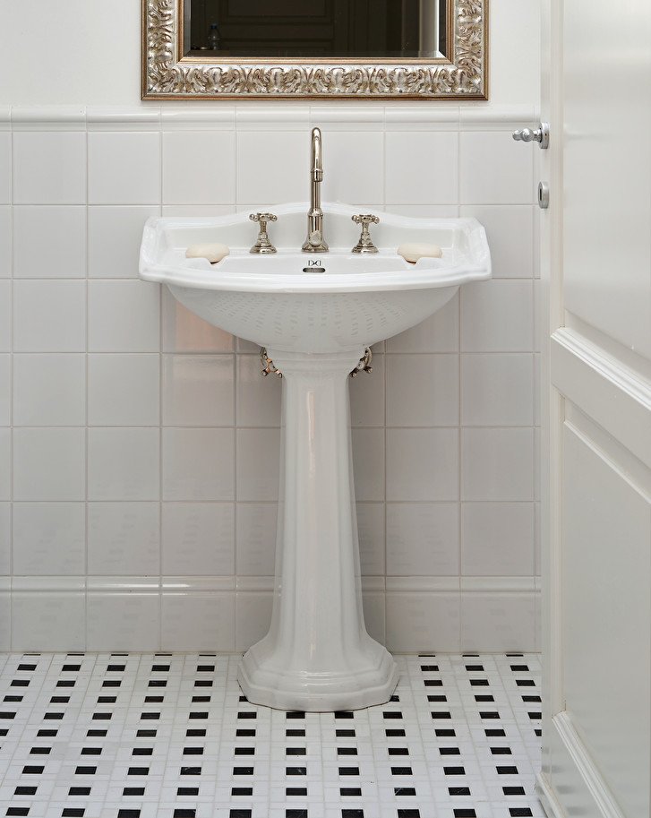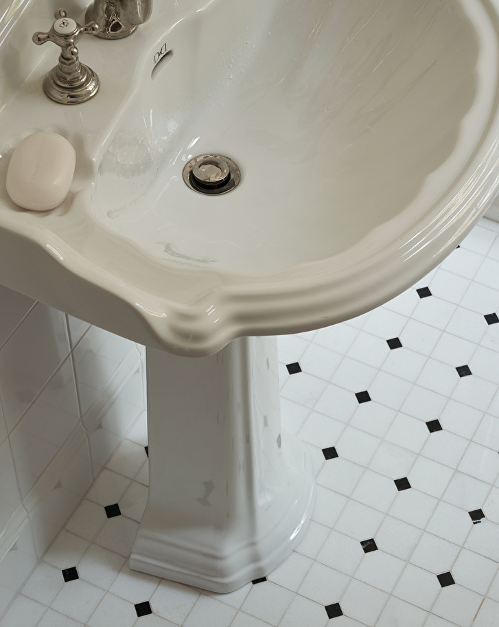 A washbasin with pedestal in fine white porcelain, available with 1, 2 or 3 holes. With a distinctly classic taste, it is characterized by soft sinuosity and decorations that recall the organic shapes of a shell.